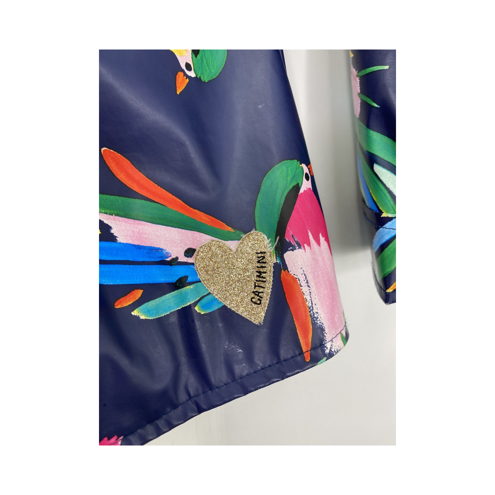 "granatowa kurtka przeciwdeszczowa w kolorowe motywy ptaków, zapinana na suwak i zatrzaski, z kapturem, rozmiar 5"