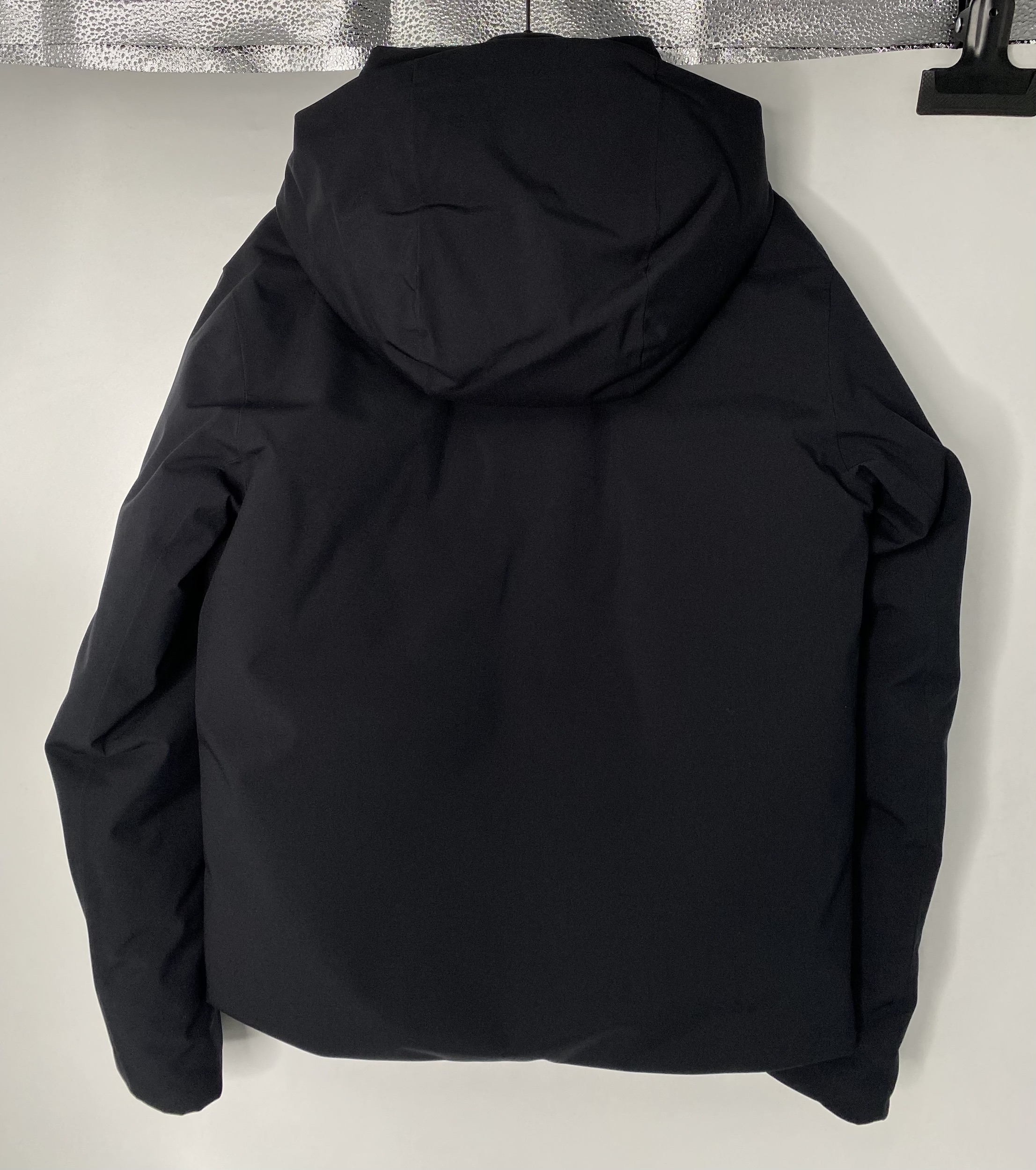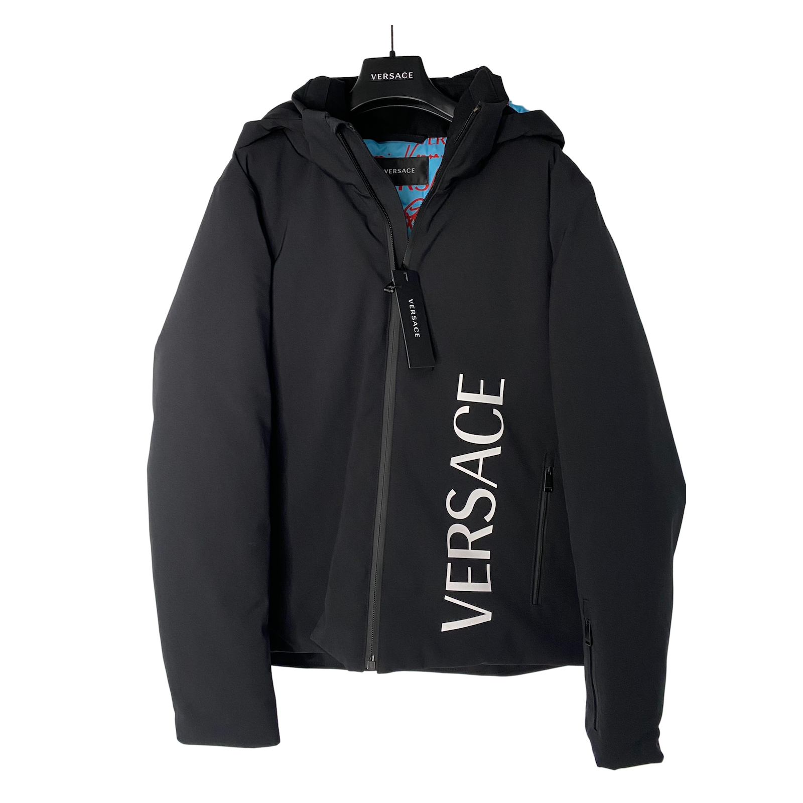 "czarna matowa kurtka z białym napisem Versace na przodzie z lewej strony, środek kurtki niebieski w czerwone napisy. Rozmiar 152 cm. 12A. Nowa z metkami i pokrowcem."