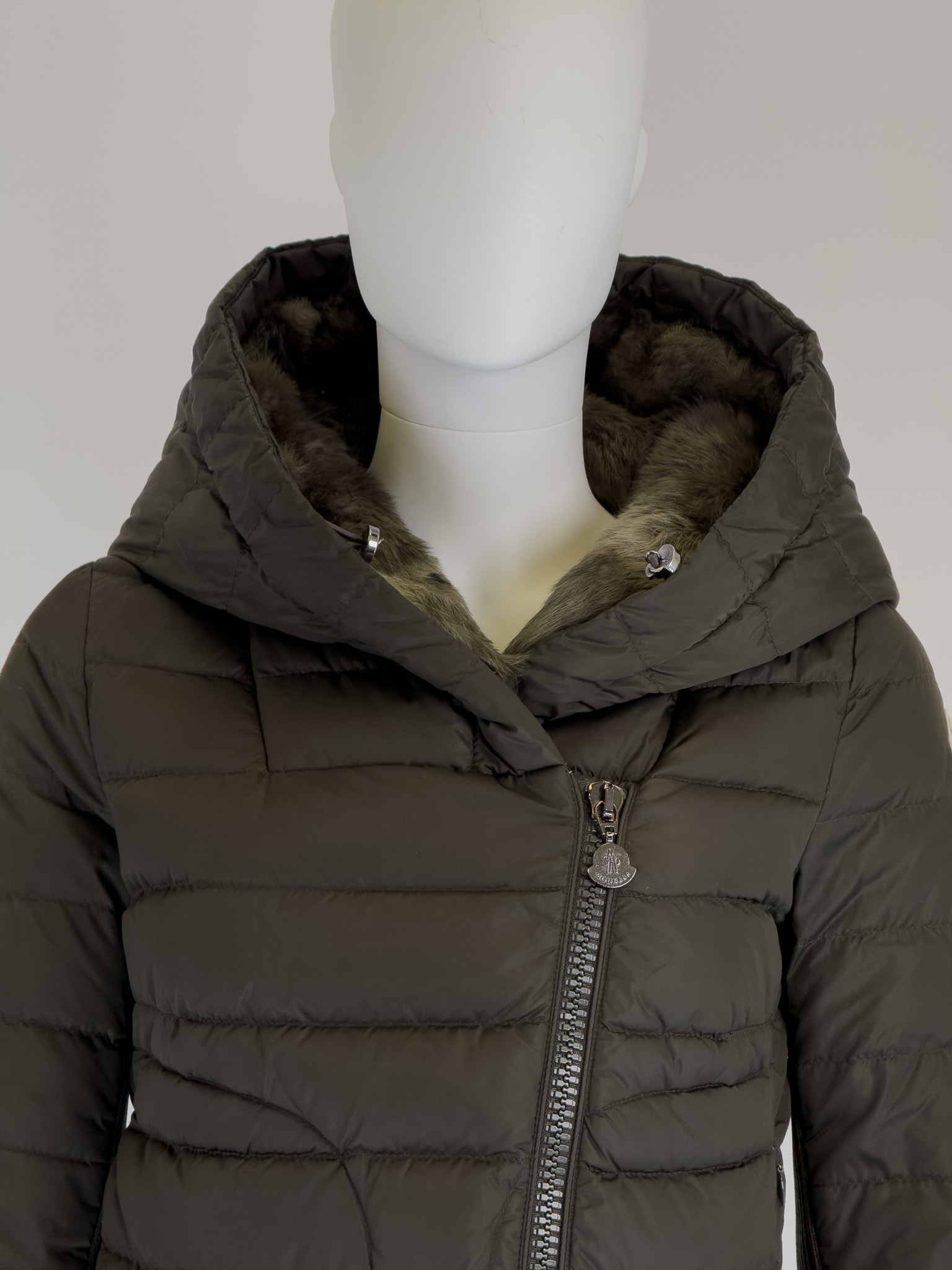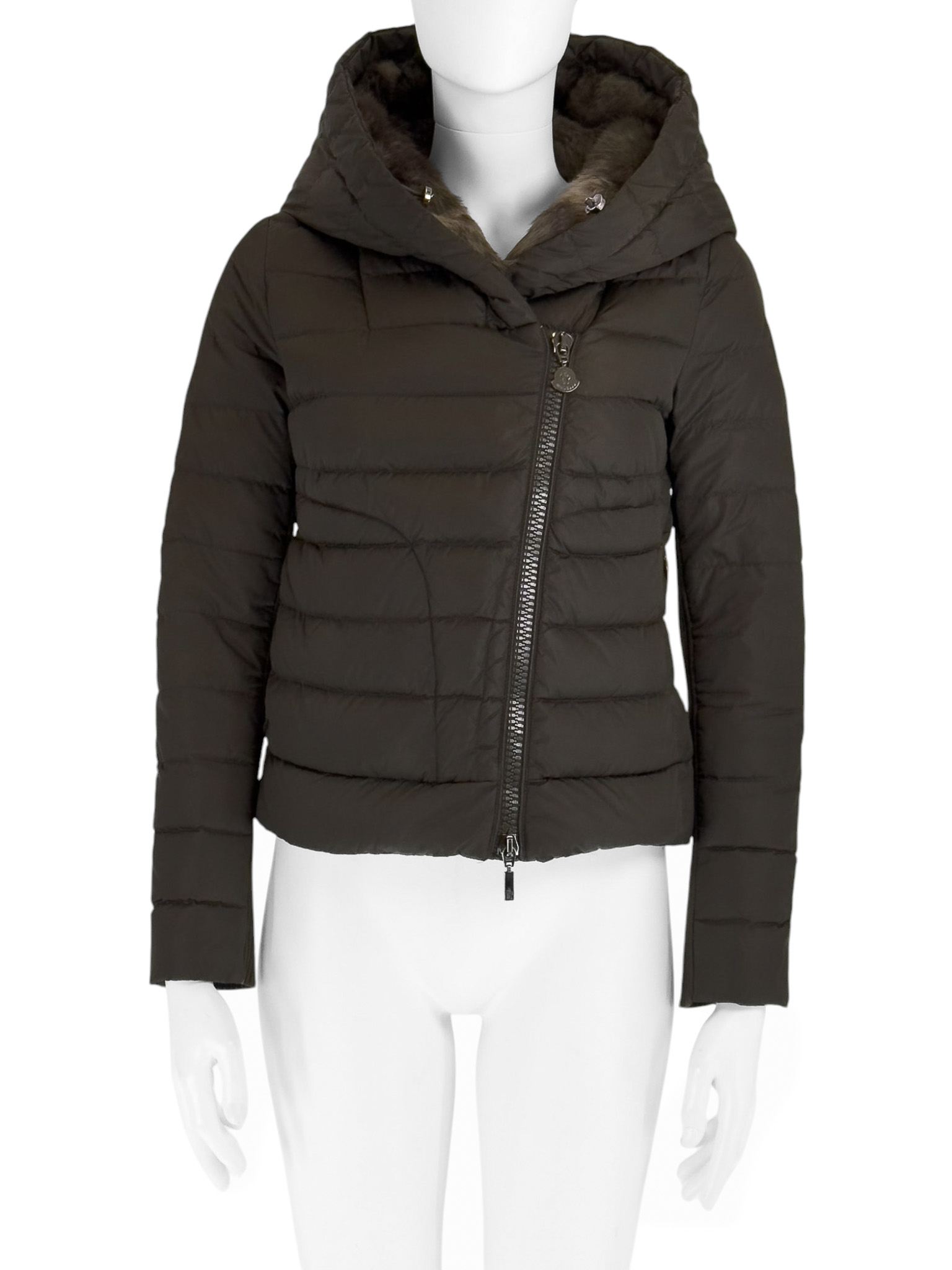 "Kurtka puchowa w brązowym kolorze z poświatą zielonego, krótka, regulowany kaptur wykończony futrem, zapinana na dwa logowane suwak oraz zatrzask, rękawy wykończone dzianinowymi wstawkami, dwie zasuwane kieszenie po bokach, biała naszywka z logo marki na rękawie. Rozmiar z metki 1. Skład: 100% poliamid; wypełnienie: 90% puch, 10% pióra. Wymiary: szerokość mierzona od pachy do pachy 45,5cm, długość całkowita 49cm."