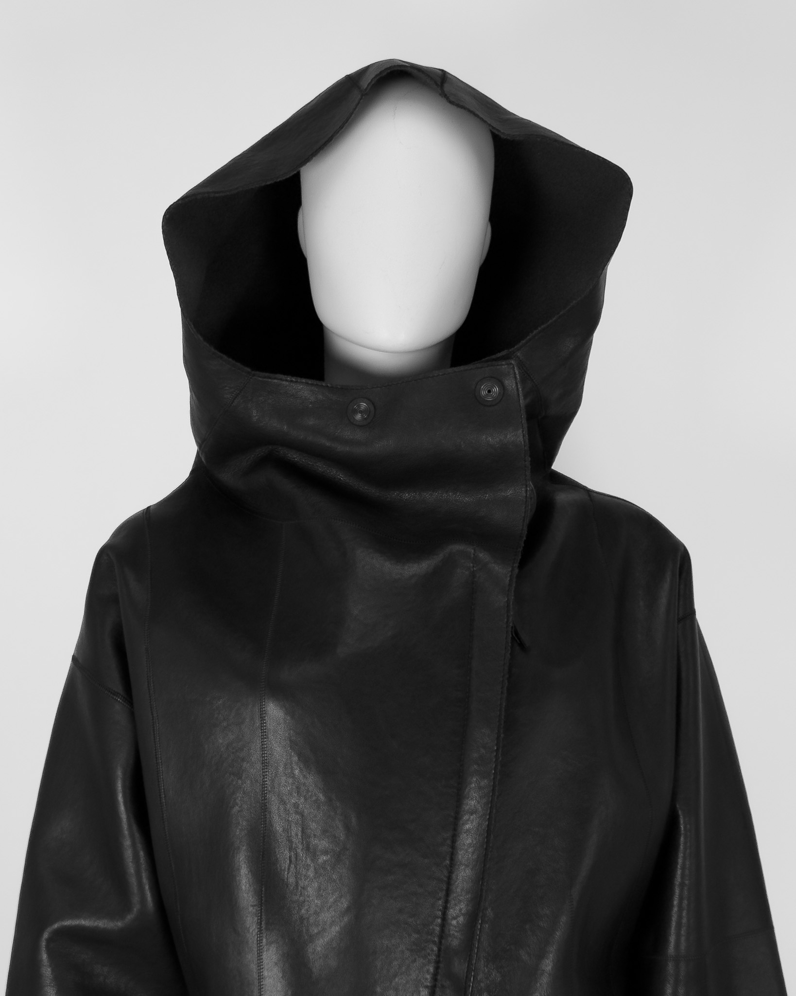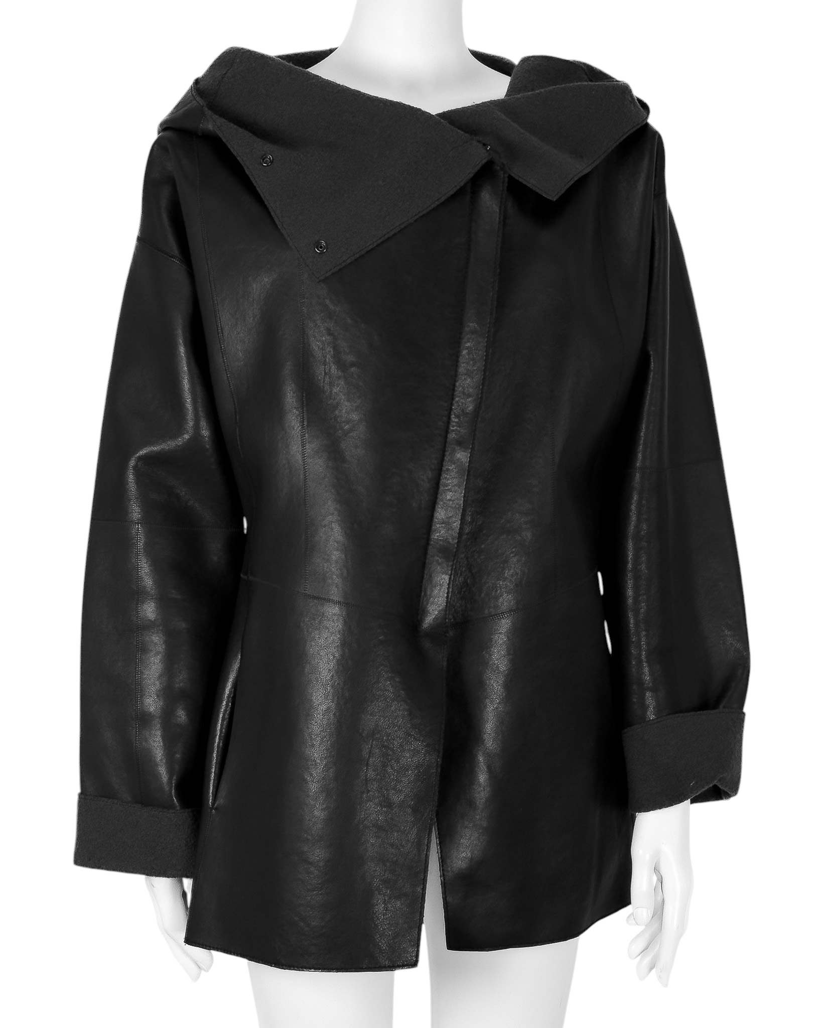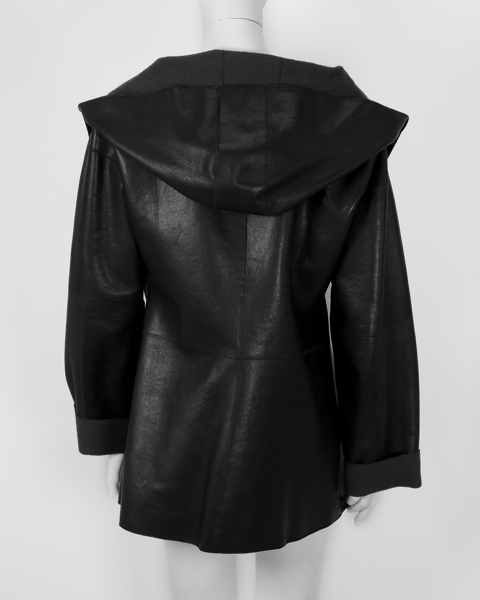 "Dłuższa kurtka skórzana w stylu oversize z kapturem, ma charakterystyczny dla tego modelu suwak po skosie wzdłuż frontu, wysoki kołnierz zapinany na dwa guziki, wykończona przeszyciami ora grafitową podszewką, dwie kryte kieszenie po bokach. Stan bardzo dobry. Rozmiar z metki 42. Skład 100 % skóra. Wymiary: szerokość mierzona od pachy do pachy 59cm, długość całkowita 78cm."