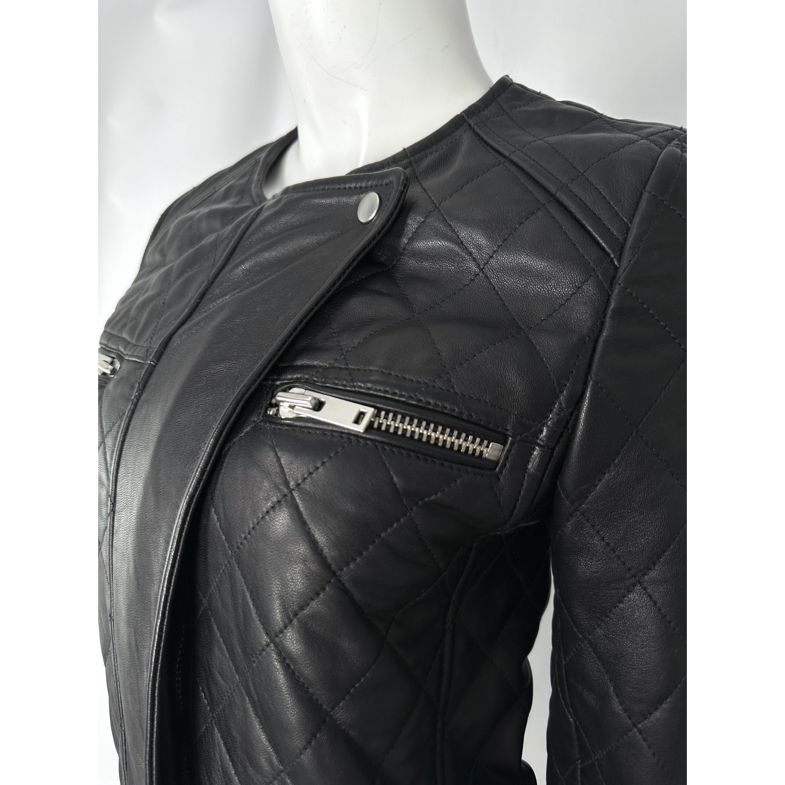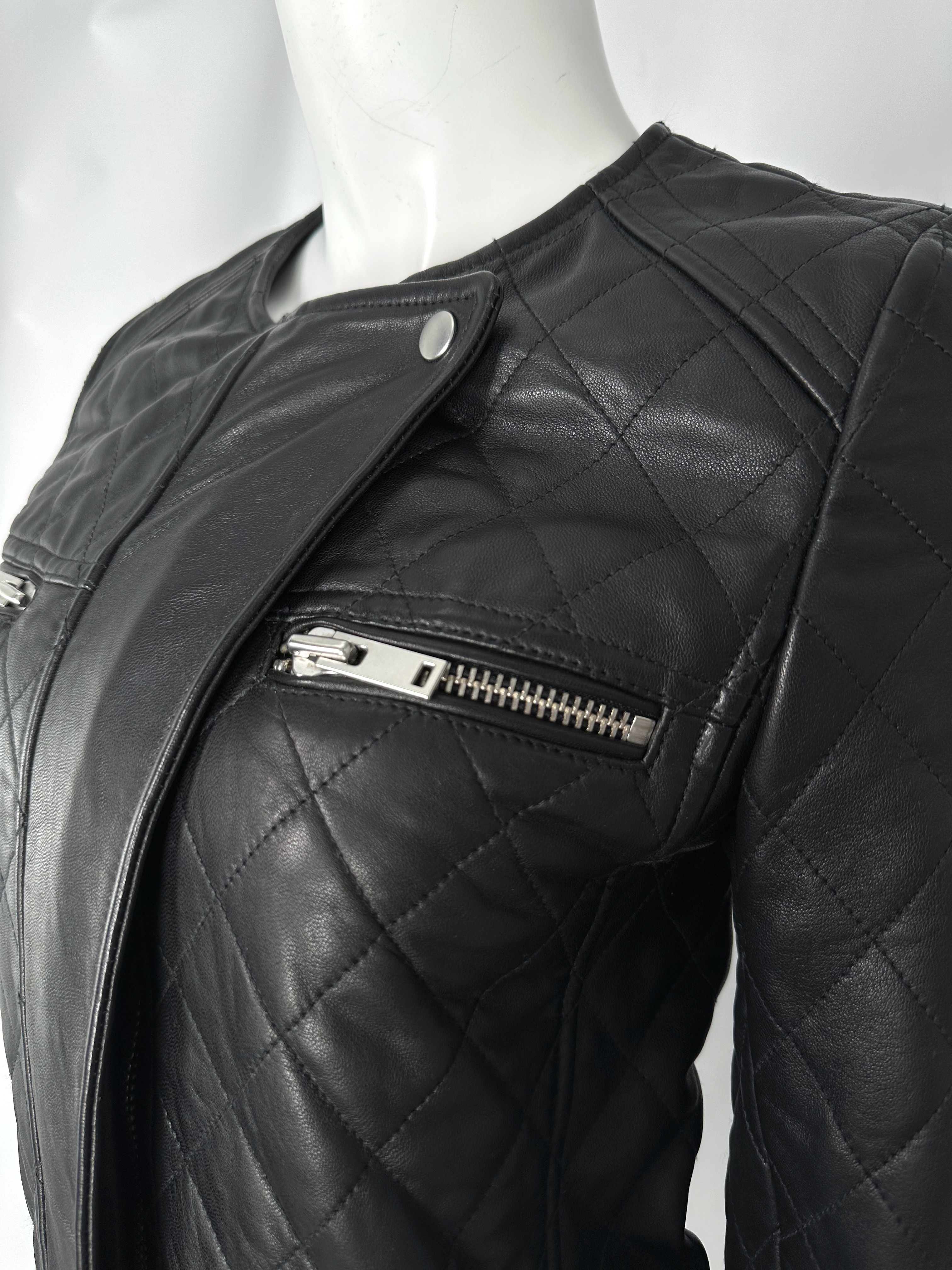 "Czarna kurtka skórzana, pikowana, srebrne suwaki, cztery kieszenie, bawełniana podszewka. Stan nowa z metką. Rozmiar z metki 34. Skład: 100% skóra jagnięca; podszewka: 100% bawełna. Wymiary: szerokość mierzona od pachy do pachy 42cm, długość całkowita 60cm, dlugość rękawa 61cm."