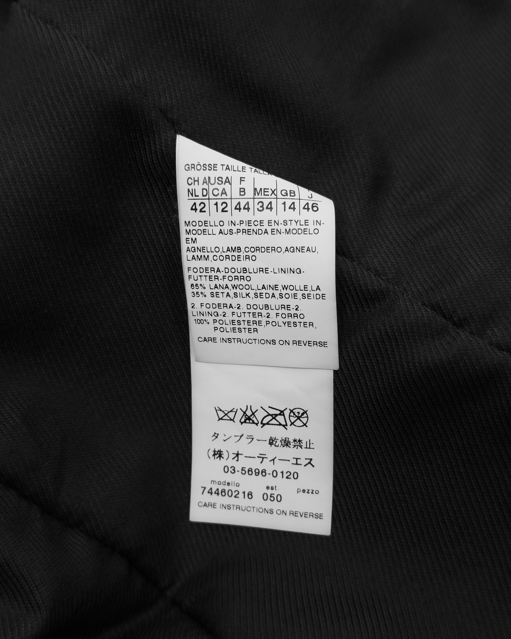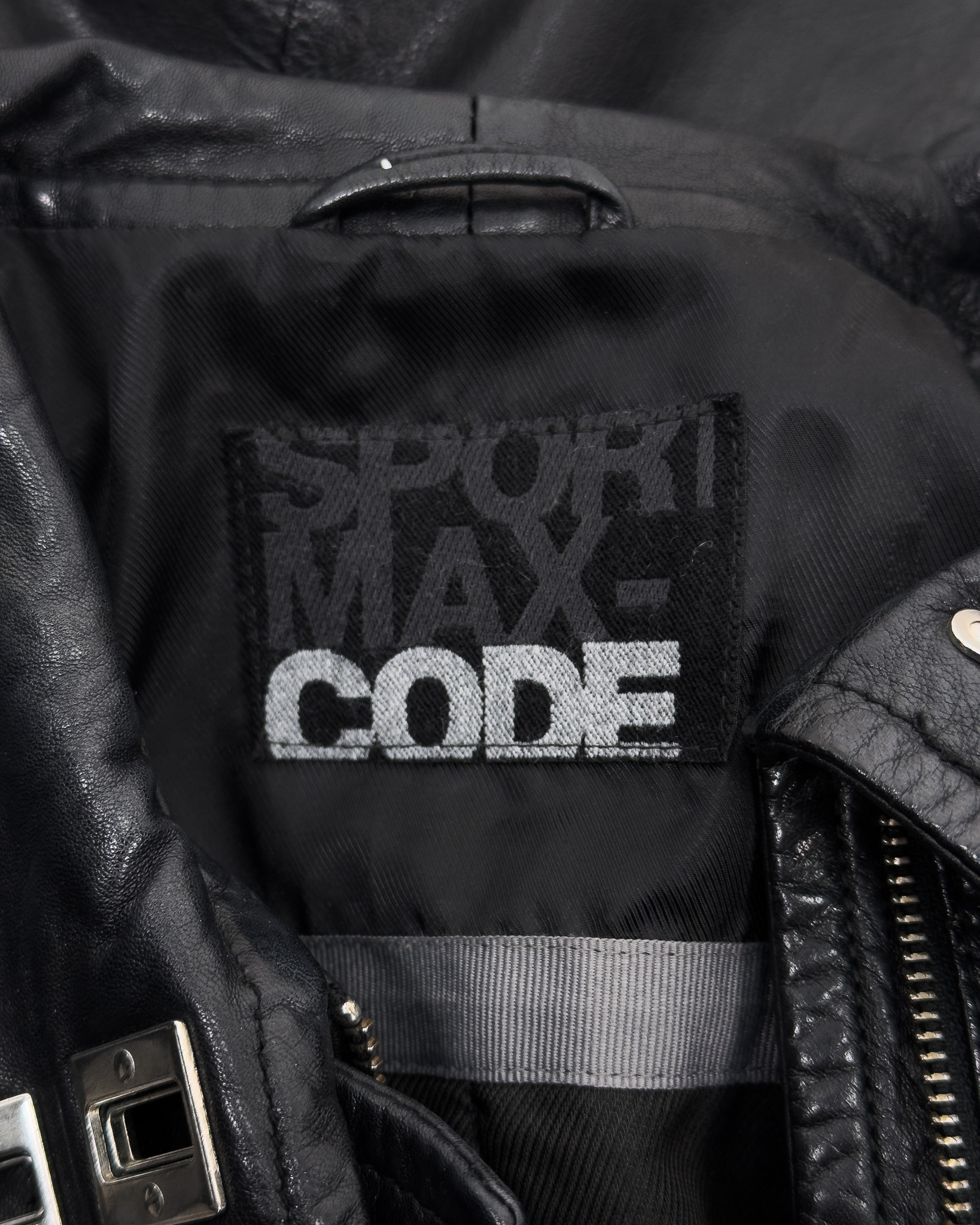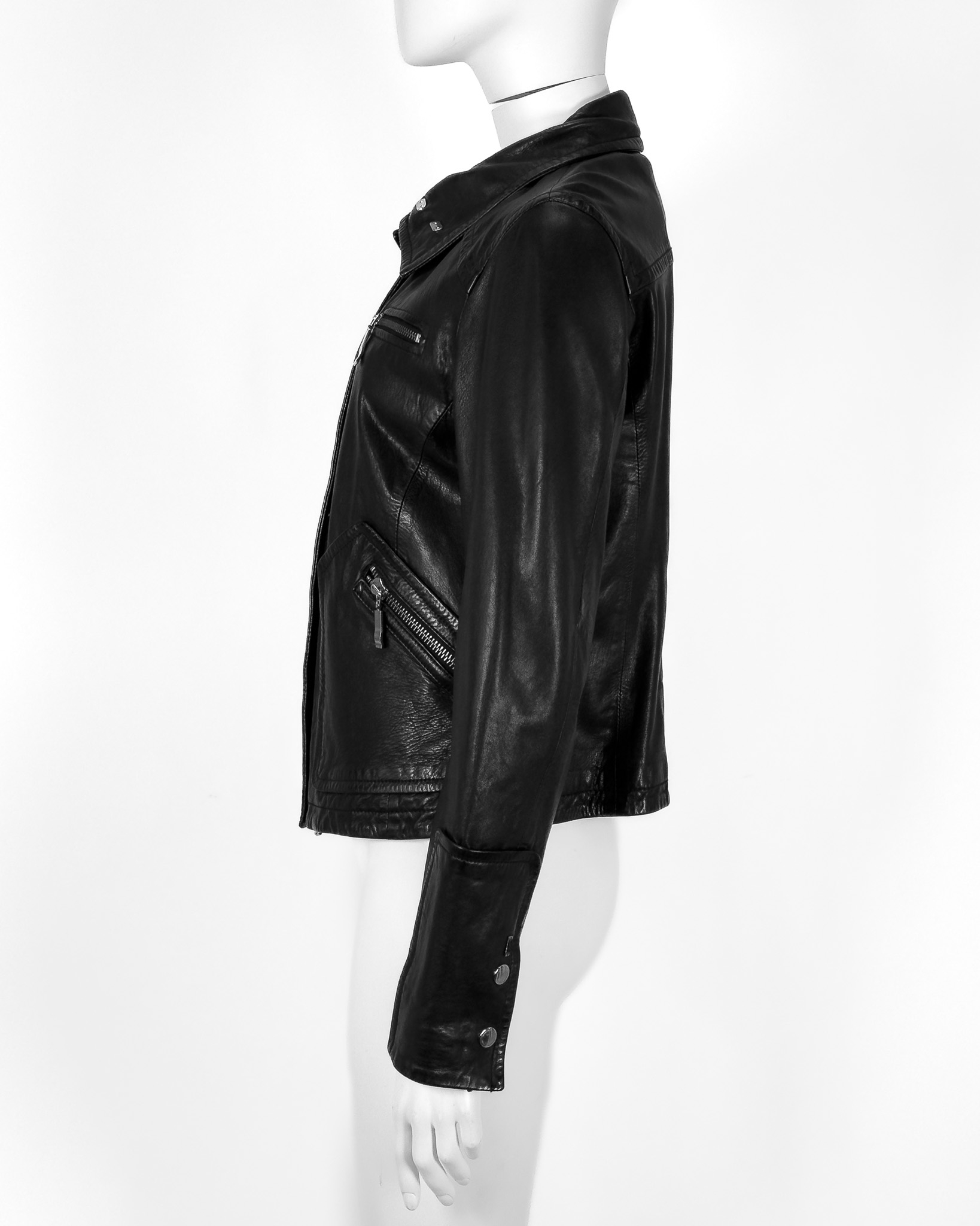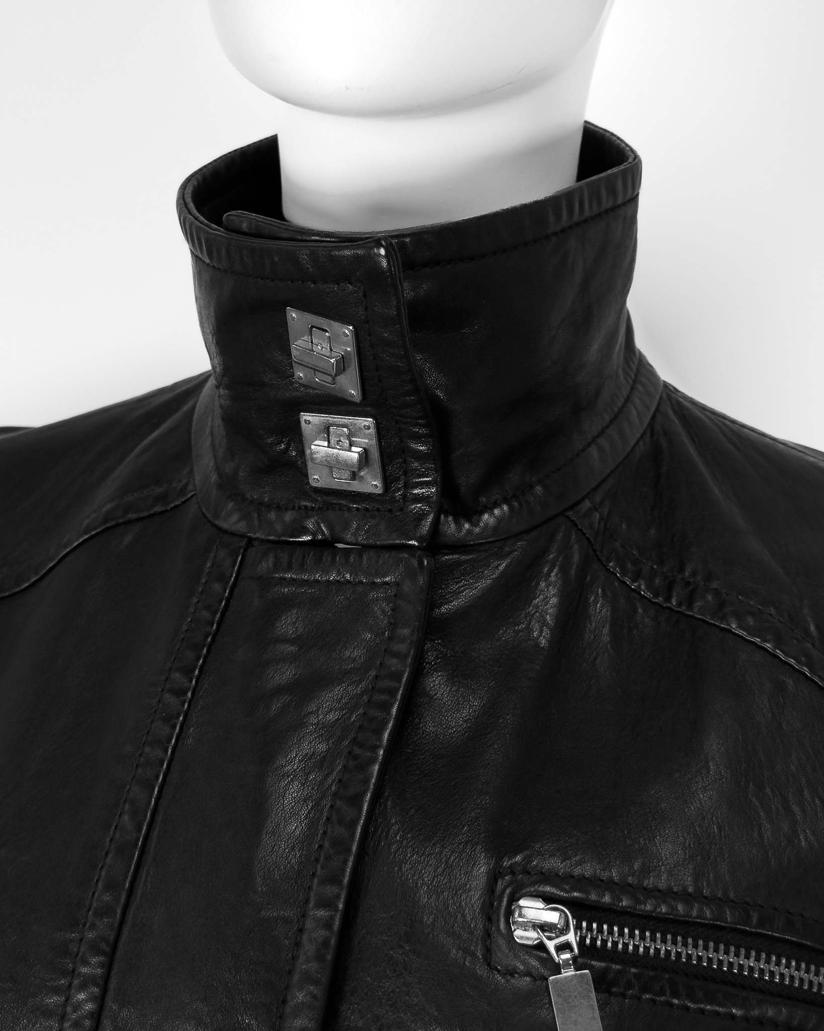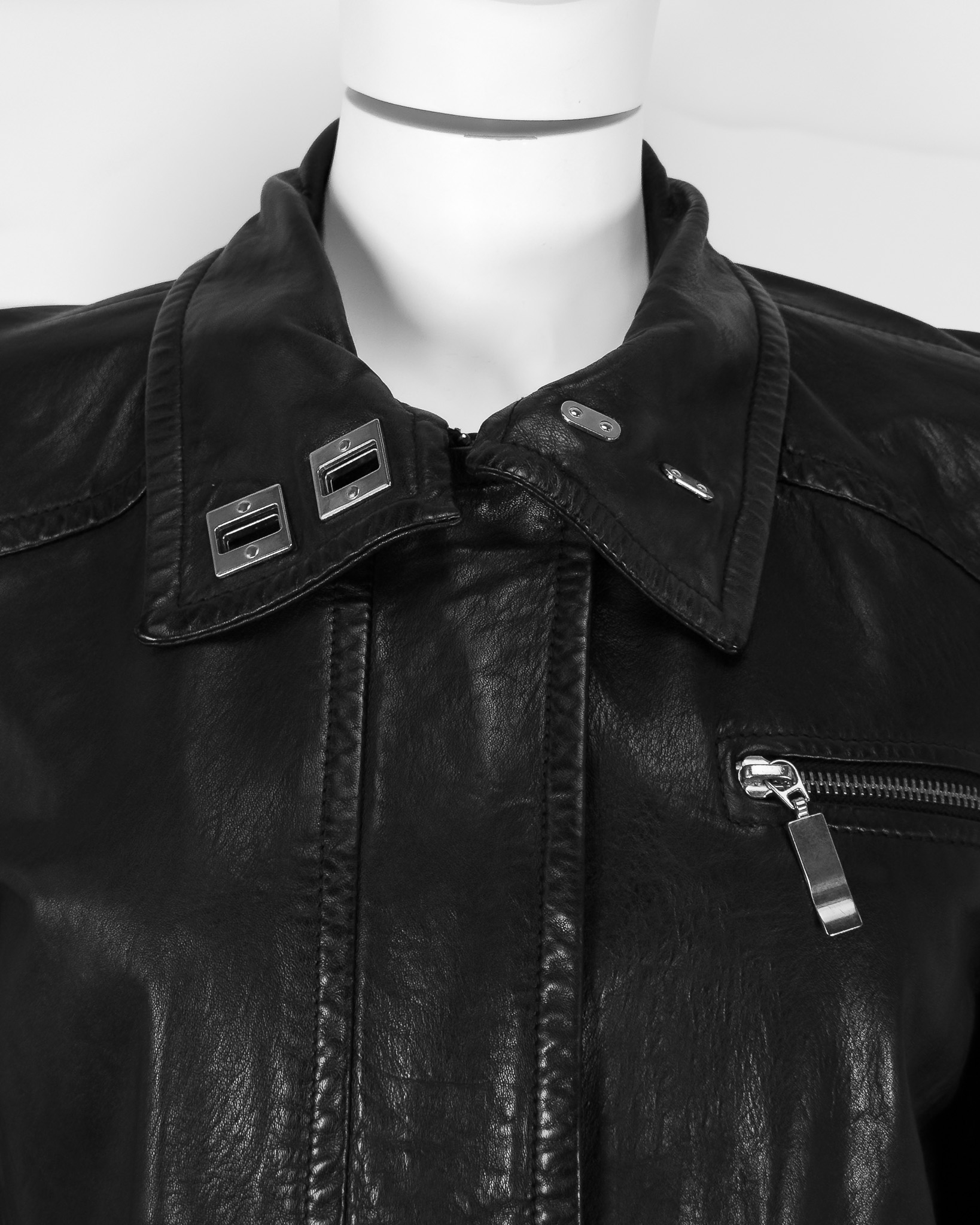 "Czarna kurtka skórzana zapinana na kryty suwak i zatrzaski, kołnierz zapinany pod szyją na srebrne okucia, z tyłu mała blaszka z logiem, suwaki przy kieszeniach. Rozmiar z matki IT 46. Skład: 100% lambskin. Wymiary: szer. ramion 42 cm, szer. biustu47 cm, szer. talii 42 cm, dł. całkowita 57 cm, dł. rękawa 60 cm."