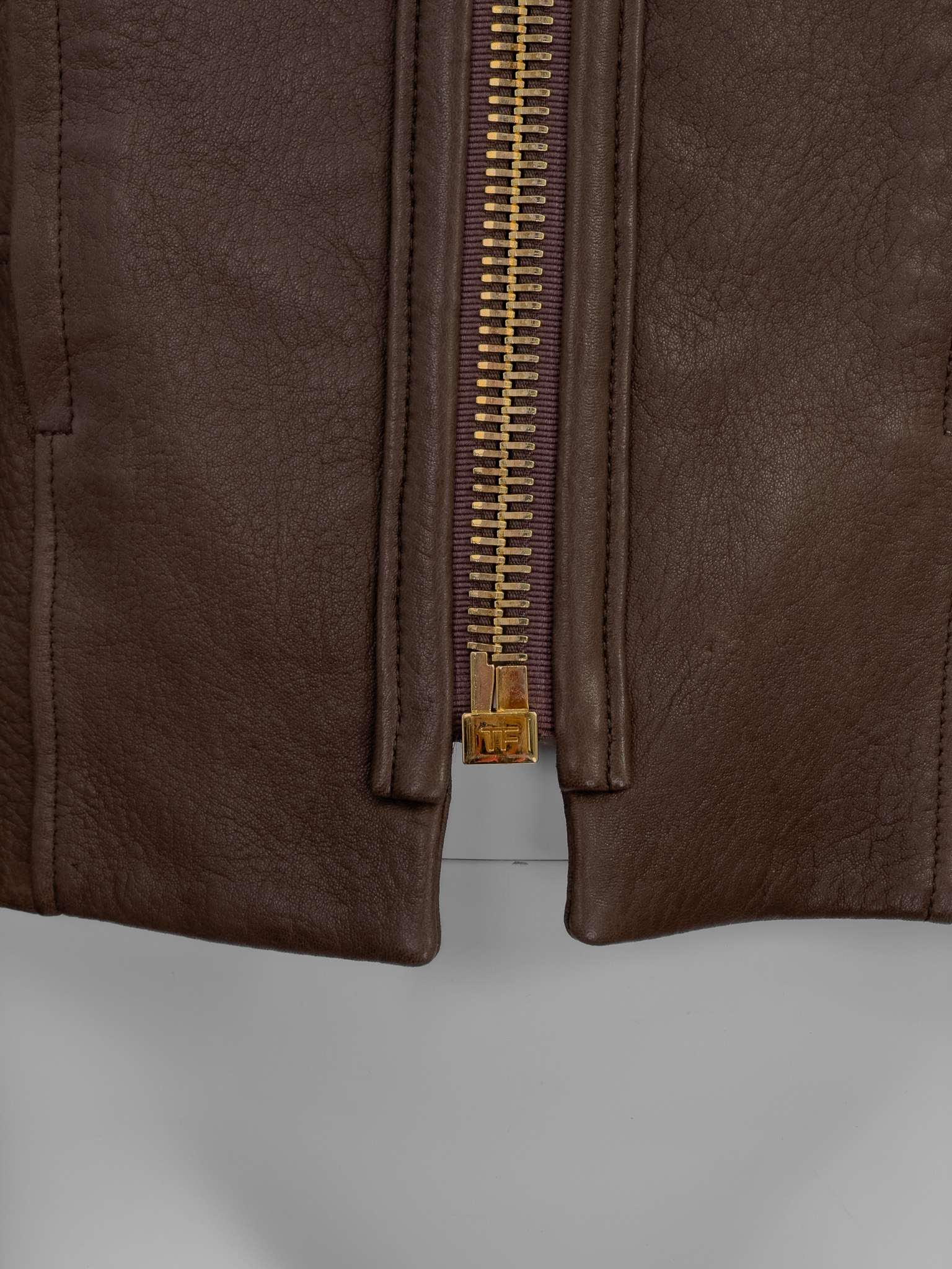 "Brązowa kurtka skórzana w odcieniu czekoladowym, miękka skóra, taliowana, złote logowane okucia, zapinana na duży suwak oraz stójkę, czarna bawełniana podszewka, rozsuwane mankiety, przeszycia oraz delikatne poduszki na ramionach, dwie kryte kieszenie po bokach. Rozmiar z metki IT 38. Skład: skóra jagnięca; podszewka: 100% cupro."