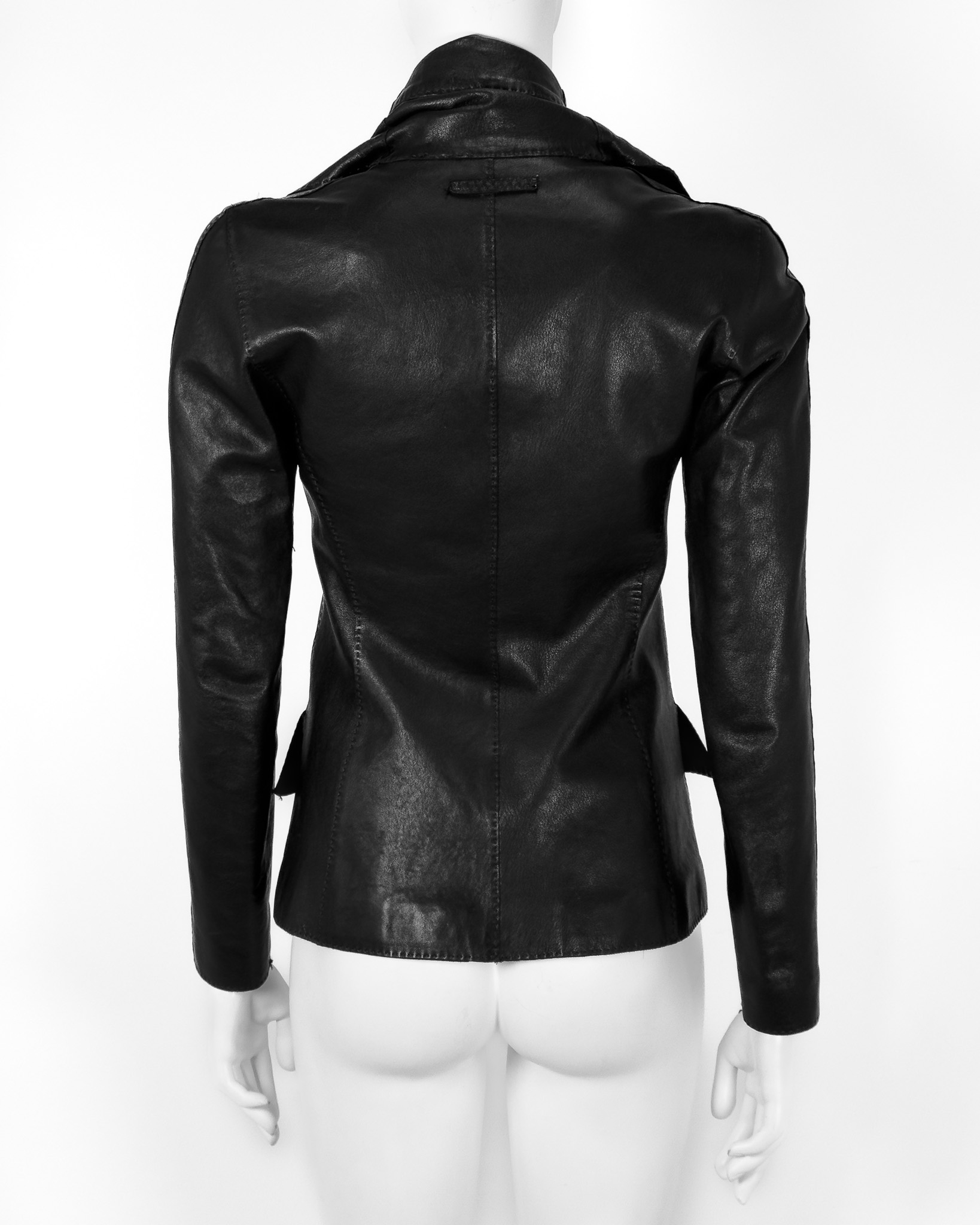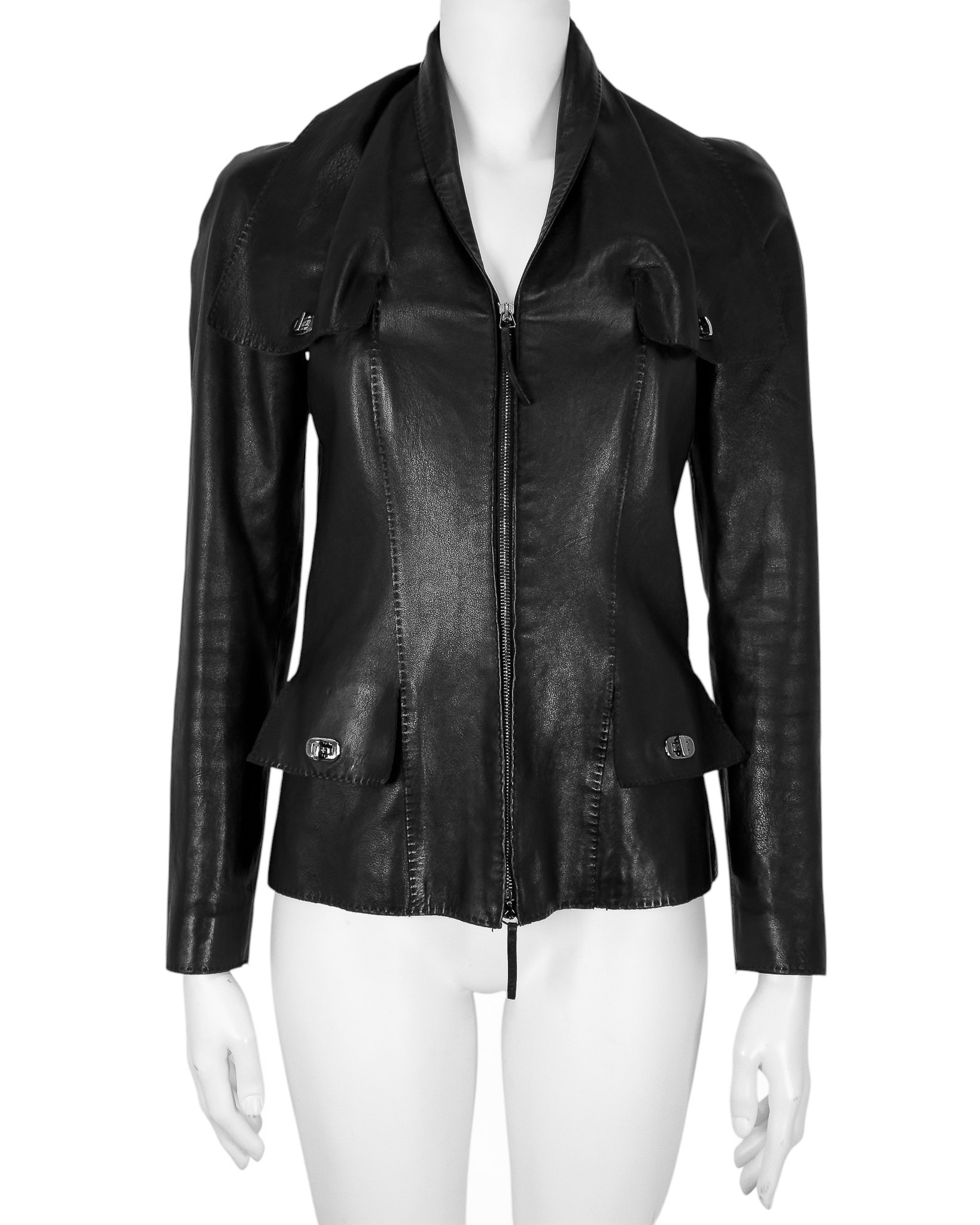 "Czarna kurtka skórzana, miękka skóra, szeroki kołnierz wykończony srebrnym przekręcam zapięciem na kieszeniach w okolicy biustu, taliowana, cztery kieszenie z klapami, zapinana na dwa suwaki, delikatne poduszki na ramionach, ozdobiona stębnowaniem. Rozmiar z metki IT 40. Skład: 100% skóra owcza; podszewka: 60% acetat, 40% rayon. Wymiary: szerokość mierzona od pachy do pachy 43cm, długość całkowita 62cm."