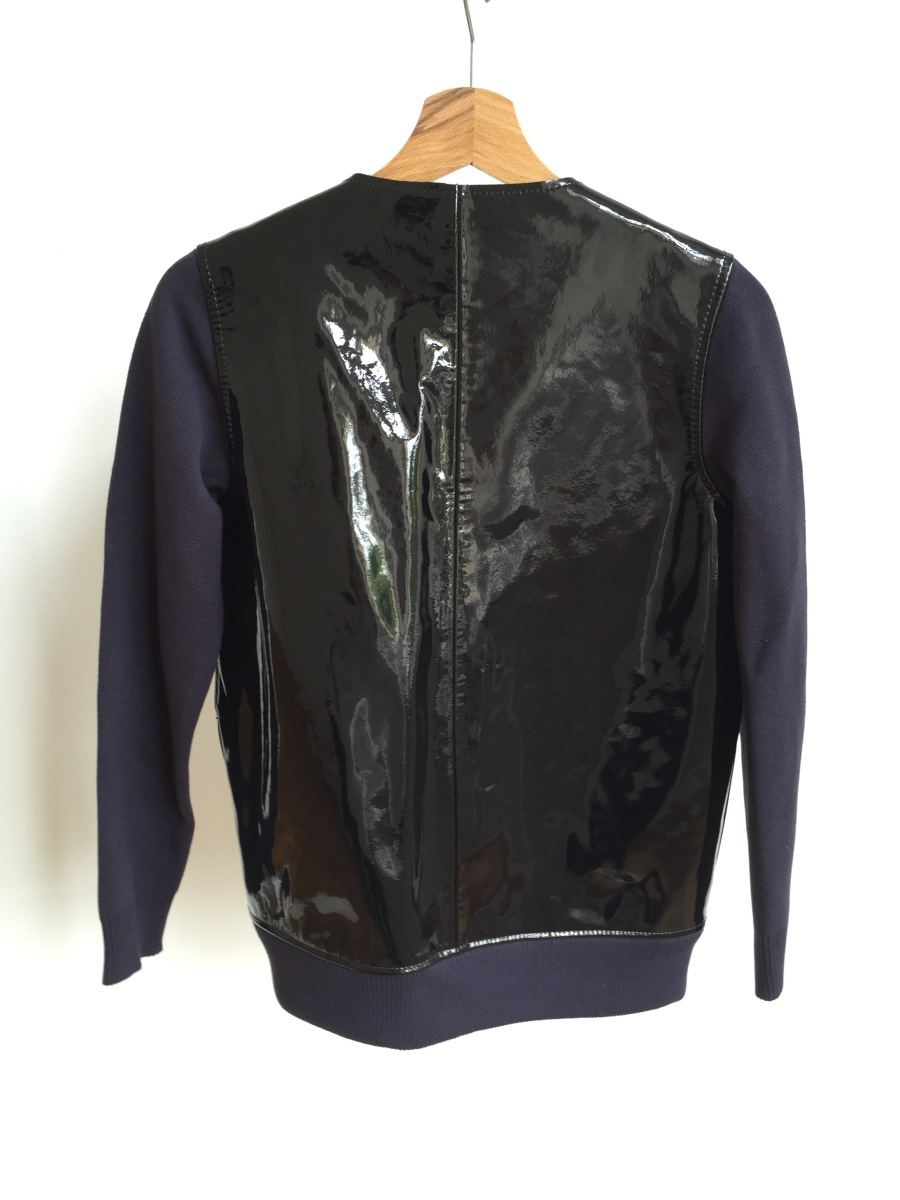 "Kurtka w kolorze granatowym z elementami skóry lakierowanej, jak nowa, rozmiar 36."