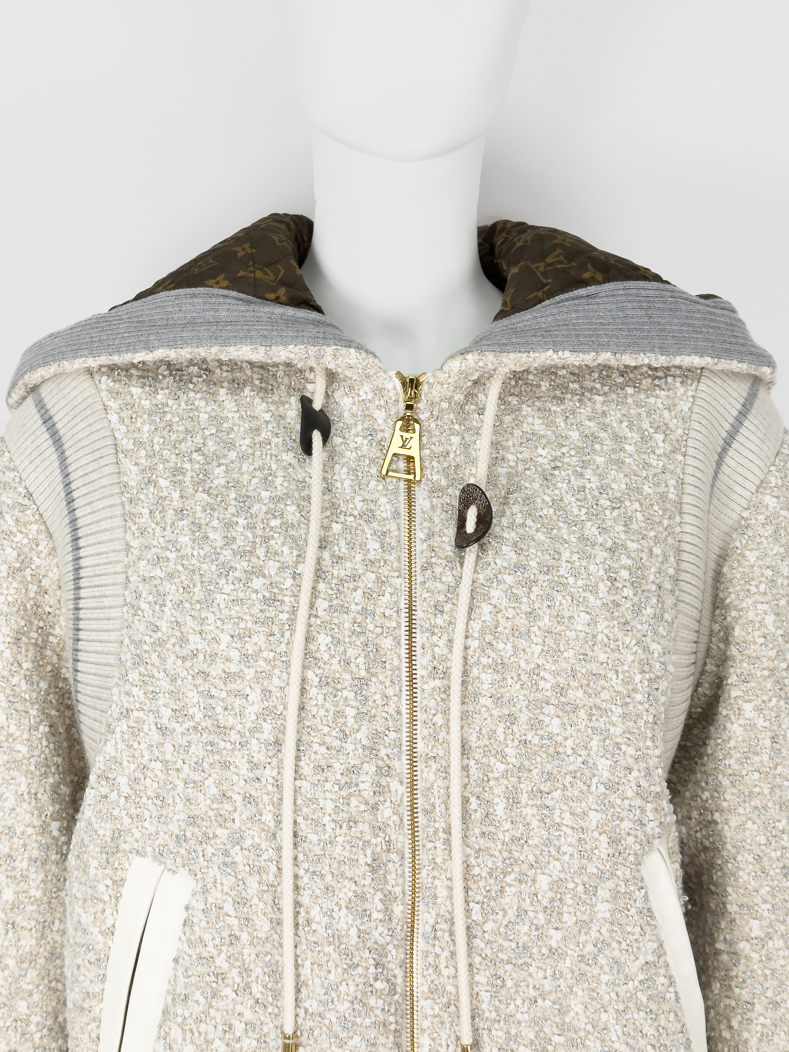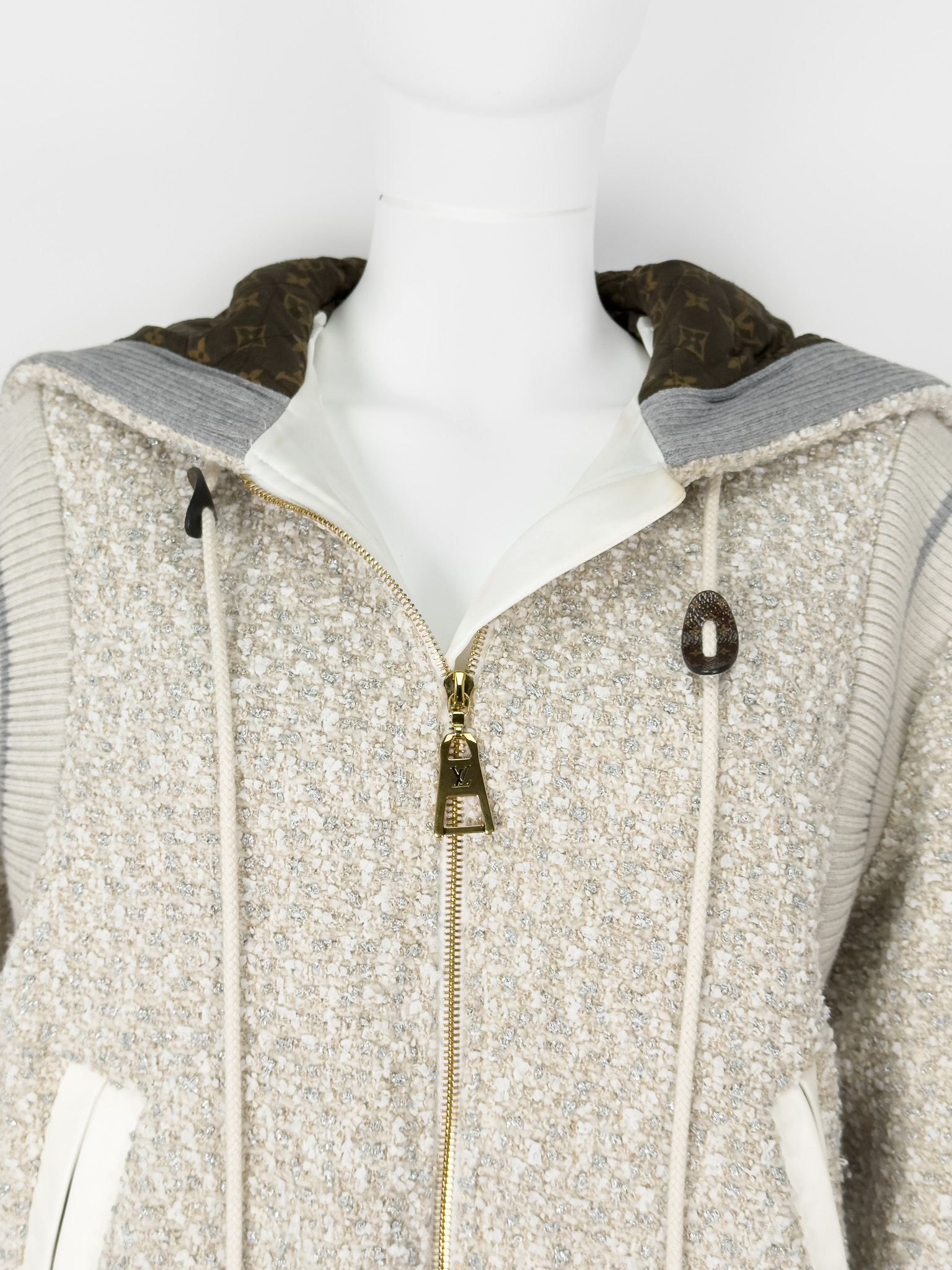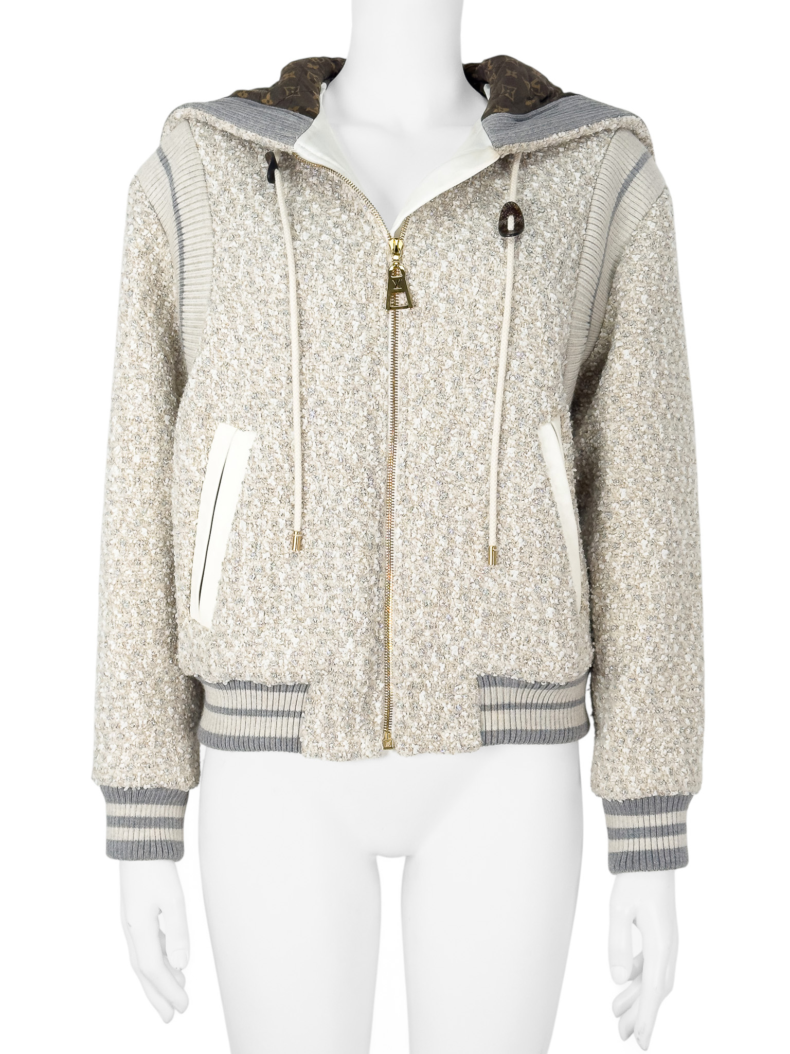 "Błękitno-beżowa kurtka z kapturem, typ bomberka, tweedowa, złoty suwak z logo, skórzane białe wykończenia przy kieszeniach. Rozmiar z metki 36. Nowa z rachunkiem ( zakupiona w Toronto w w 2022r), pokrowcem oraz wieszakiem marki. Skład: 33% poliamid, 21% bawełna, 19% wełna, 15% akryl. Wymiary: szerokość mierzona od pachy do pachy 56cm, długość całkowita 55cm."