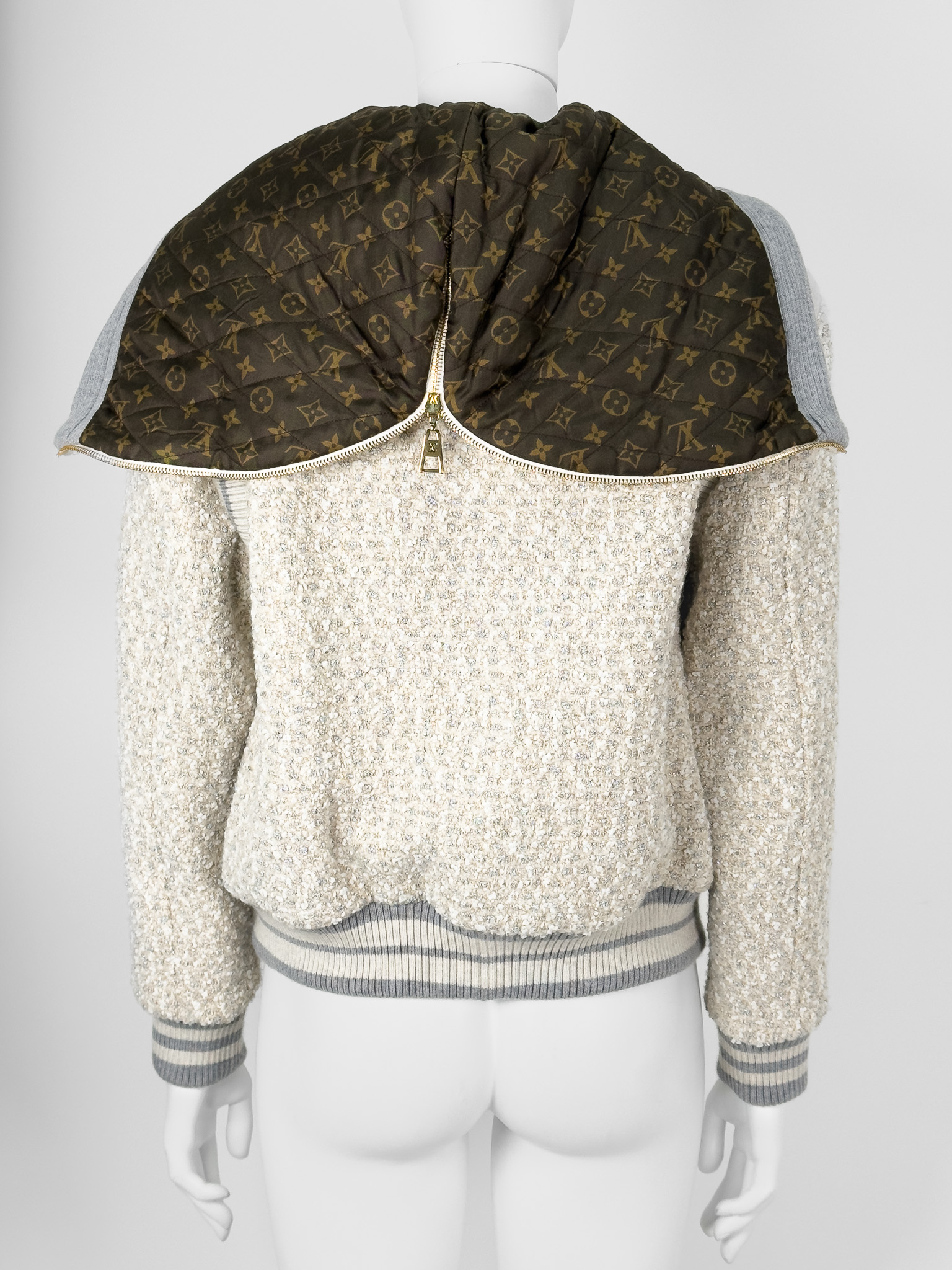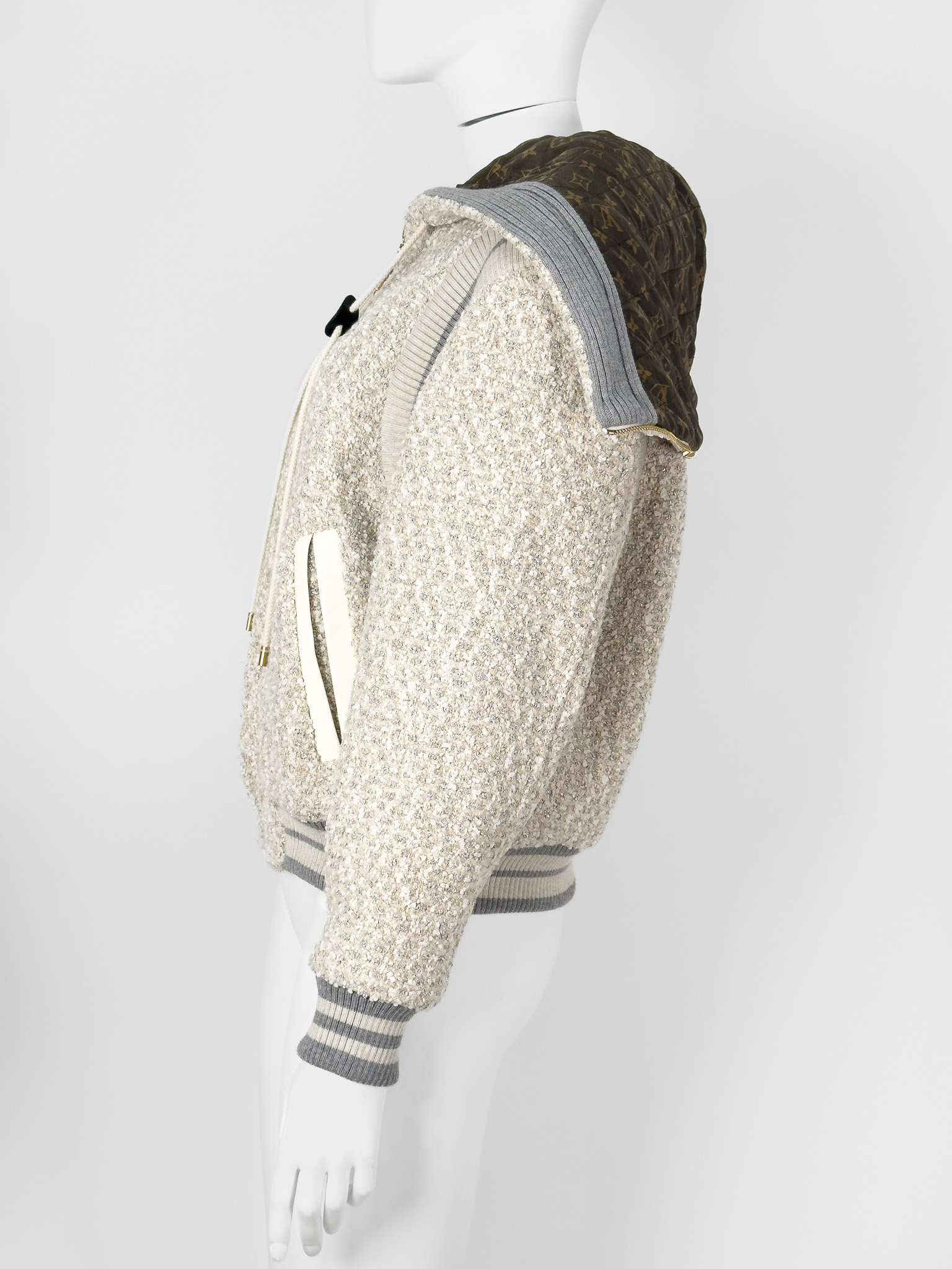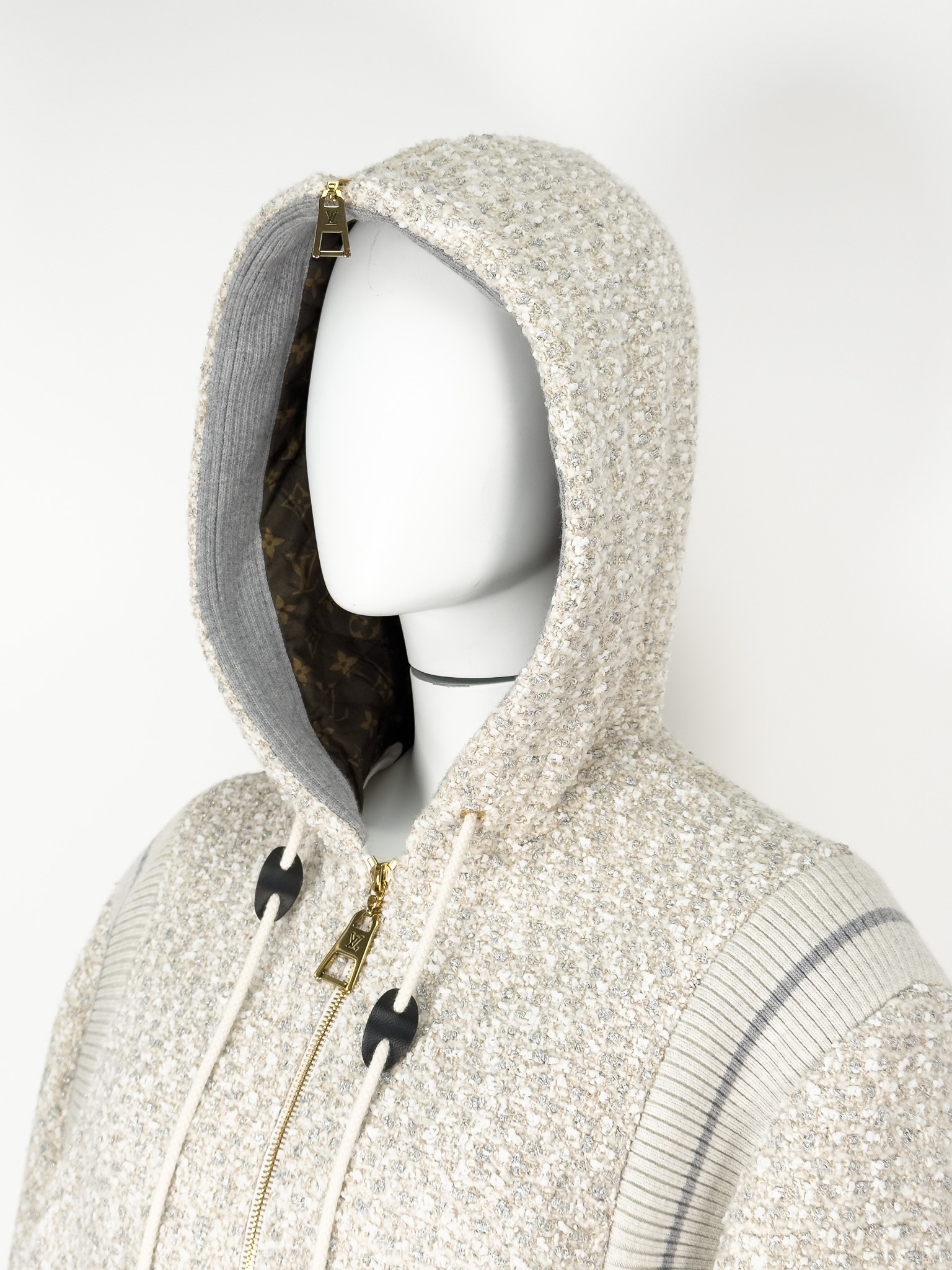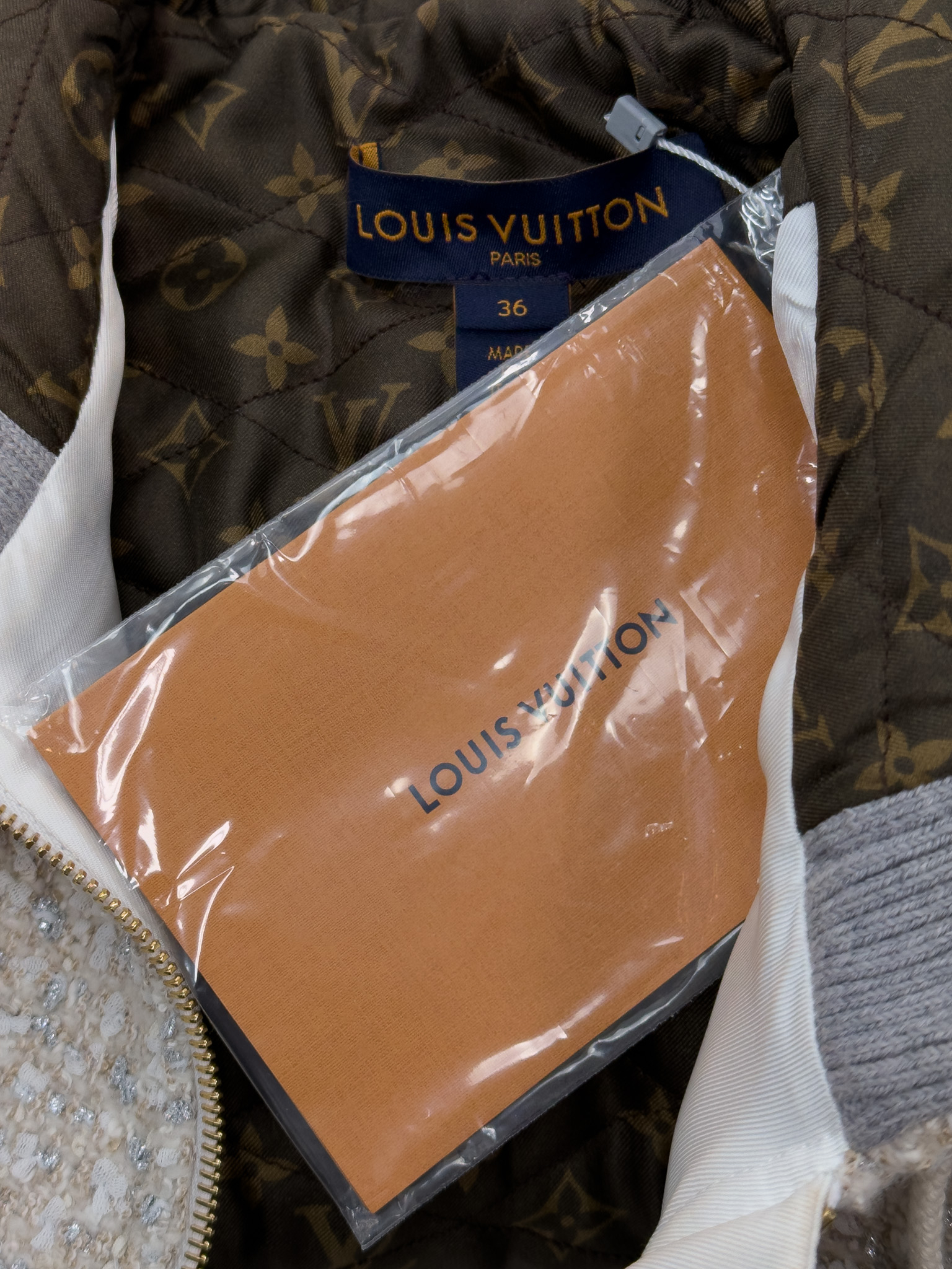 "Błękitno-beżowa kurtka z kapturem, typ bomberka, tweedowa, złoty suwak z logo, skórzane białe wykończenia przy kieszeniach. Rozmiar z metki 36. Nowa z rachunkiem ( zakupiona w Toronto w w 2022r), pokrowcem oraz wieszakiem marki. Skład: 33% poliamid, 21% bawełna, 19% wełna, 15% akryl. Wymiary: szerokość mierzona od pachy do pachy 56cm, długość całkowita 55cm."