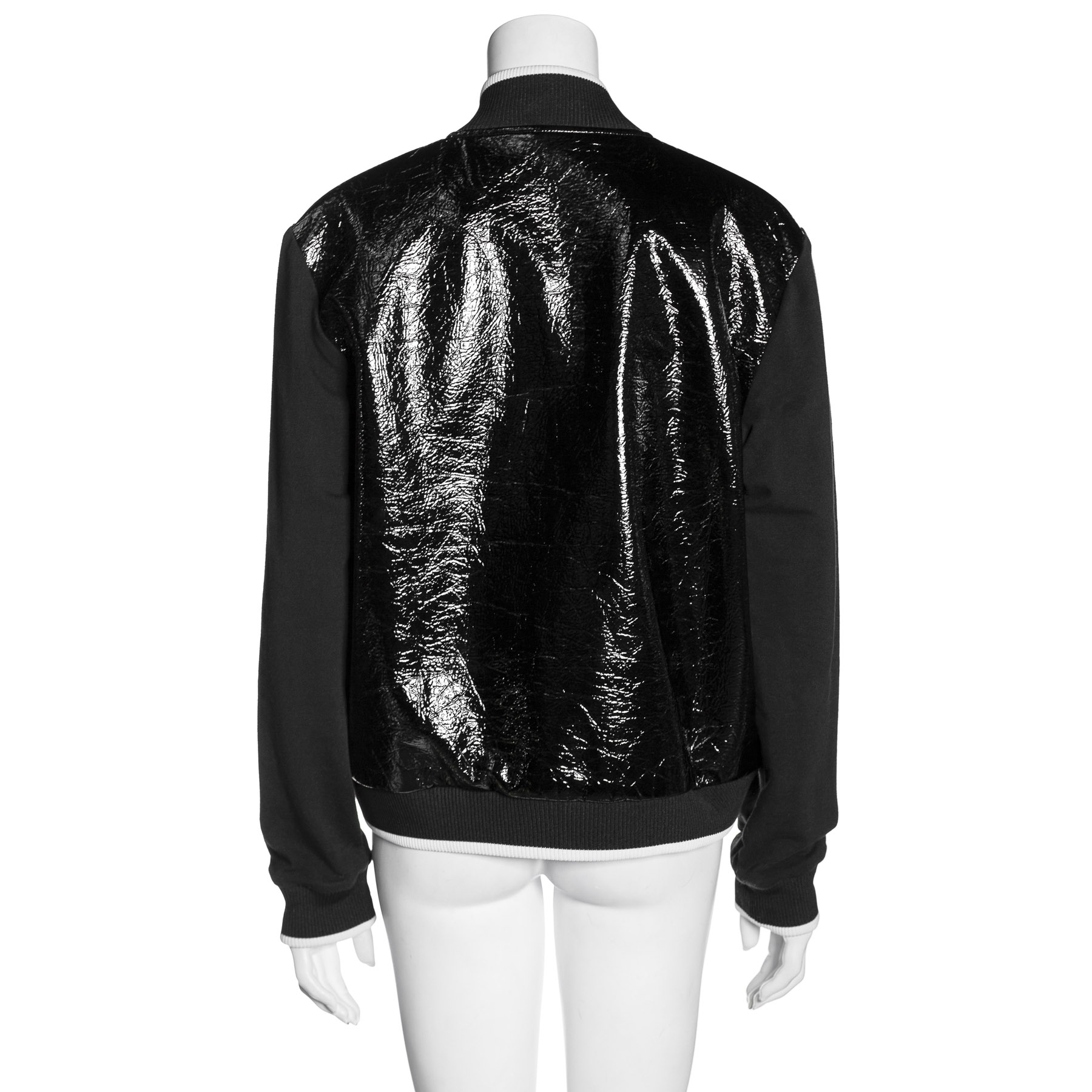 "Kurtka typu bomber, zapinana na suwak. Przód wykonany z lakierowanej eko-skóry, bawełniane rękawy zakończone ściągaczem. Brak metki z rozmiarem i składem."