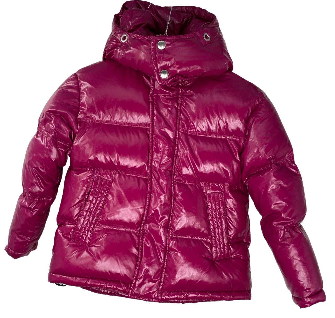 "różowa, połyskująca kurtka puchowa z odpinanym kapturem, zapinana na suwak i zatrzaski, rozmiar 6"