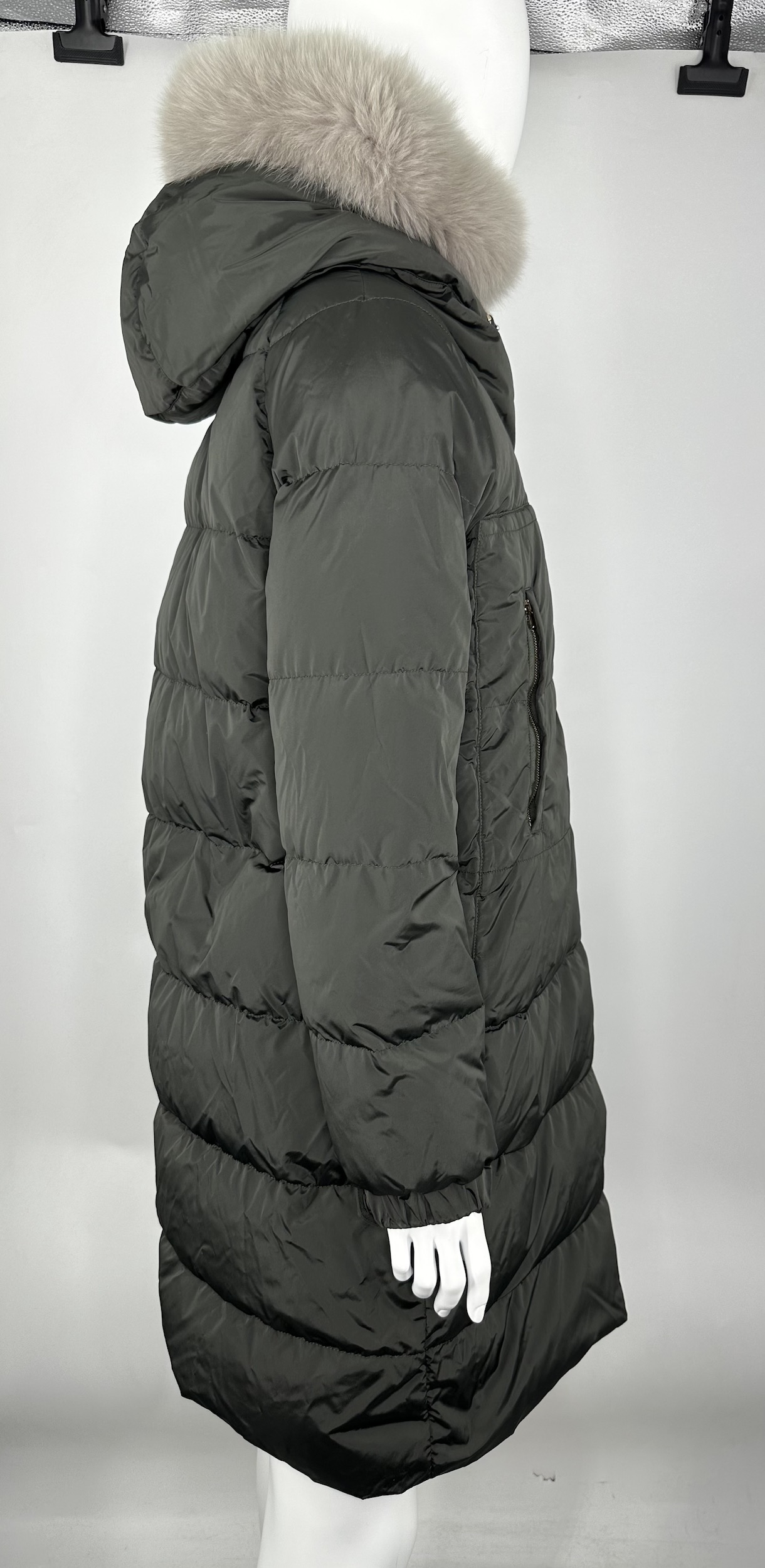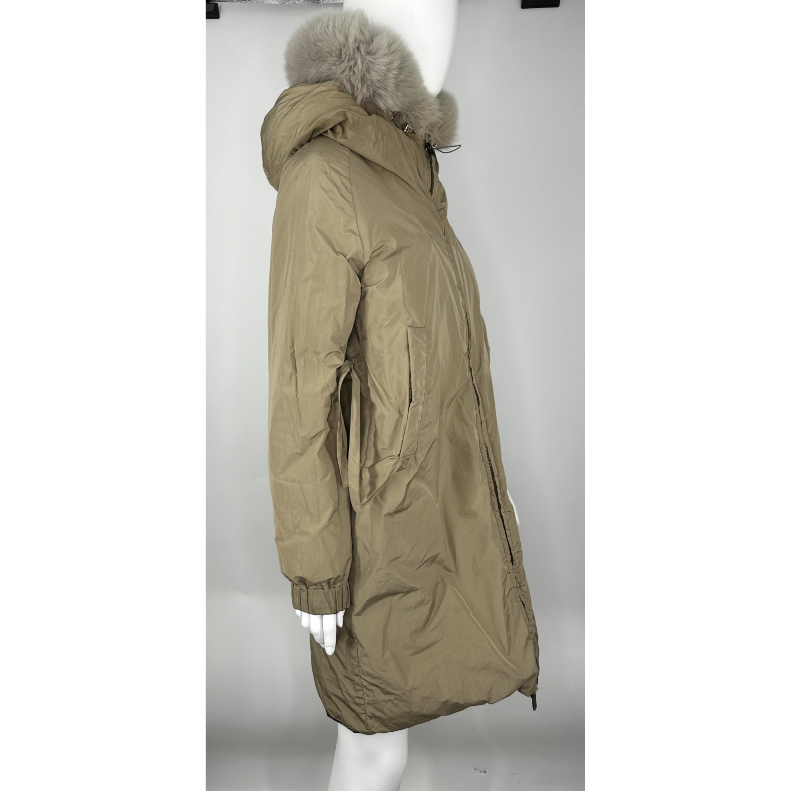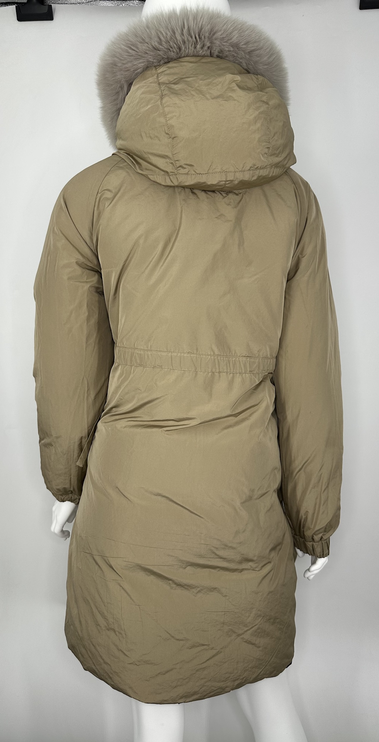 "kurtka dwustronna, zapinana z przodu na suwak, jedna strona w kolorze khaki, druga beżowa, kaptur obszyty futrem, boczne kieszenie po obu stronach. Rozmiar: 36. Skład: 100% poliamid. Wymiary: szer. ramion 57 cm, szer. biustu 51 cm, szer. talii 55 cm, dł. całkowita 89 cm, dł. rękawa 50 cm."