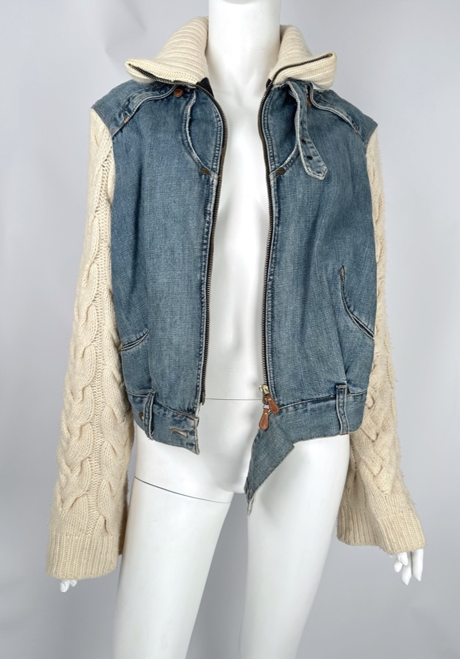 "jeansowa kurtka z wełnianym beżowym wykończeniem na rękawach i kołnierzu, zapinana z przodu na suwak, oraz na guziki w okolicach talii, podszewka. Rozmiar IT 44. Skład: 50% bawełna, 45% wełna. Wymiary: szer. ramion 43 cm, szer. biustu 49 cm, szer. talii 41 cm, dł. całkowita 52 cm, dł. rękawa 65 cm."