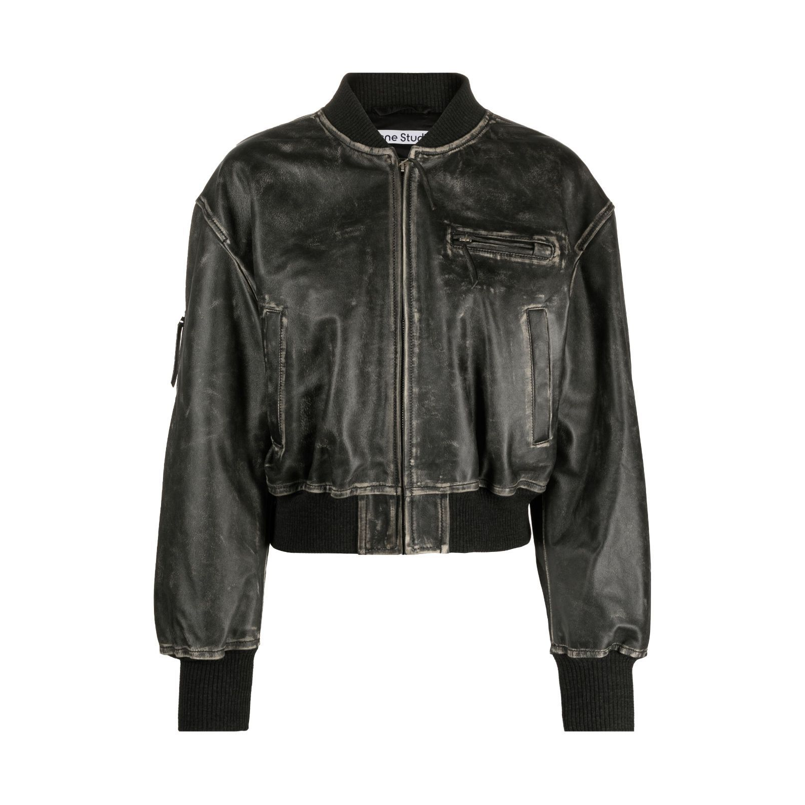 "Grafitowa skórzana kurtka o kroju bomberki z ręcznie wykonanymi postarzanymi detalami, kontrastowy ściągacz przy kołnierzu, mankietach i u dołu, zapinana na suwak, zasuwane kieszenie na piersi i rękawie, dwie kryte na przodzie, dwie zapinane na zatrzask po wewnętrznej stronie. Rozmiar z metki 36. Skład: 100% skóra, podszewka: 100% wiskoza.