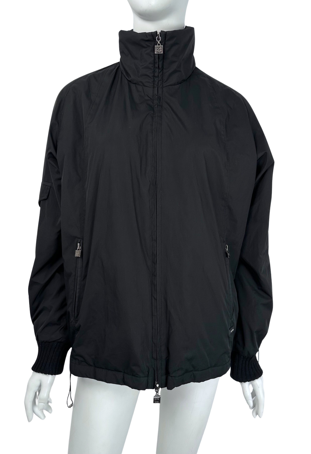 "Czarna kurtka, prosty krój, drobne detale, które przykuwają wzrok i podkreślają jej wysoką jakość. W pasie ma dwie gumki ze ściągaczem wykończone podwójnym logowaniem. Ten sam wzór logowania - drobne metalowe prostokąty z tłoczonymi literami: "C" powtarza się wielokrotnie: przy suwakach po bokach, suwaku z podwójnym rozpięciem na froncie i przy zakończeniach ściągaczy od mankietów. Podwójna zamek pozwala na rozsunięcie wybranego fragmentu kurtki - od góry lub od dołu o dowolnie wybraną długość. Mankiety kurtki wykończone są szerokim ściągaczem, jest to dodatkowa izolacja od zimna. Przy szyi ma kołnierz. Na każdym z rękawów kurtki naszyta jest pojedyncza kieszonka - jedna z zapięciem na zatrzask, a druga zamykana na zamek. Od spodu podszyta jest podszewką z monogramem w kolorze srebrnej bieli. Wewnątrz ma krytą kieszeń z zapięciem na zamek. Stan: bardzo dobry. Wycięte metki ze składem i rozmiarem. Elementy metalowe są w kolorze srebrnym. Wymiary:. dł. mierzona od karku: 61 cm., szer. (mierzona od pachy do pachy): 53 cm., dł. rękawa (mierzona od pachy): 46 cm., szer. mankietu: 9 cm., szer. (mierzona na linii pachy): 22 cm, szer. (mierzona w pasie): 56 cm."