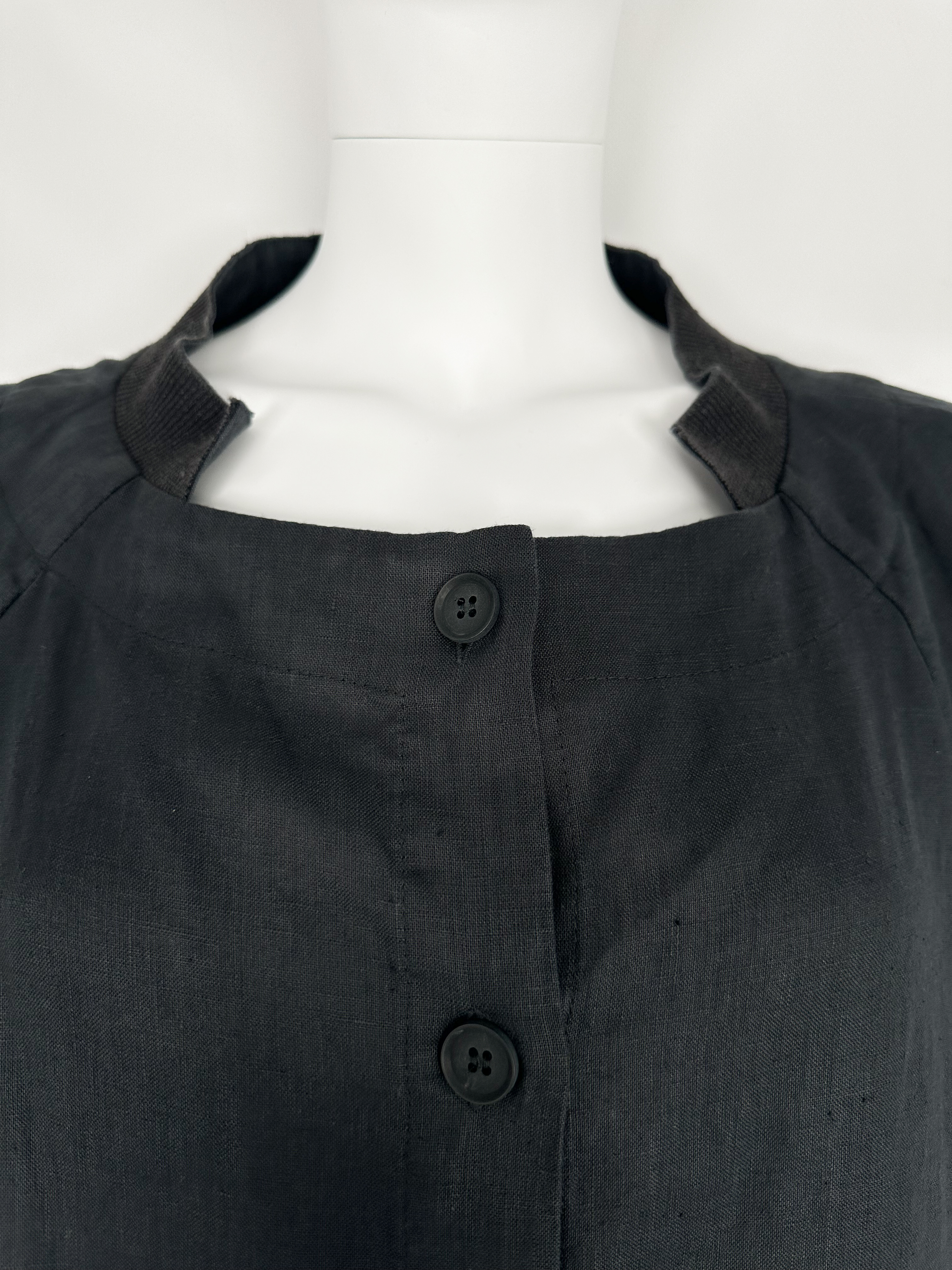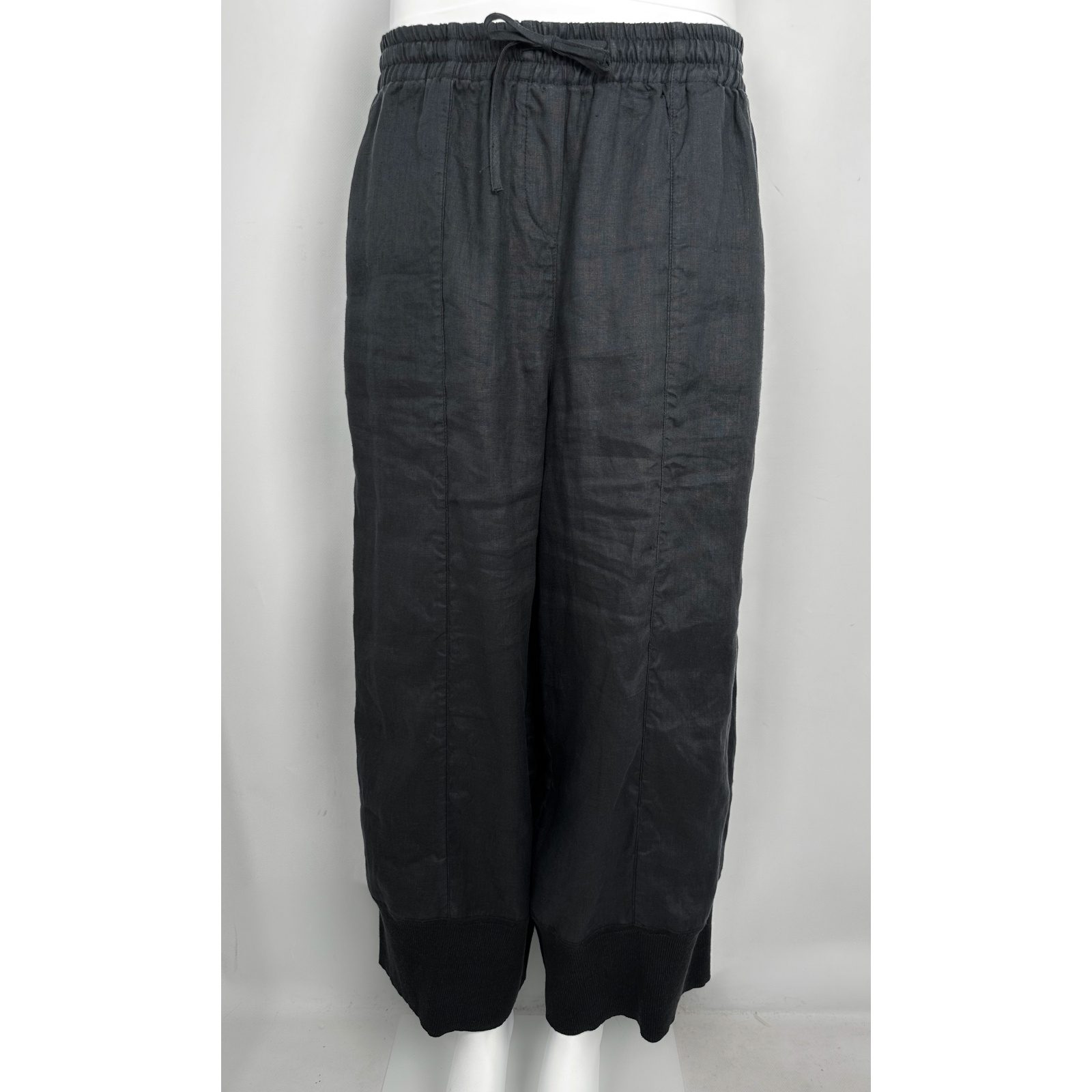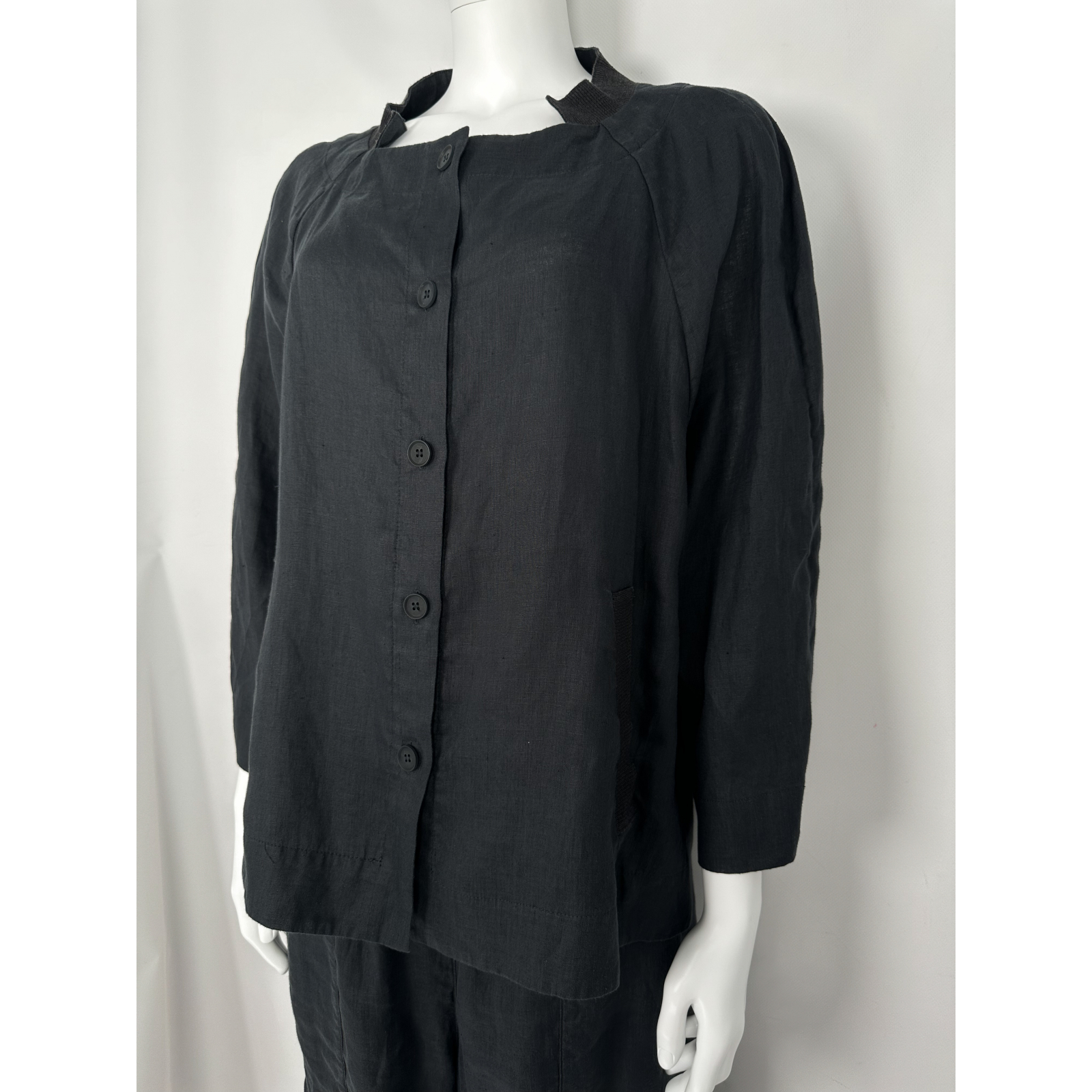 "Grafitowy lniany komplet, koszula+ spodnie. Koszula zapinana na guziki, dwie kryte kieszenie po bokach, dekolt oraz kieszenie wykończone prążkowanymi wstawkami, prosty krój, wycięcia po bokach. Spodnie z wysokim stanem ozdobione prostymi przeszyciami, wiązany sznurek w pasie, nogawka o długość 7/8 zakończona szerokim ściągaczem, dwie kryte kieszenie po bokach, jedna w tylnej części. Rozmiar z metki 42. Skład: 100% konopie. Wymiary koszuli: szerokość mierzona od pachy do pachy 65cm, długość całkowita 66cm; wymiary spodni: szerokość w pasie 42cm, długość całkowita 92cm."