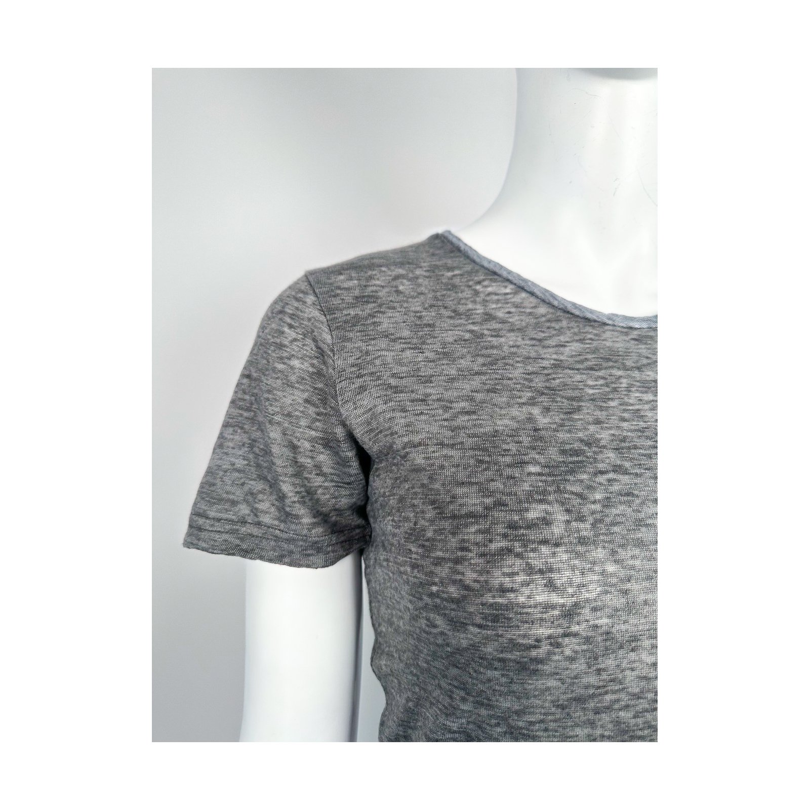 "Lniany t-shirt w odcieniu ciemnego melanżu, półtransparentny, krótki rękaw, prosty krój. Rozmiar z metki S. Skład: 100% len. Wymiary: szerokość mierzona od pachy do pachy 39cm, długość całkowita 62cm."