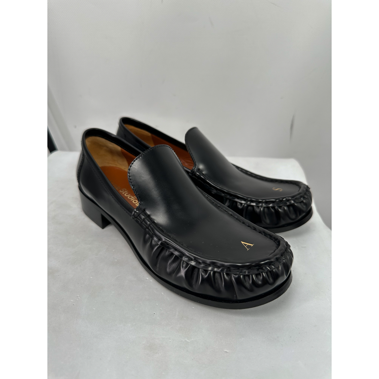 "Czarne skórzane loafersy ozdobione złotymi inicjałami marki, wykończone marszczoną skórą w przedniej części, delikatnie zaokrąglone noski, brązowe skórzane wnętrze. Stan bardzo dobry, delikatnie przetarta skóra na noskach. Rozmiar 39."
