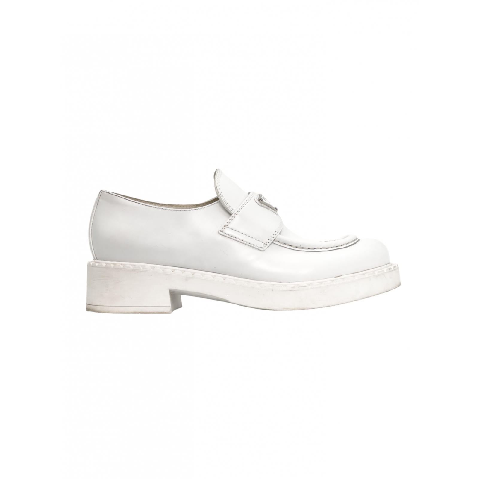 "Białe skórzane loafersy ozdobione trójkątną naszywką ze srebrnym logo marki w przedniej części na pasku, migdałowe noski, wsuwane, niski obcas, używane. Stan dobry, posiadają delikatne rysy na skórze oraz przetarcia na podeszwie. Rozmiar 38."