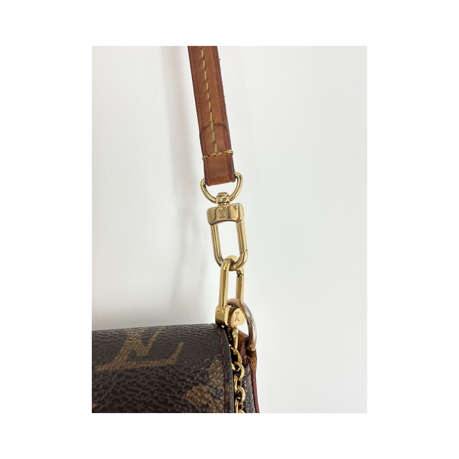 "Favorite MM shoulder bag, brązowa skórzana torebka, monogram, zapięcie na klapkę z magnesem,, brązowy skórzany pasek na ramię ze złotym łańcuszkiem, worek przeciwkurzowy w zestawie. Wymiary: szer. 21 cm, wys. 14 cm, dł. paska 120 cm"