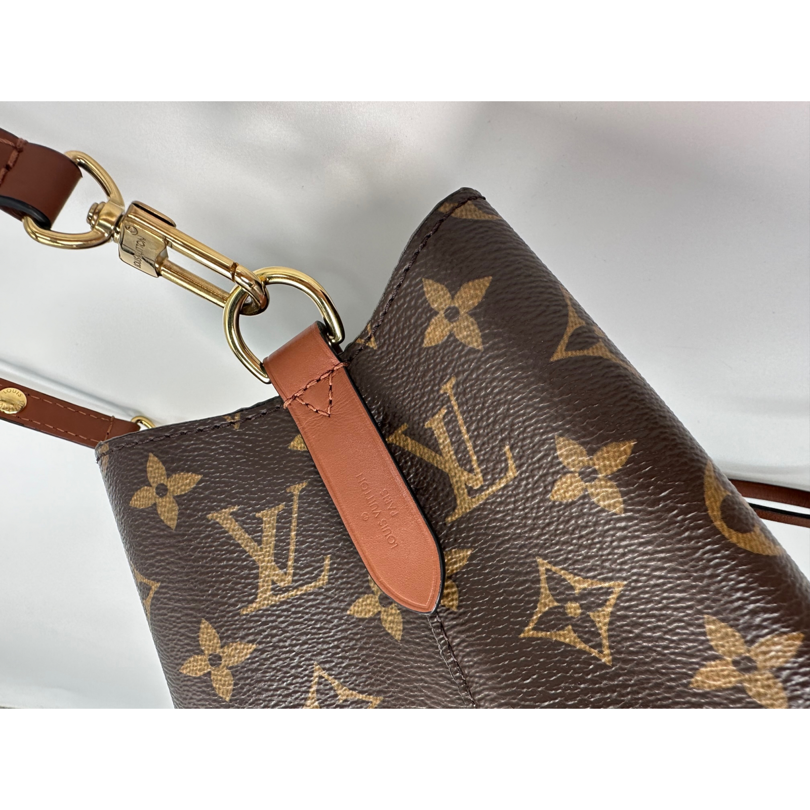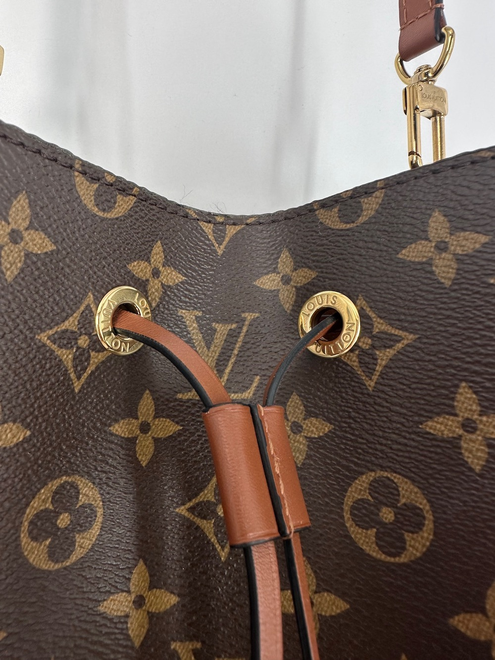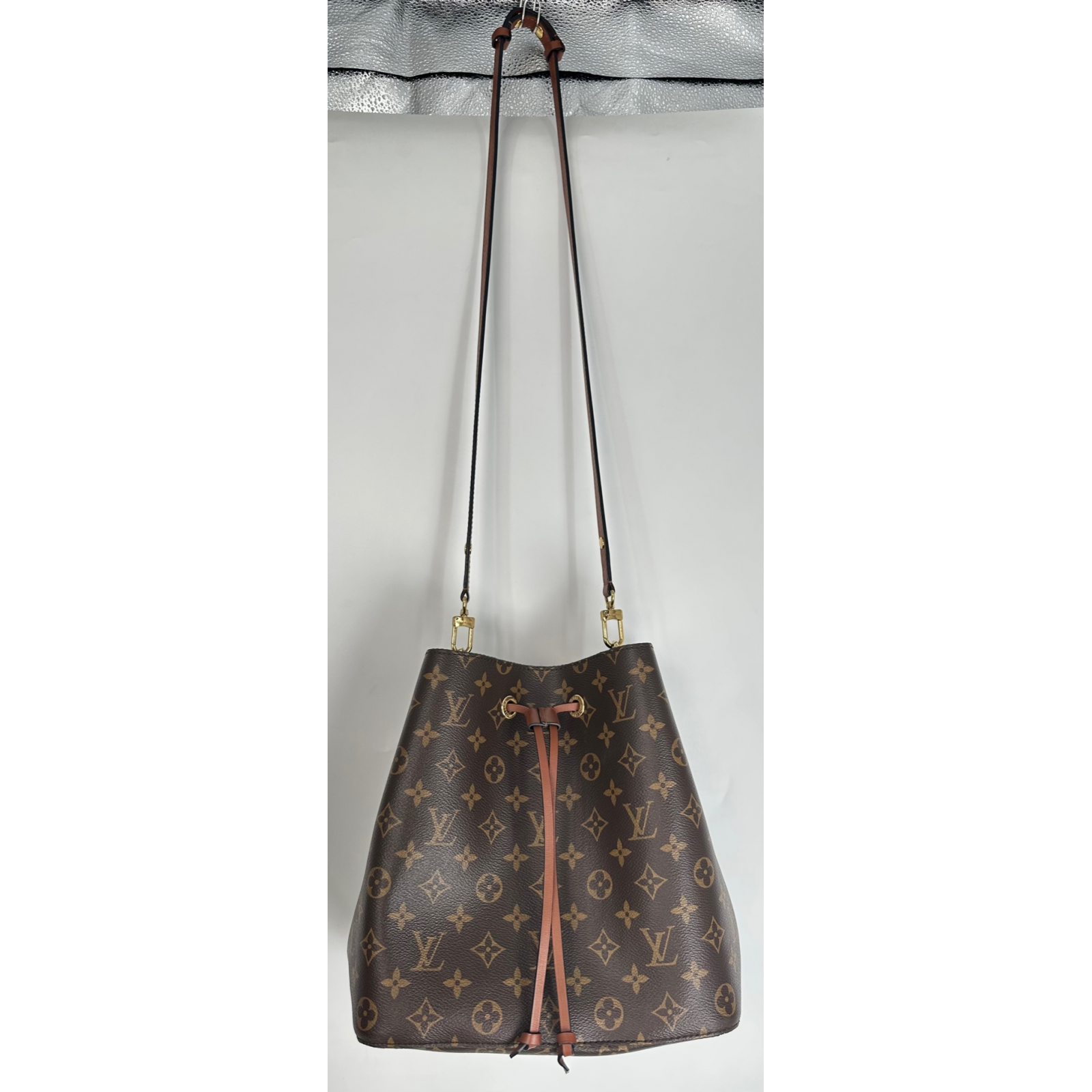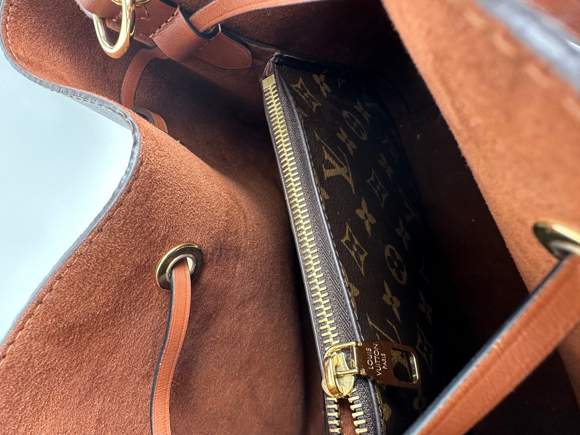 "brązowa torebka w formie worka ze ściągaczem model NeoNoe MM Bag, pasek na ramię z możliwością odpięcia, złote elementy, w środku brązowy zamsz z zasuwaną kieszonką, stan bardzo dobry. Wymiary: szer, 27 cm, wys. 25 cm, podstawa 16 cm, dł paska 126 cm."