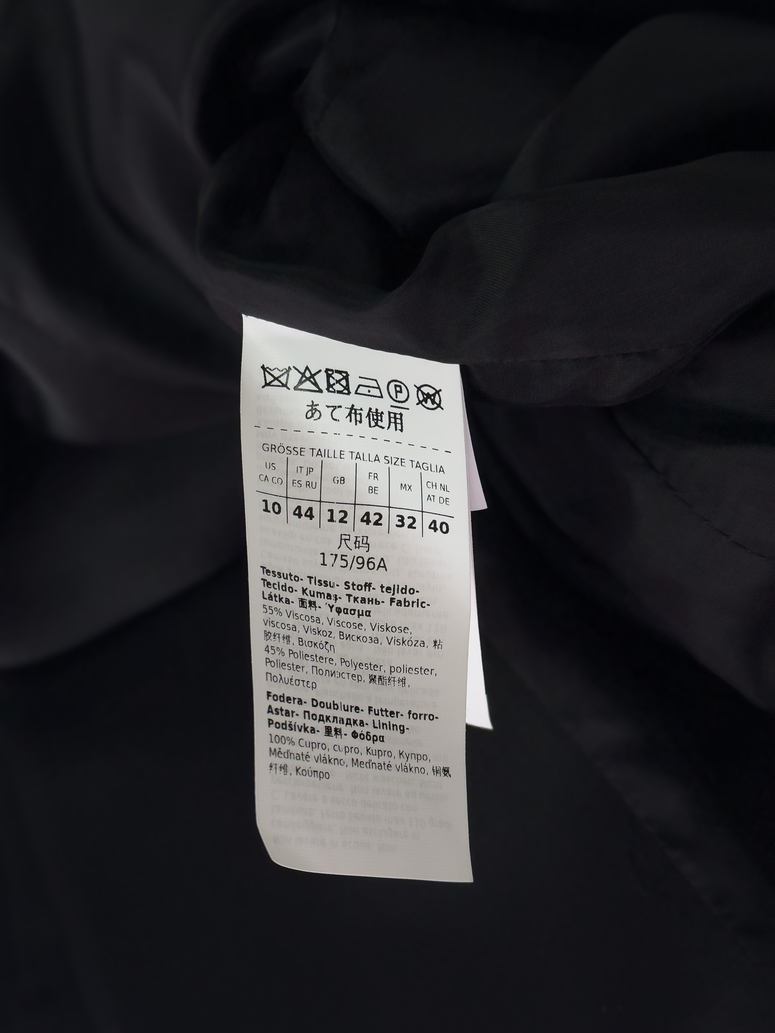 "Czarna satynowa marynarka, prosty, dłuższy krój, jednorzędowa, zapinana na dwa guziki, dwie kieszenie z klapami po bokach, dekolt w szpic, rozcięcia przy mankietach, delikatne poduszki na ramionach, rozporek. Rozmiar z metki IT 44. Skład: 55% wiskoza, 45% poliester; podszewka: 100% kupro. Wymiary: szerokość mierzona od pachy do pachy 54cm, długość całkowita 71cm."
