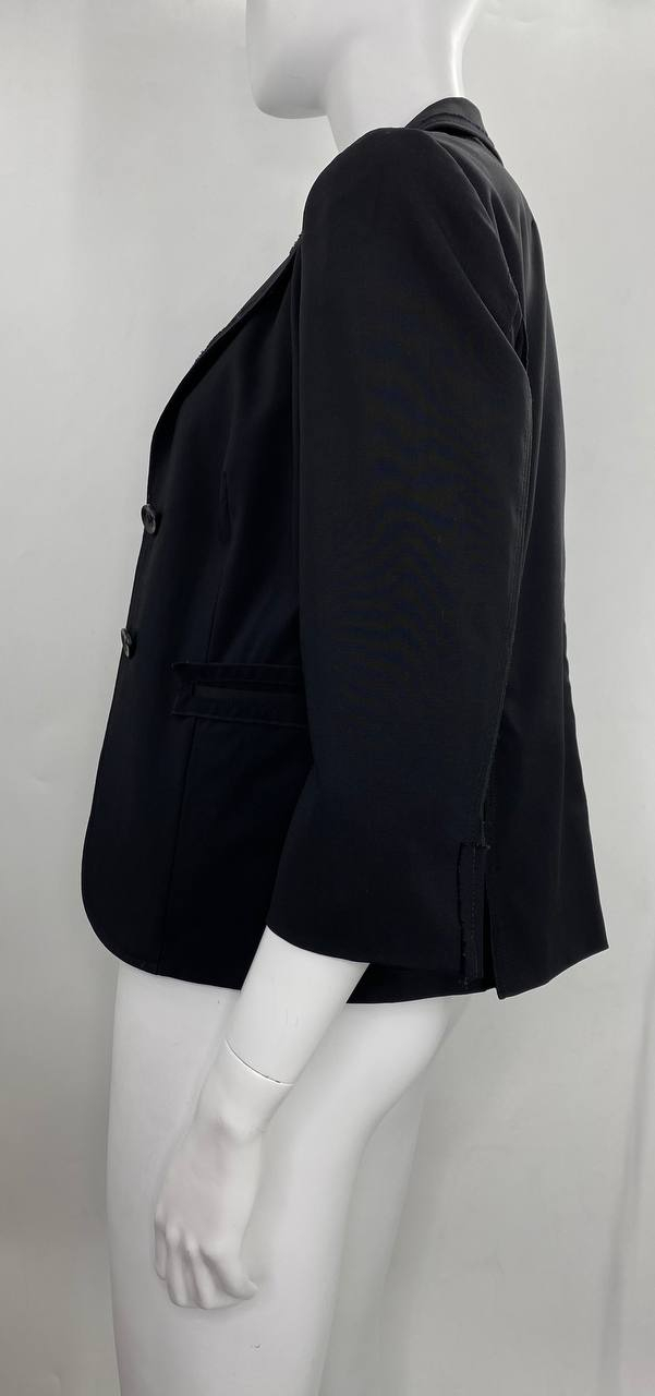 "czarna marynarka zapinana na dwa guziki, surowe wykończenie kieszeni, przeszycia, w środku beżowa, sygnowana podszewka. Rozmiar 36. Skład 98%wełna 2% spandex