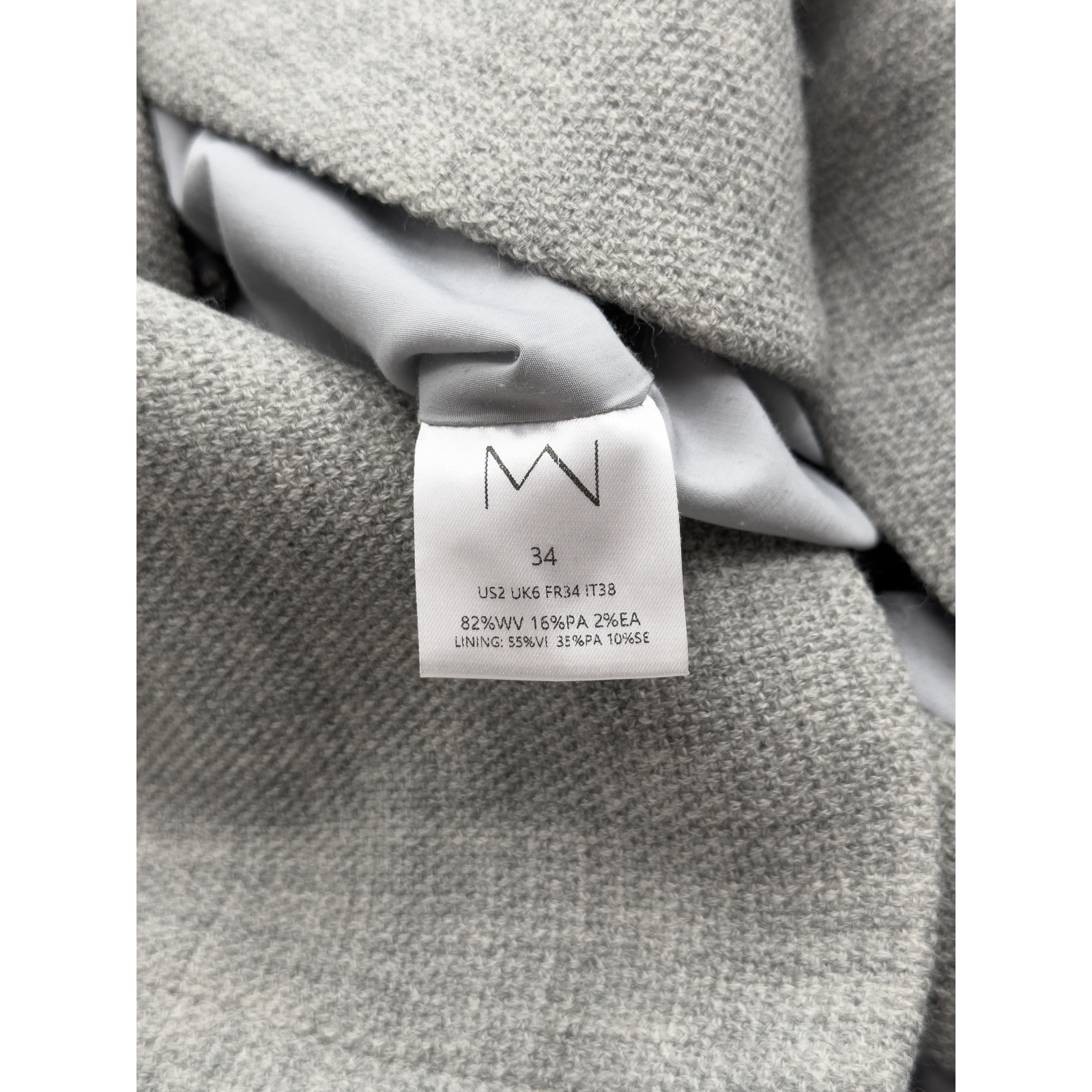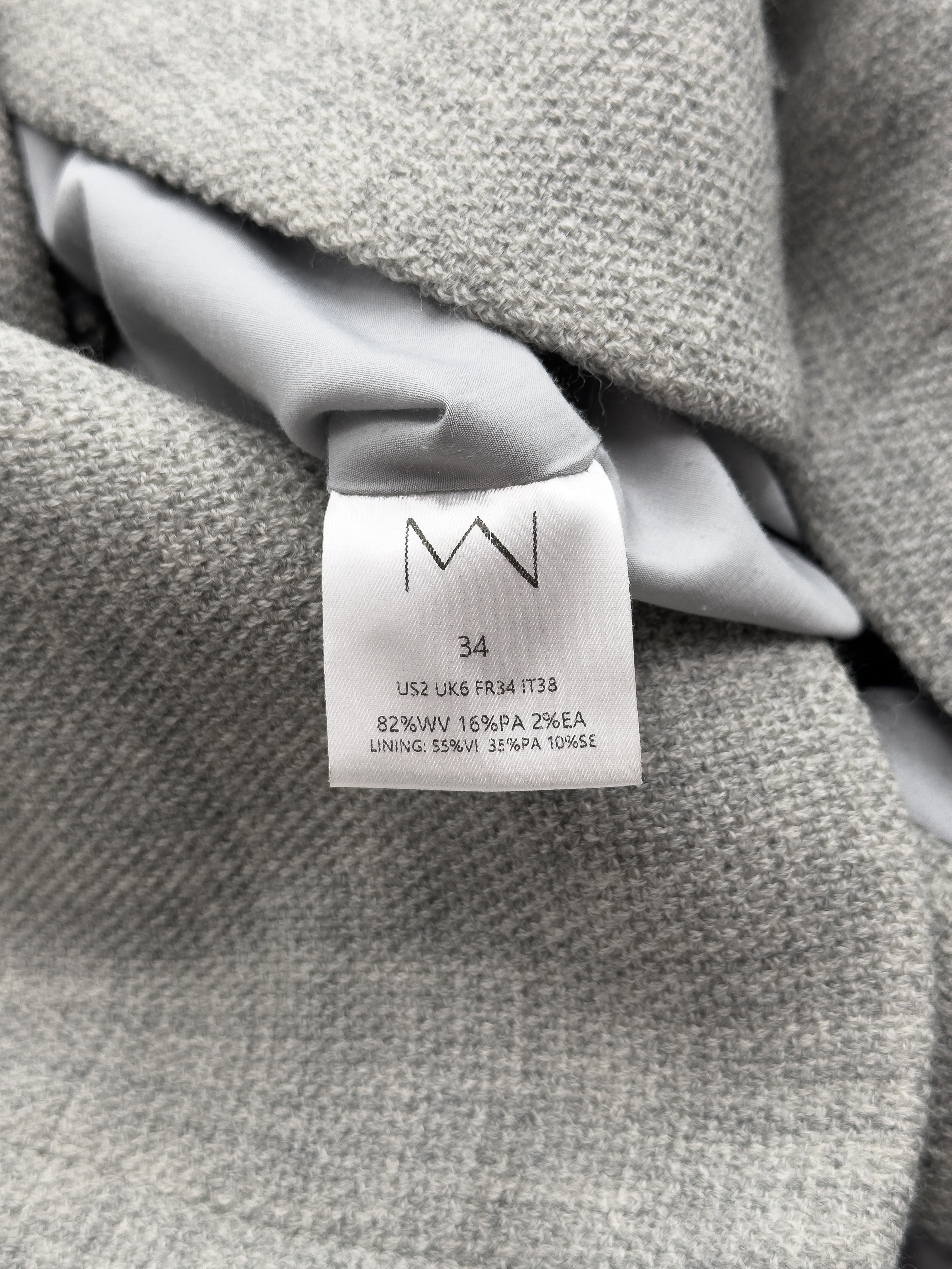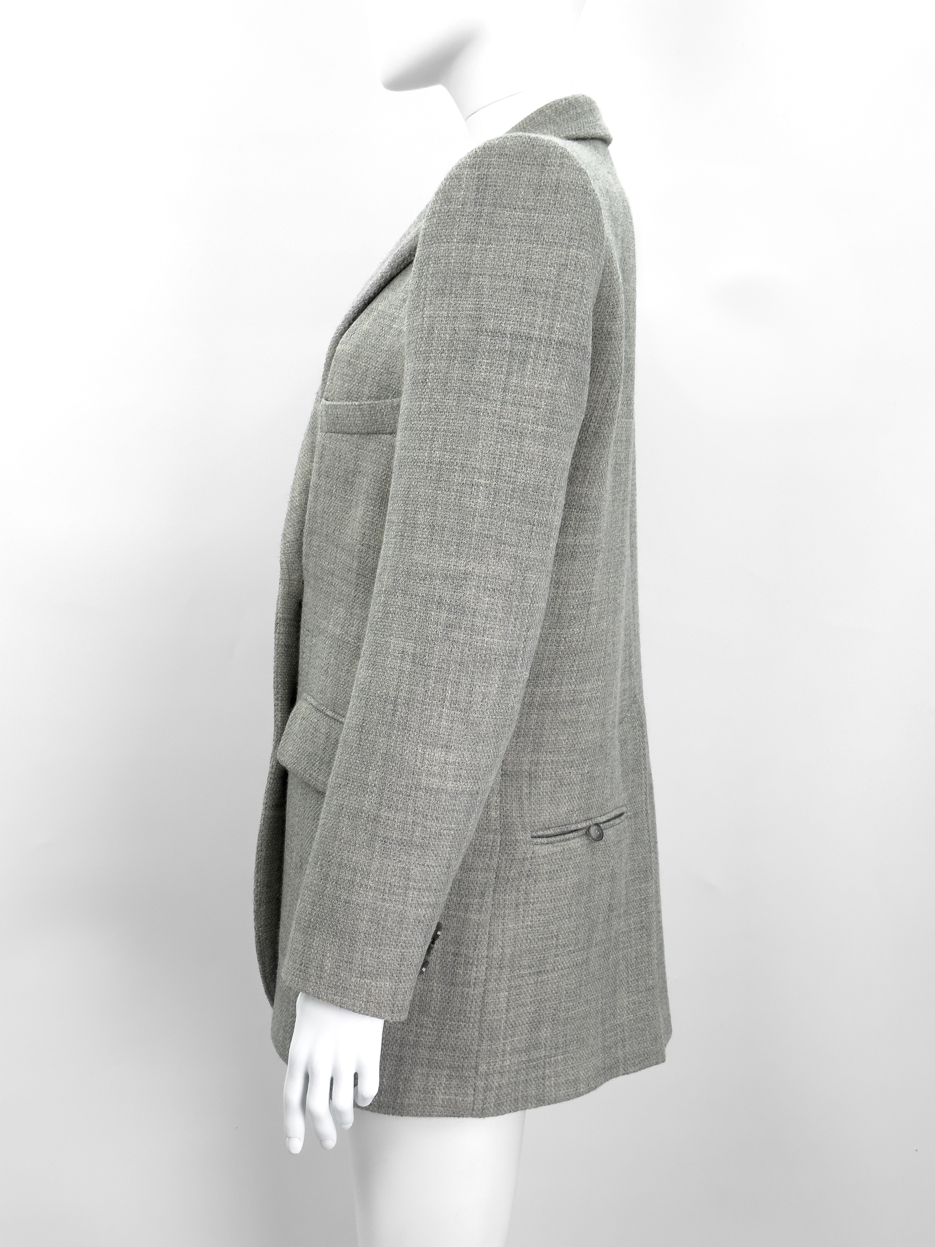 "Szara marynarka, prosty, dłuższy krój, oversize, duże poduszki na ramionach, zapinana na dwa logowane guzki, głęboki dekolt w szpic, szpiczasty kołnierz, proste rękawy, dwie kieszenie z klapami po bokach, mankiety ozdobione trzema guzikami, rozporek, imitacja kieszeni z tyłu, używana. Stan dobry, skulkowany materiał na podszewce. Rozmiar z metki 34. Skład: 82% wiskoza, 16% nylon, 2% elastan; podszewka: 58% wiskoza, 35% nylon, 10% jedwab. Wymiary: szerokość mierzona od pachy do pachy 54cm, długość całkowita 81cm."