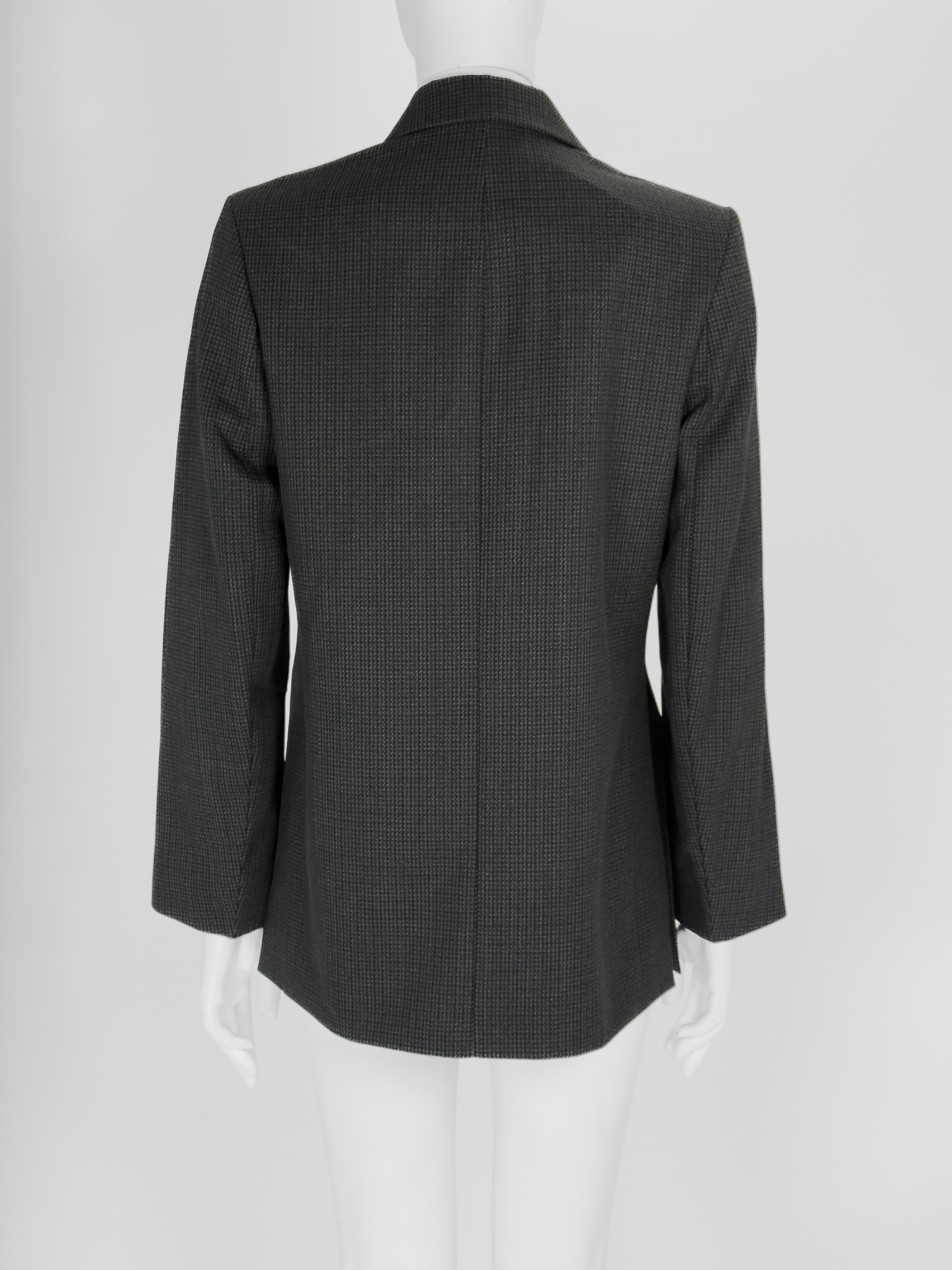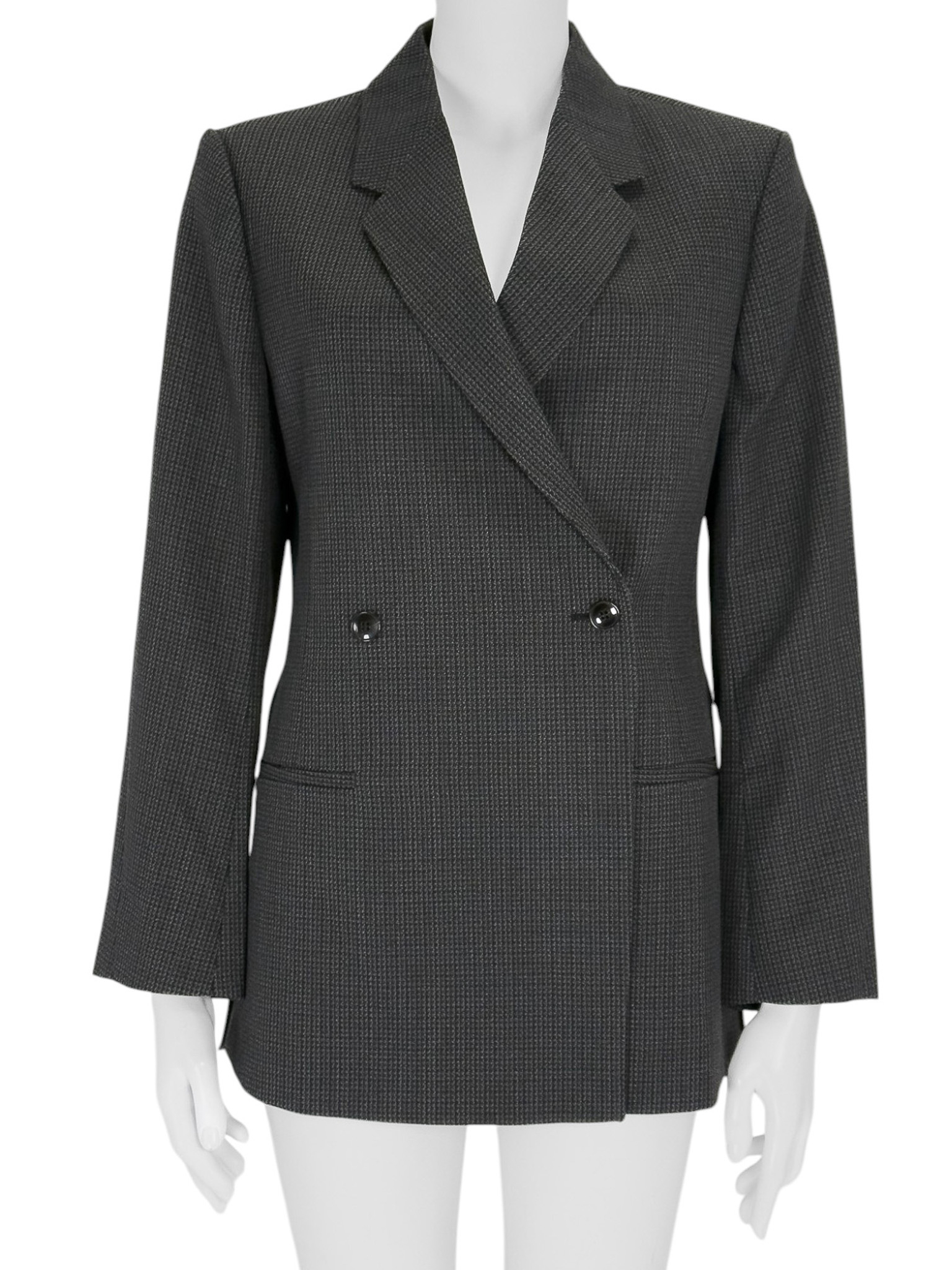 "Szaro-czarna wełniana marynarka w pepitkę, krój oversize, dekolt w serek, dwurzędowa, delikatne poduszki na ramionach, dwie kryte zaszyte kieszenie po bokach, dwa rozcięcia, czarna podszewka. Rozmiar z metki XXS. Skład: 100% wełna dziewicza; podszewka: 50% acetat, 50% wiskoza. Wymiary: szerokość mierzona od pachy do pachy 49cm, długość całkowita 73cm."