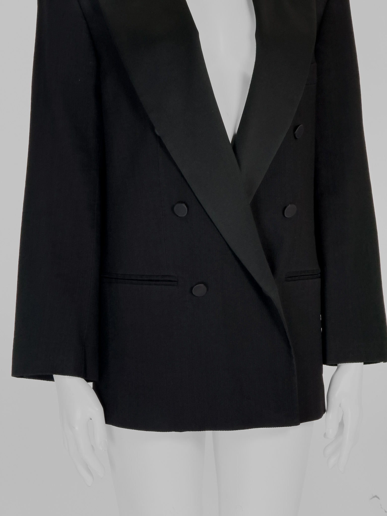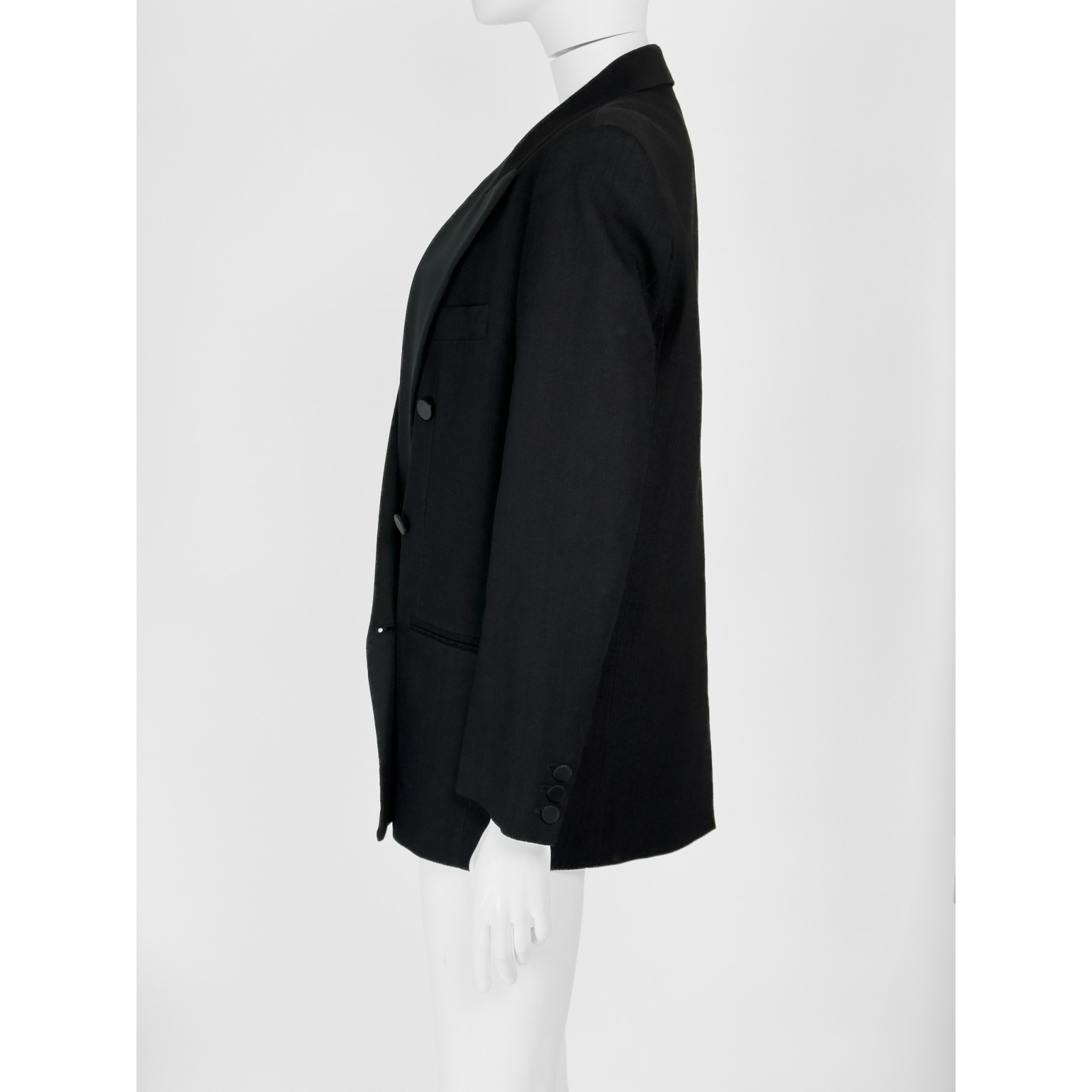 "Czarna dwurzędowa marynarka, szpiczaste satynowe klapy, poduszki na ramionach, prosty krój, głęboki dekolt w szpic, rozpinane mankiety, trzy zaszyte kieszenie na przodzie, rozporek, dwie kieszenie po wewnętrznej stronie, częściowa logowana czarna podszewka. Rozmiar z metki EU 40. Skład: 48% wiskoza, 48% ramia, 4% elastan; 100% poliester, podszewka: 100% cupro. Wymiary: szerokość mierzona od pachy do pachy 51cm, długość całkowita 72cm."