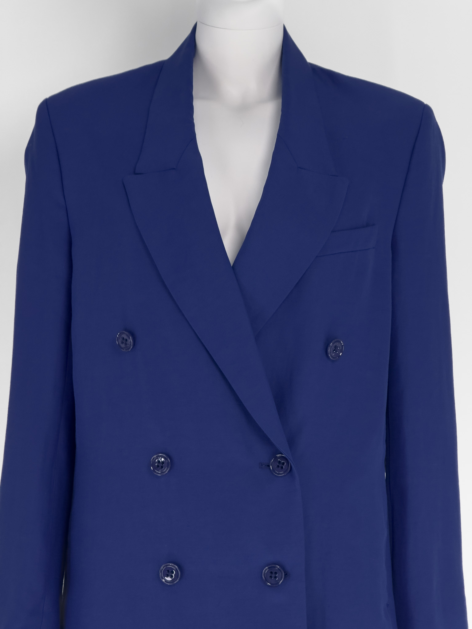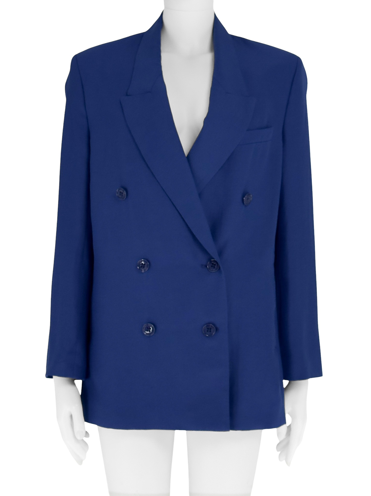 "Kobaltowa dwurzędowa marynarka, zapinana na granatowe guziki, prosty krój, częściowa podszewka w górnej części oraz w rękawach, dwie kryte kieszenie po bokach, poduszki na ramionach. Brak metki z rozmiarem oraz składem. Rozmiarowo wypada jak L. Wymiary: szerokość mierzona od pachy do pachy 52cm, długość całkowita 73cm."