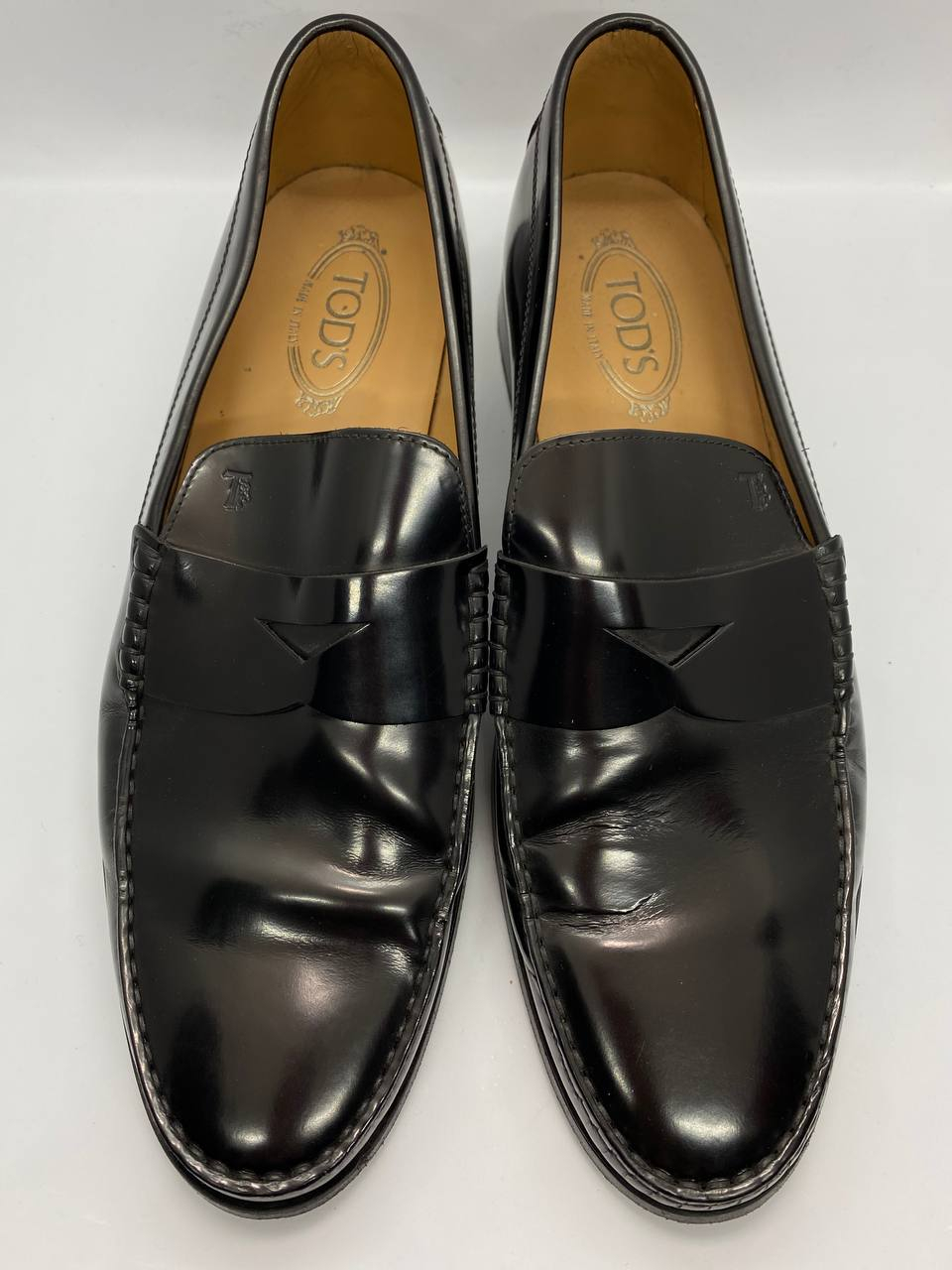 "Czarne lakierowane mokasyny marki Tod's, rozmiar 11,5. Stan bardzo dobry. Jedyne ślady użytkowania to zagięcia oraz starta podeszwa. W zestawie worki przeciwkurzowe."