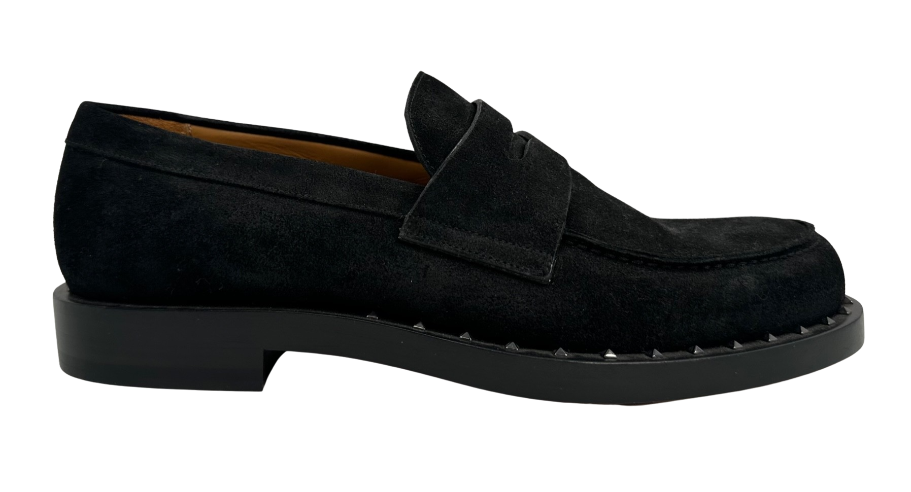 "zamszowe mokasyny ozdobione drobnymi ćwiekami przy podeszwie, wsuwane, stan idealny. Rozmiar 42,5."