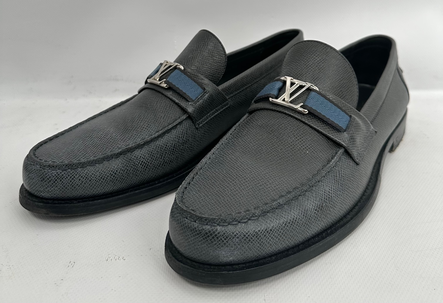 "mokasyny grafitowe skórzane, niebieski pasek z srebrnym logo na przodzie. Rozmiar 9. Podzelowane. Worki przeciwkurzowe w komplecie."