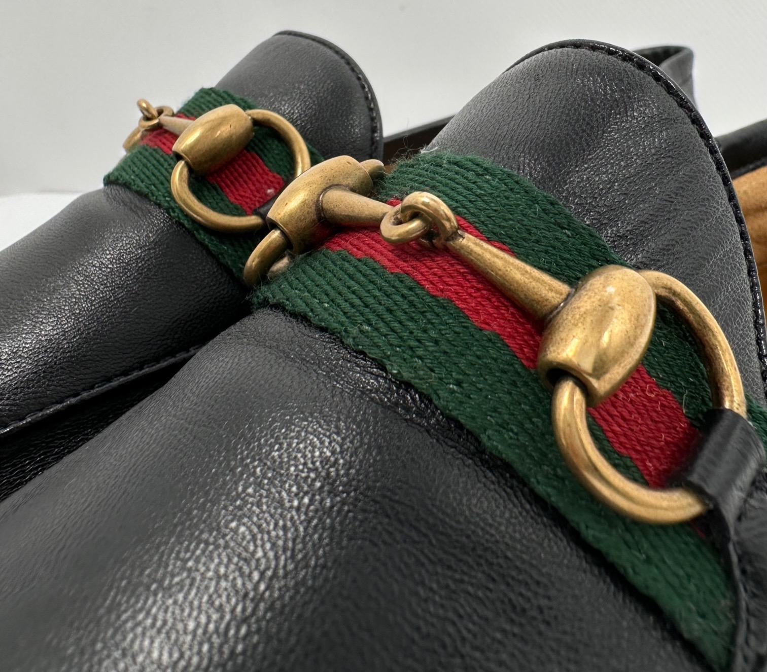 "Czarne skórzane mokasyny, wsuwane, zaokrąglone noski, zielono czerwona taśma oraz złote wędzidło na przodzie, niski obcas, używane. Stan bardzo dobry. Rozmiar 8."