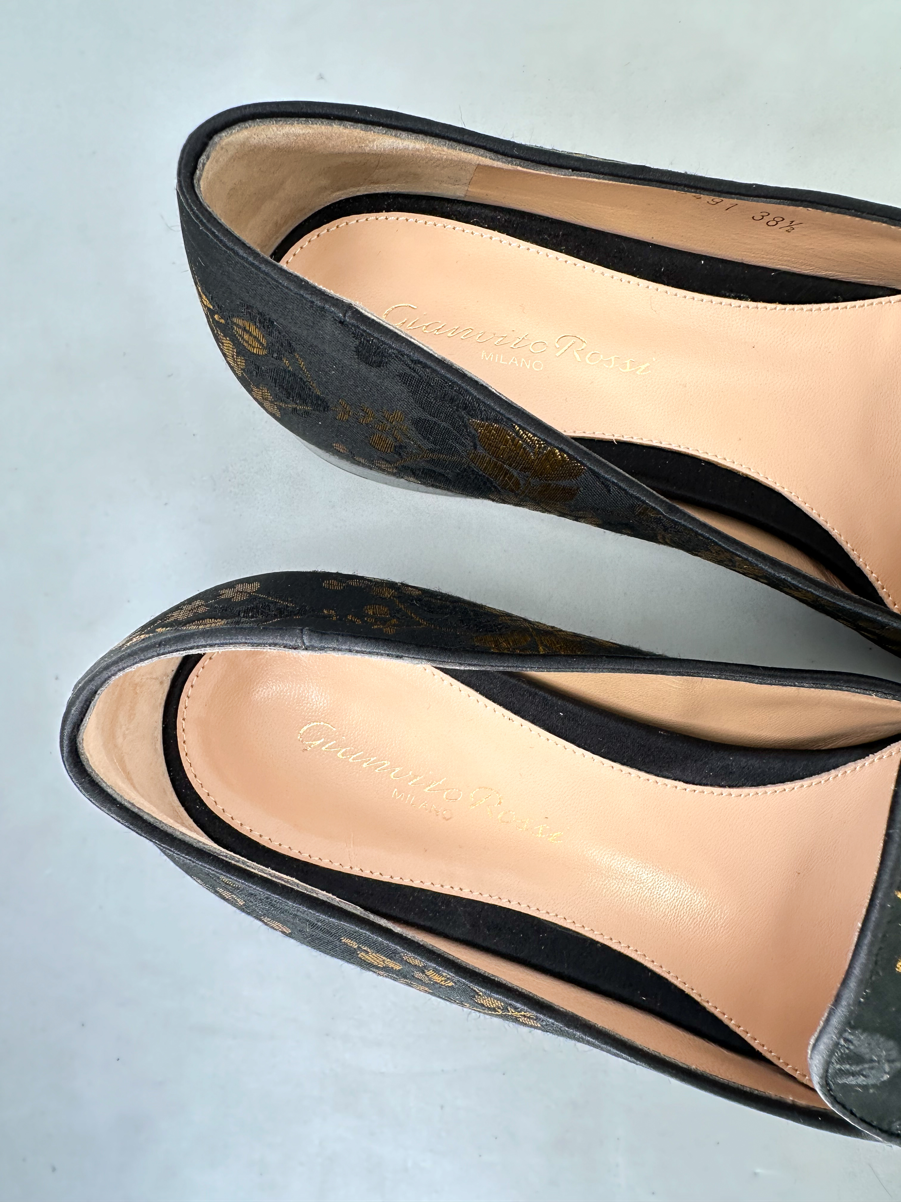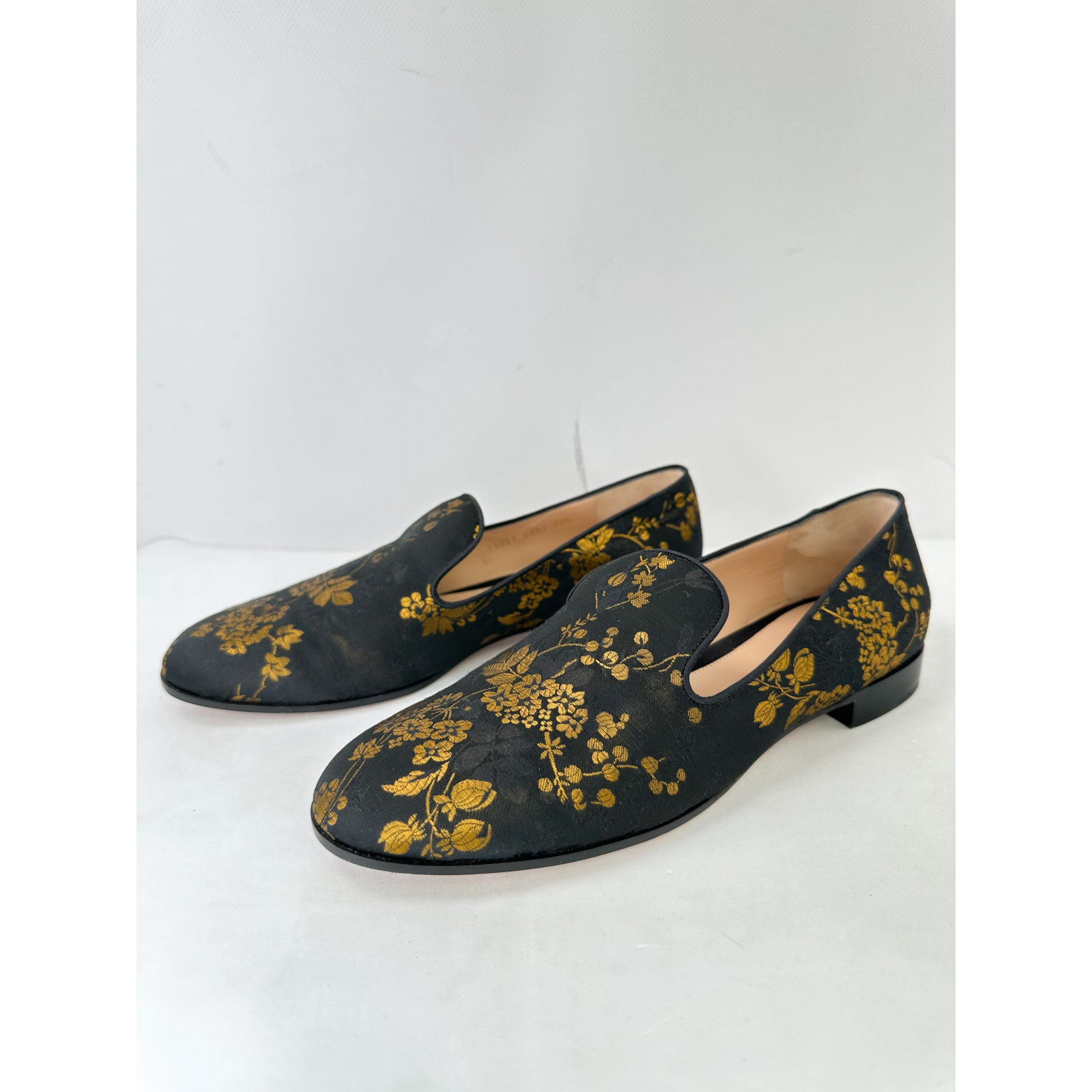 "Czarne mokasyny w złoto-czarny kwiatowy wzór, zaokrąglone noski, wycięcia po bokach, cieliste skórzane wnętrze, niski obcas, w zestawie z pudełkiem oraz workiem przeciwkurzowym, używane. Stan bardzo dobry, delikatnie wytarte noski oraz podeszwa. Rozmiar 38,5."