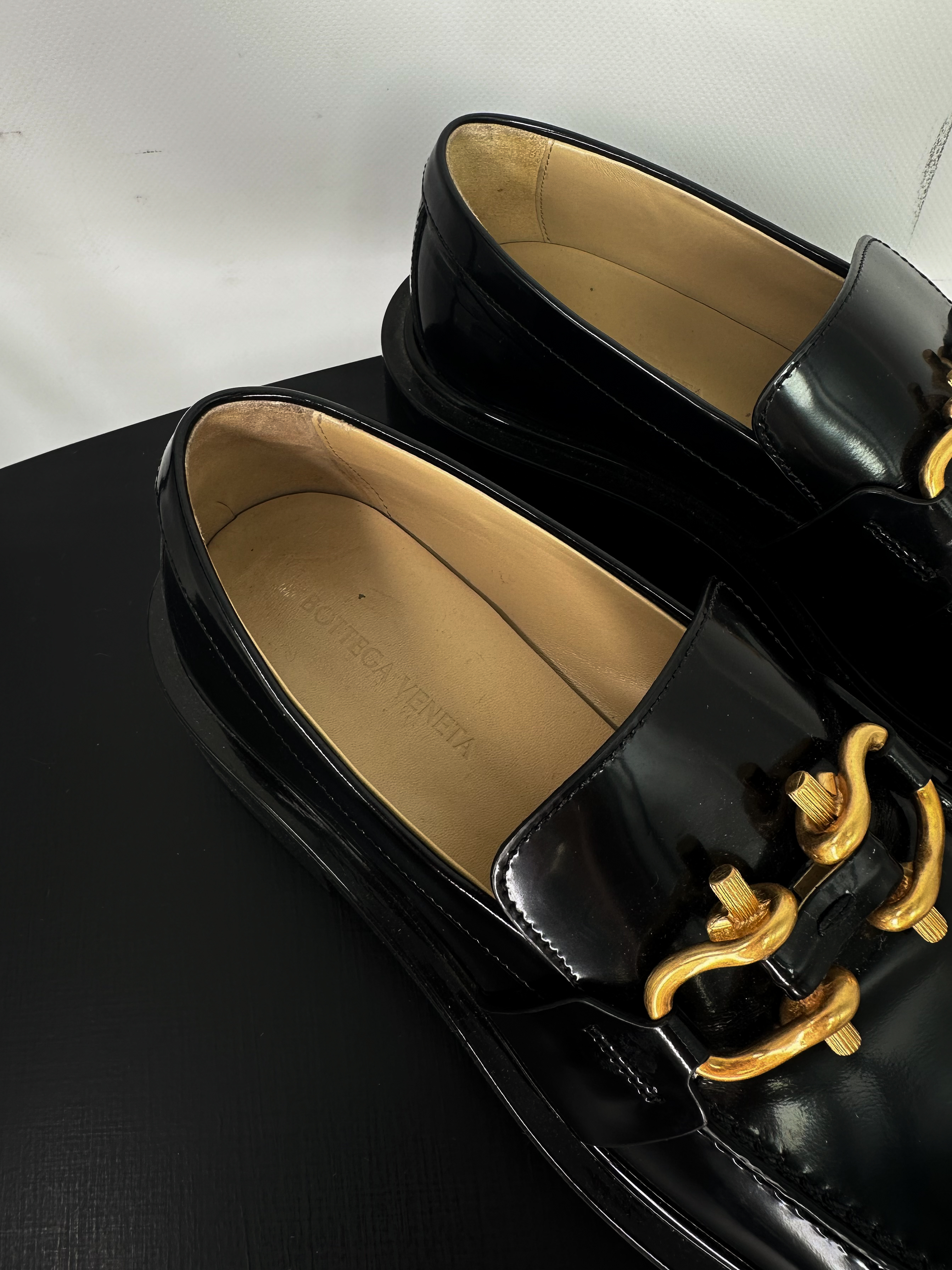 "Czarne mokasyny wykonane z lakierowanej skóry, gumowa podeszwa, ścięte noski, obcas klocek, złota matowa ozdoba w przedniej części, wsuwane, wycięcia po bokach, w zestawie z pudełkiem oraz workami przeciwkurzowymi, używane. Stan nowe, jedynie przymierzane. Rozmiar 41."