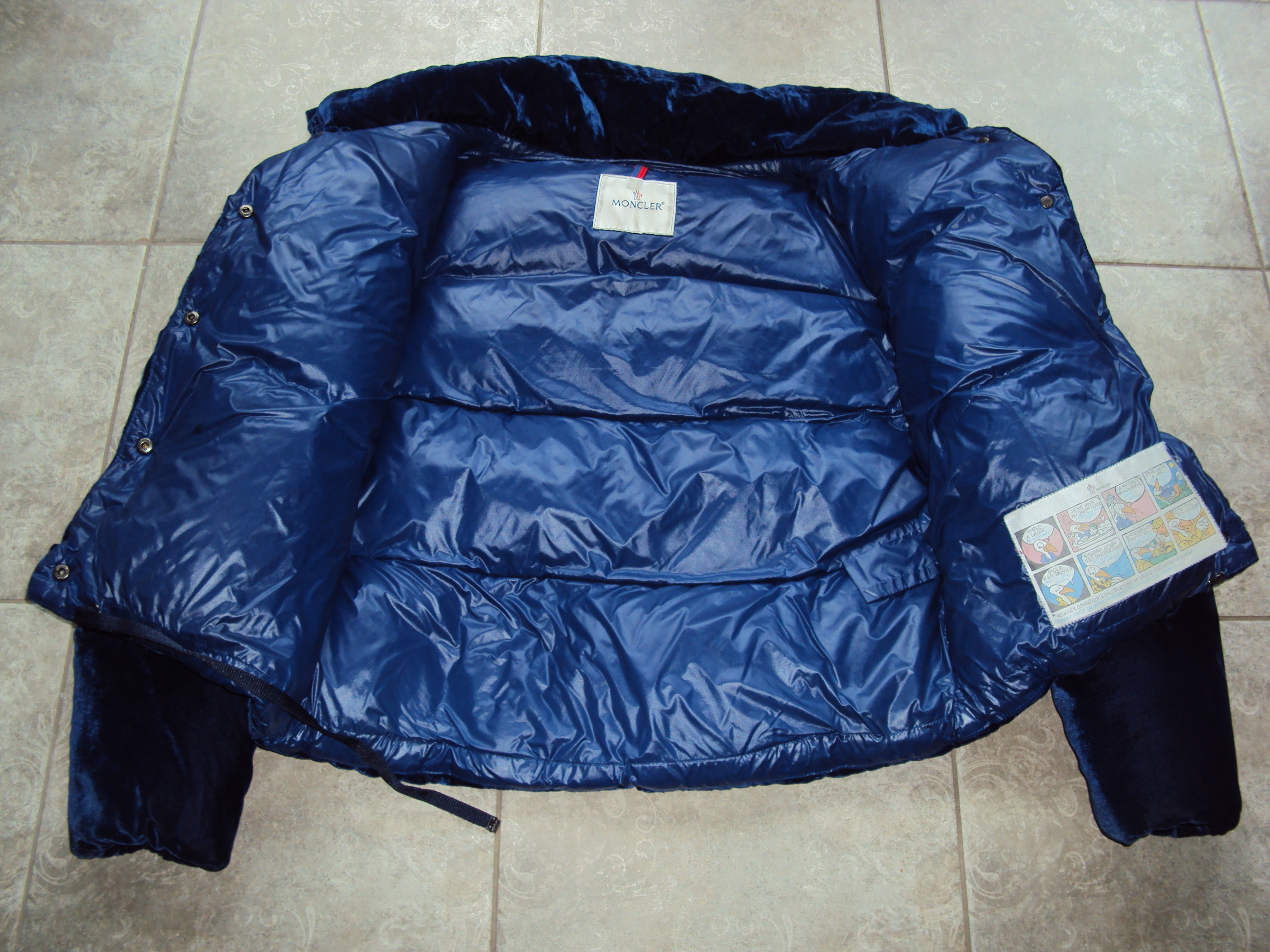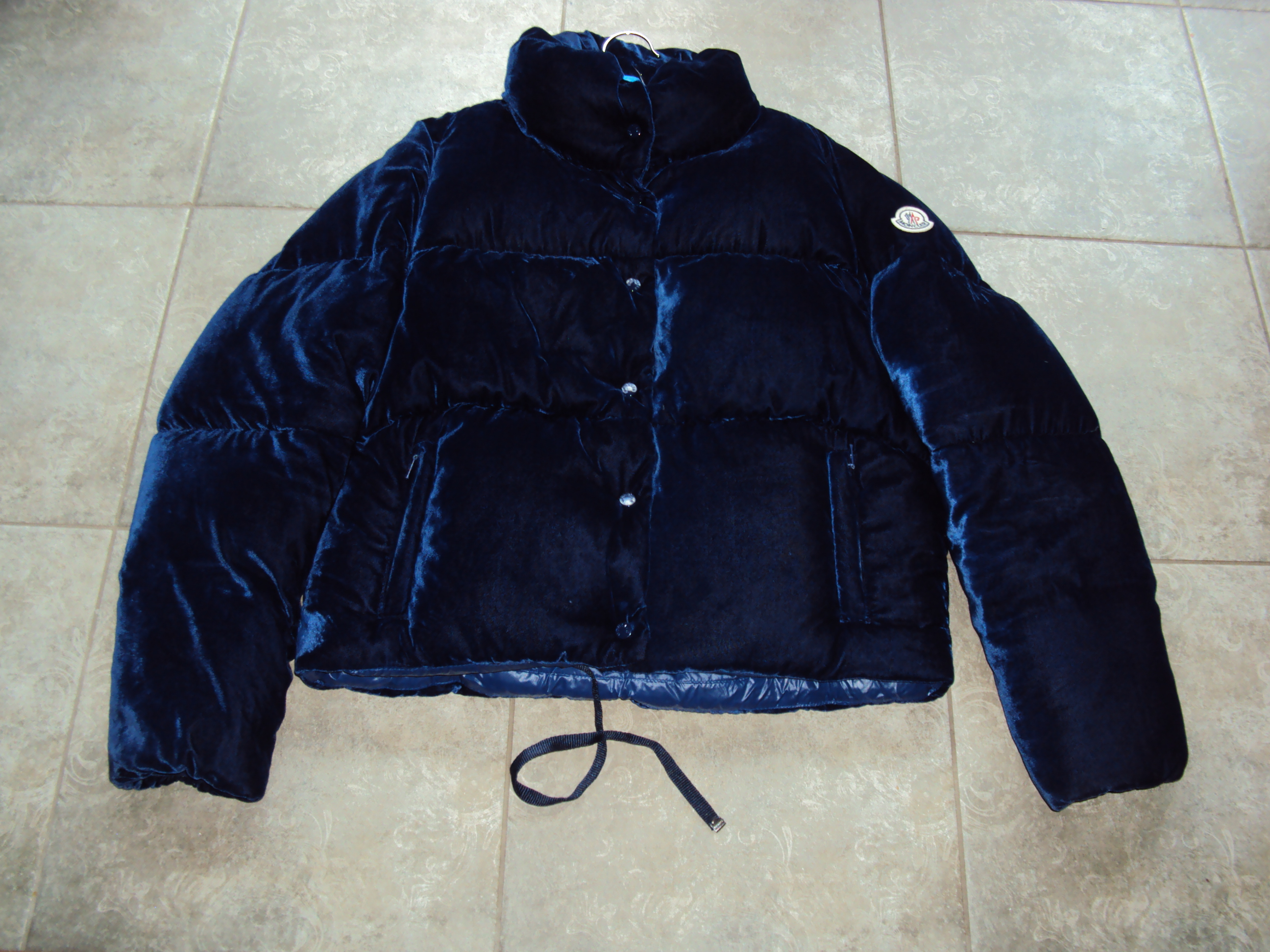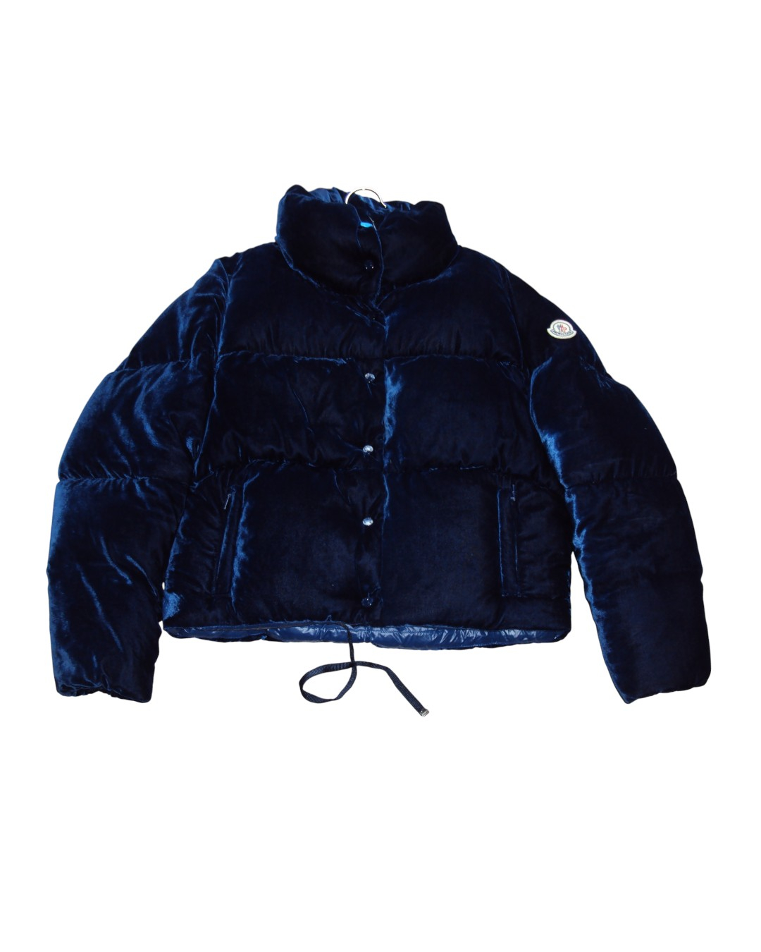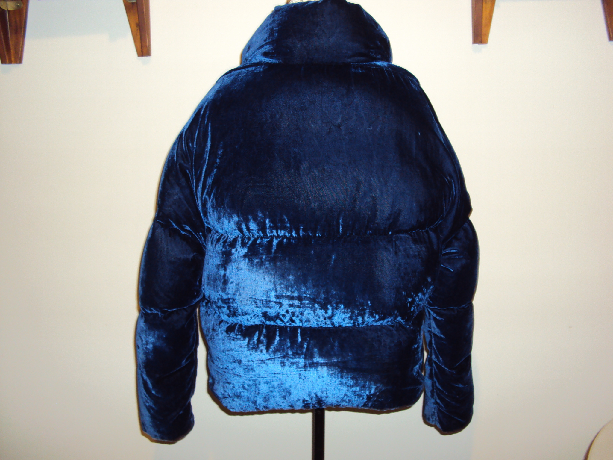 "Kurtka puchowa z weluru w kolorze kobaltowym, zapinana na logowane napy i wiązana na dole troczkiem.Ma obszerną stójkę i kieszenie z boku na zamek.