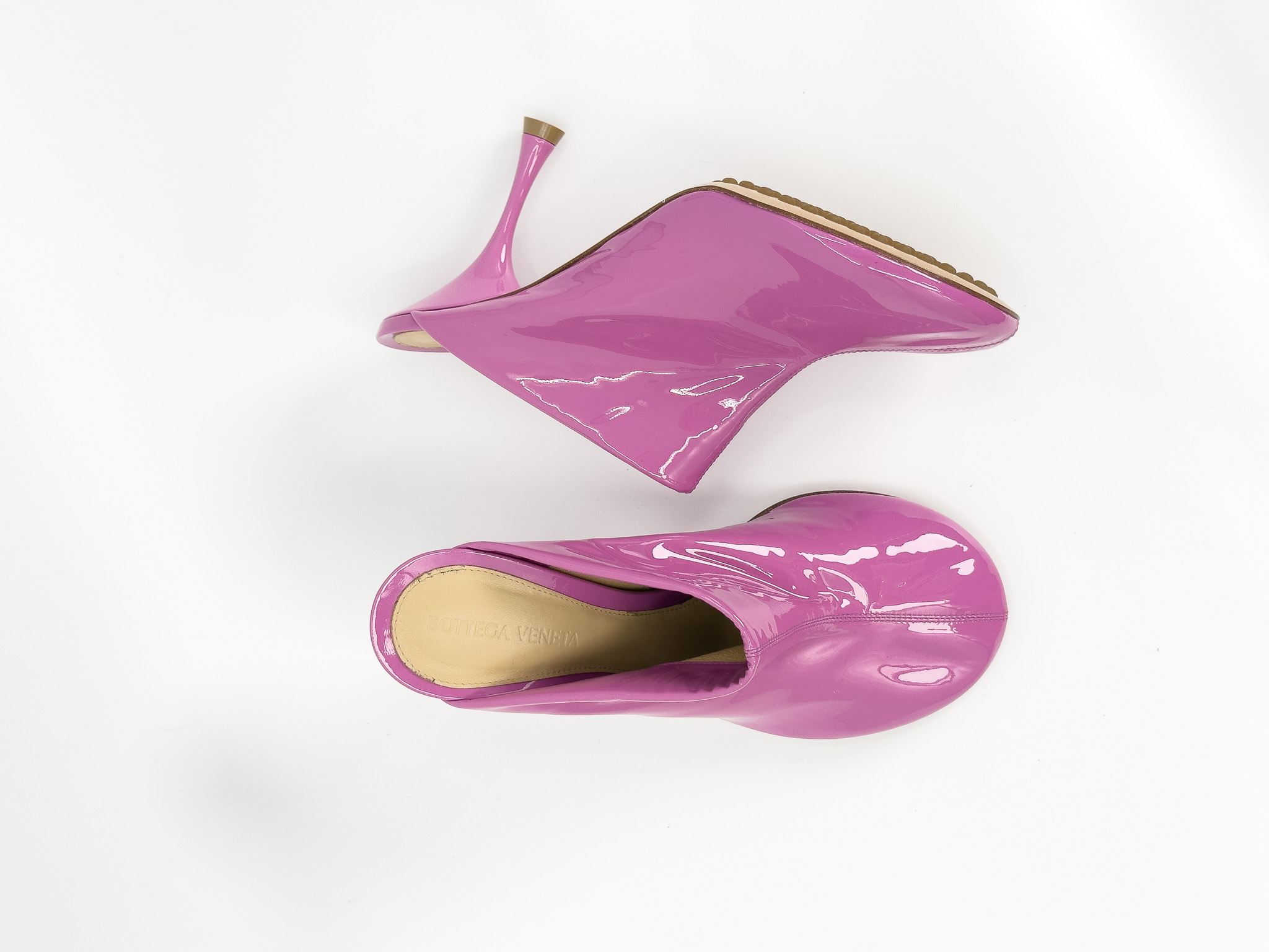 "Różowe mule wykonane z lakierowanej skóry, kielichowy obcas, zaokrąglone noski, wsuwane, cielista skórzana wkładka, w zestawie z workiem przeciwkurzowym. Stan idealny. Rozmiar 37,5."