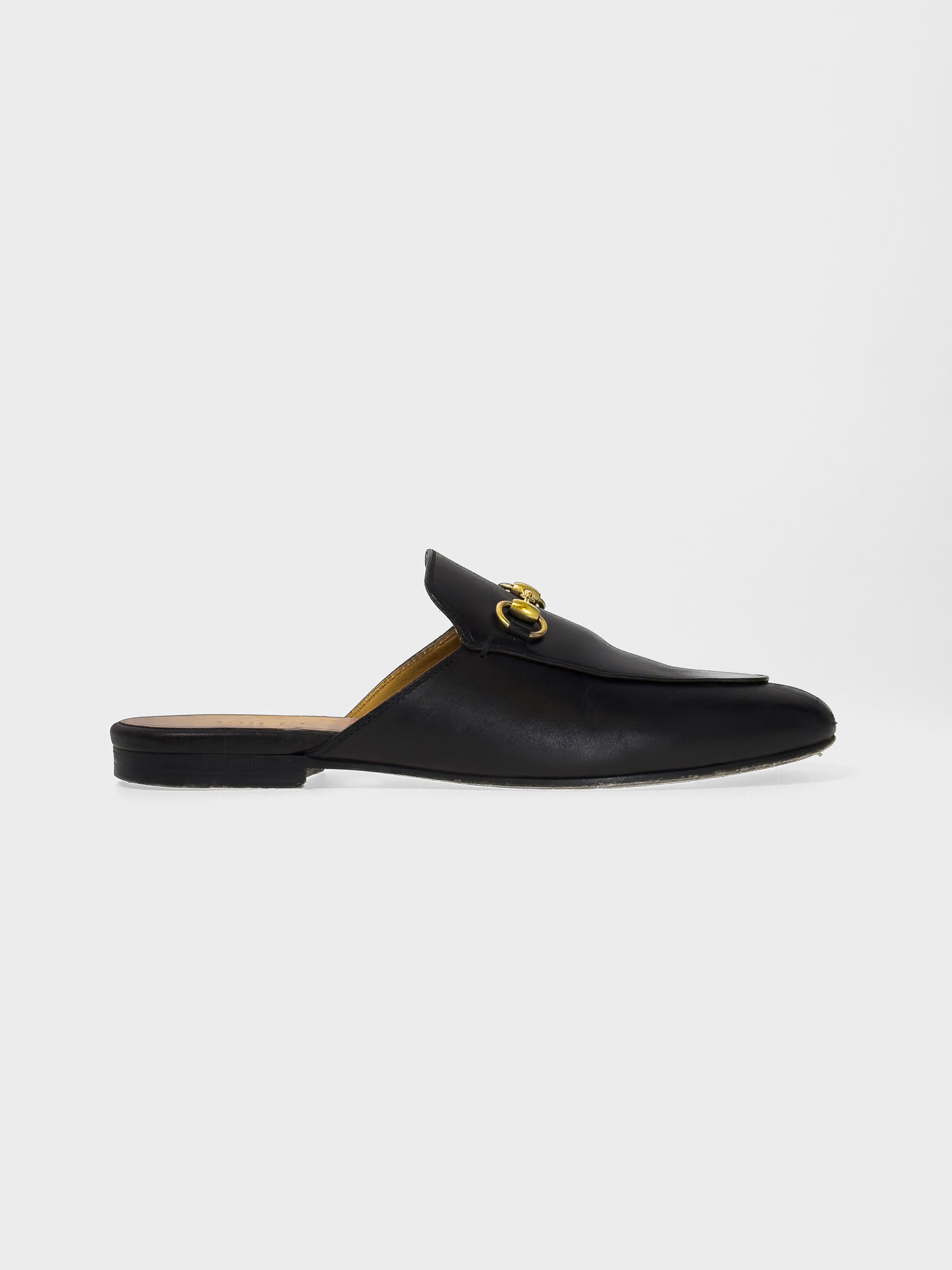 "Czarne skórzane mule ozdobione złotym wędzidłem na przodzie w charakterystycznym dla marki kształcie, wsuwane, migdałowe noski, niski obcas, cieliste skórzane wnętrze, w zestawie z dowodem zakupu oraz pudełkiem, używane. Stan dobry, przetarcia na podeszwie, marszczenia na skórze, zadrapanie na prawym nosku, Rozmiar 37,5."