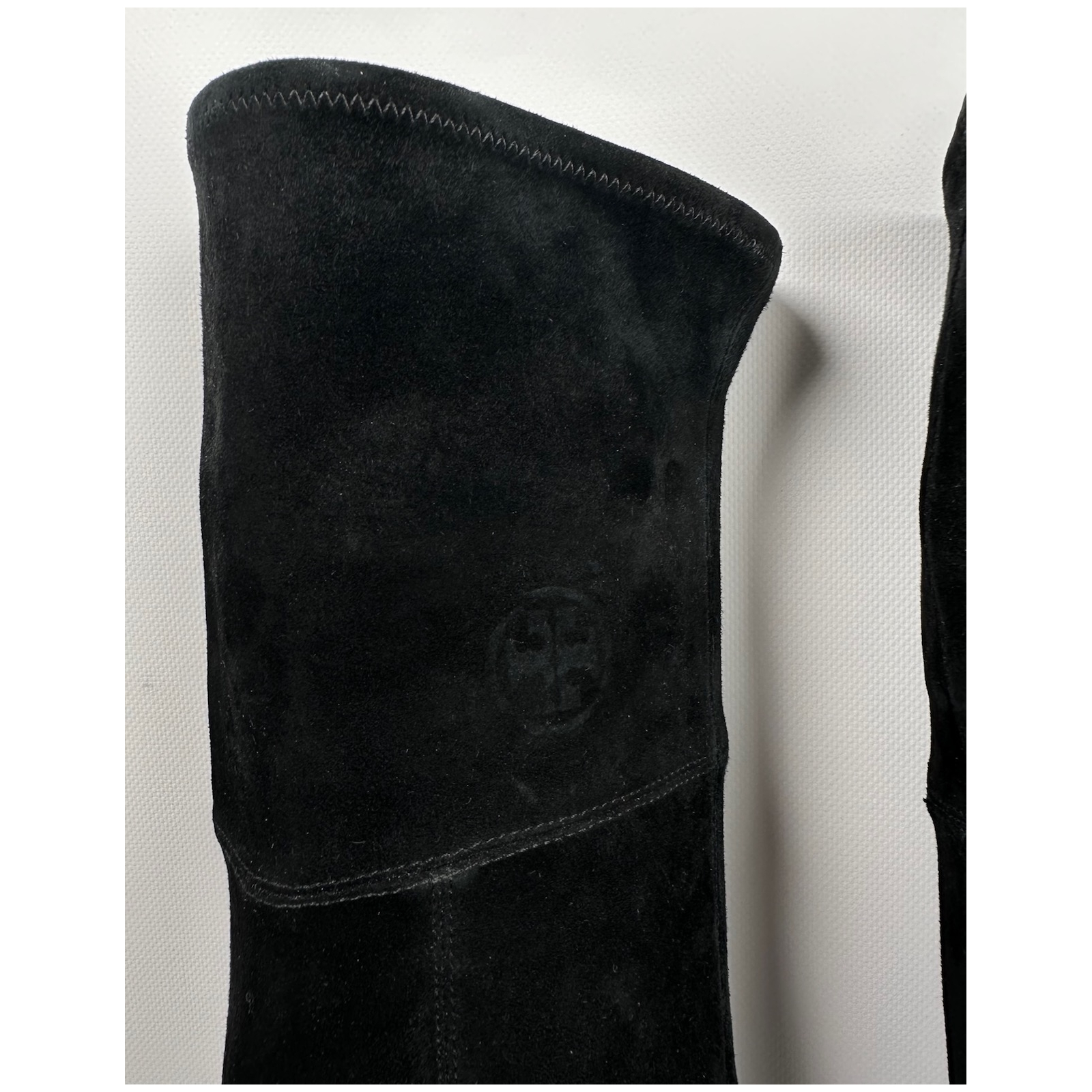 "Wysokie muszkieterki z czarnego zamszu. Sięgają za kolano, mają niewysoki obcas typu słupek, tłoczone logowanie z boku buta oraz wiązanie na cienką kokardkę z rzemienia na linii kostki. Dodatkową ich ozdobą jest delikatne stębnowanie. Przy wzuwaniu ich na nogę pomocny jest umiejscowiony z boku buta czarny suwak z metalowym zamkiem w kolorze złotym. Stan: dobry, widoczne niewielkie przetarcia zamszu na dole cholewki. Rozmiar: 37. Dł. wkładki: 23,5 cm. Skład: cholewka: 100% naturalna skóra zamszowa, podeszwa: materiał syntetyczny. Wys. obcasa: 4,5 cm. W zestawie z oryginalnym pudełkiem."