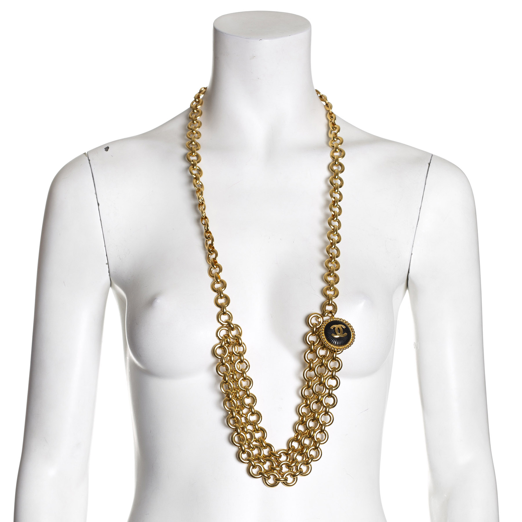 "Naszyjnik/Pasek Chanel Haute Couture Vintage pozlacany z lat 70.Pochodzi z czasow Coco Chanel z butiku Rue Cambon w Paryzu. wyjatkowa bizuteria kolekcjonerska , ogniwa po zewnwtrznej stonie 1,5 cm , brelok 3,3 cm dlugosc paska 95 cm .Stan Doskonaly."