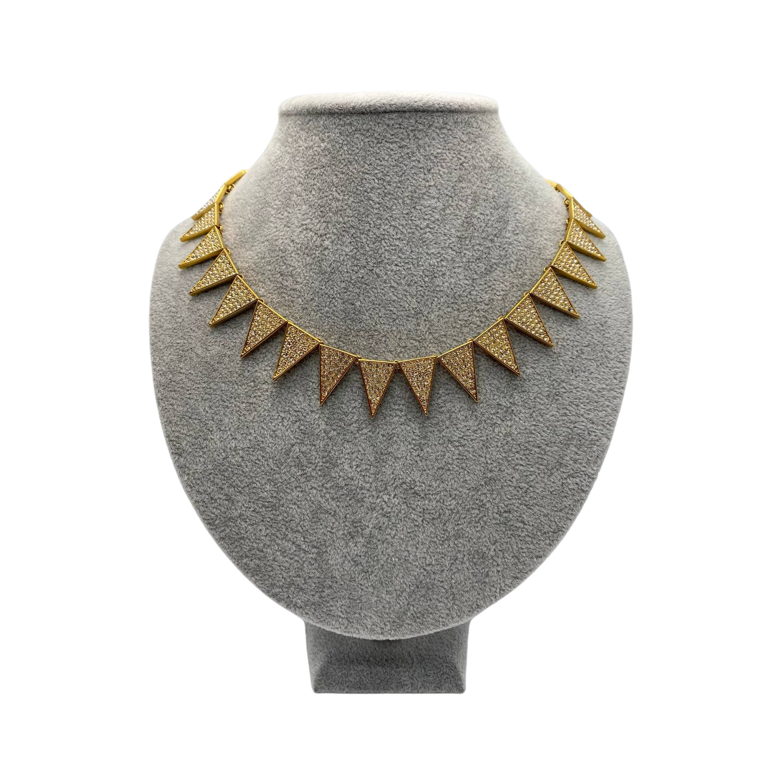 "złoty zapinany naszyjnik złożony z trójkątów, wysadzany w cyrkonie"