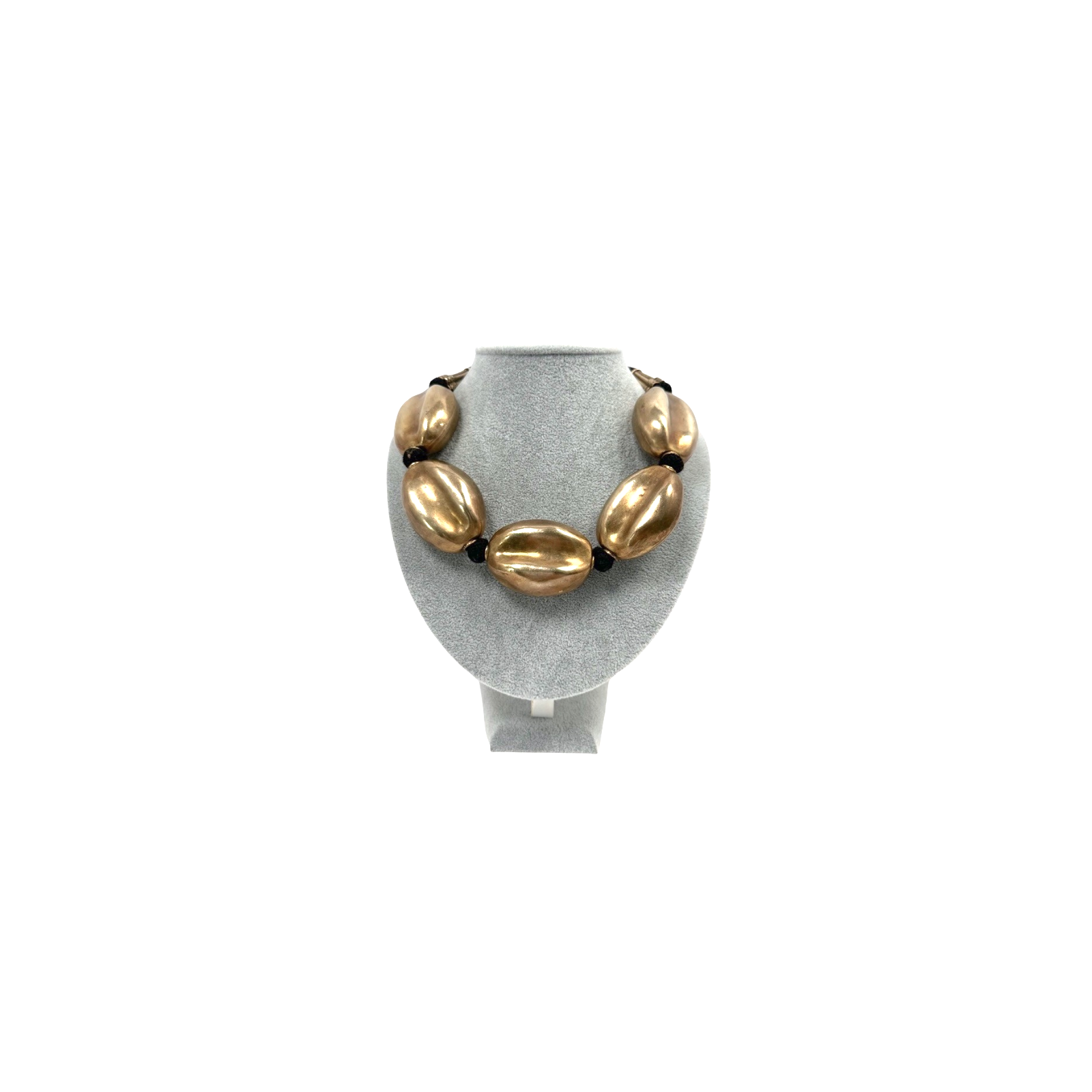 "naszyjnik ze złotymi elementami w kształcie ziaren kawy, z czarnymi rzemykami."