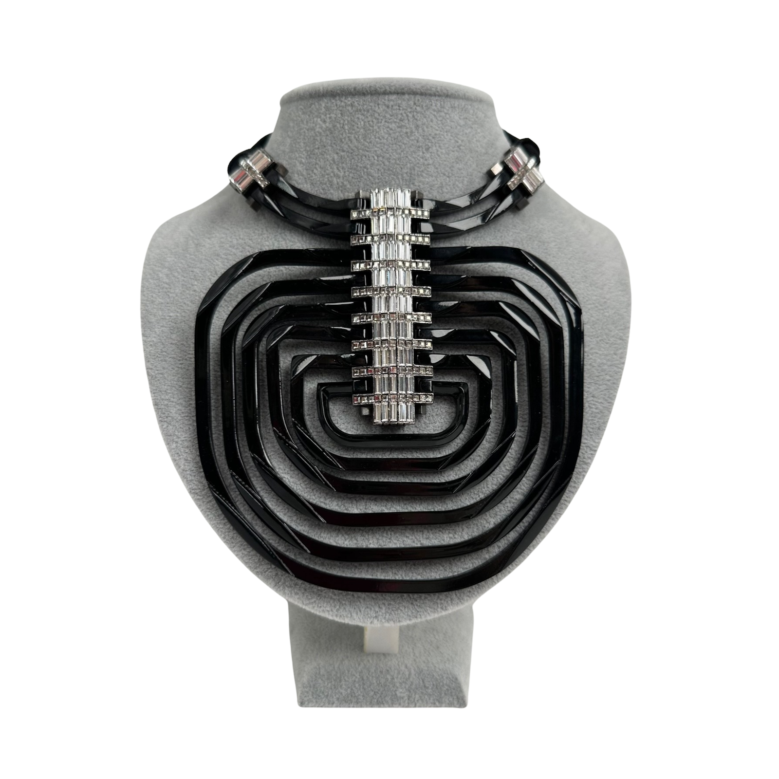 "Duży czarny naszyjnik ozdobiony cyrkoniami, zawiązywany na czarne wstążki."