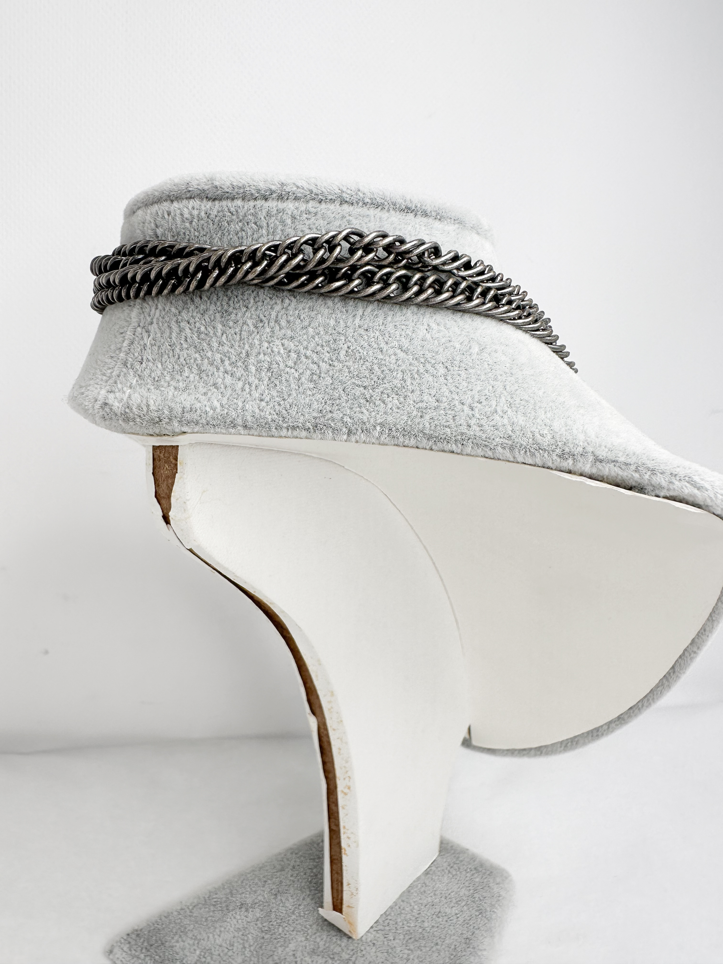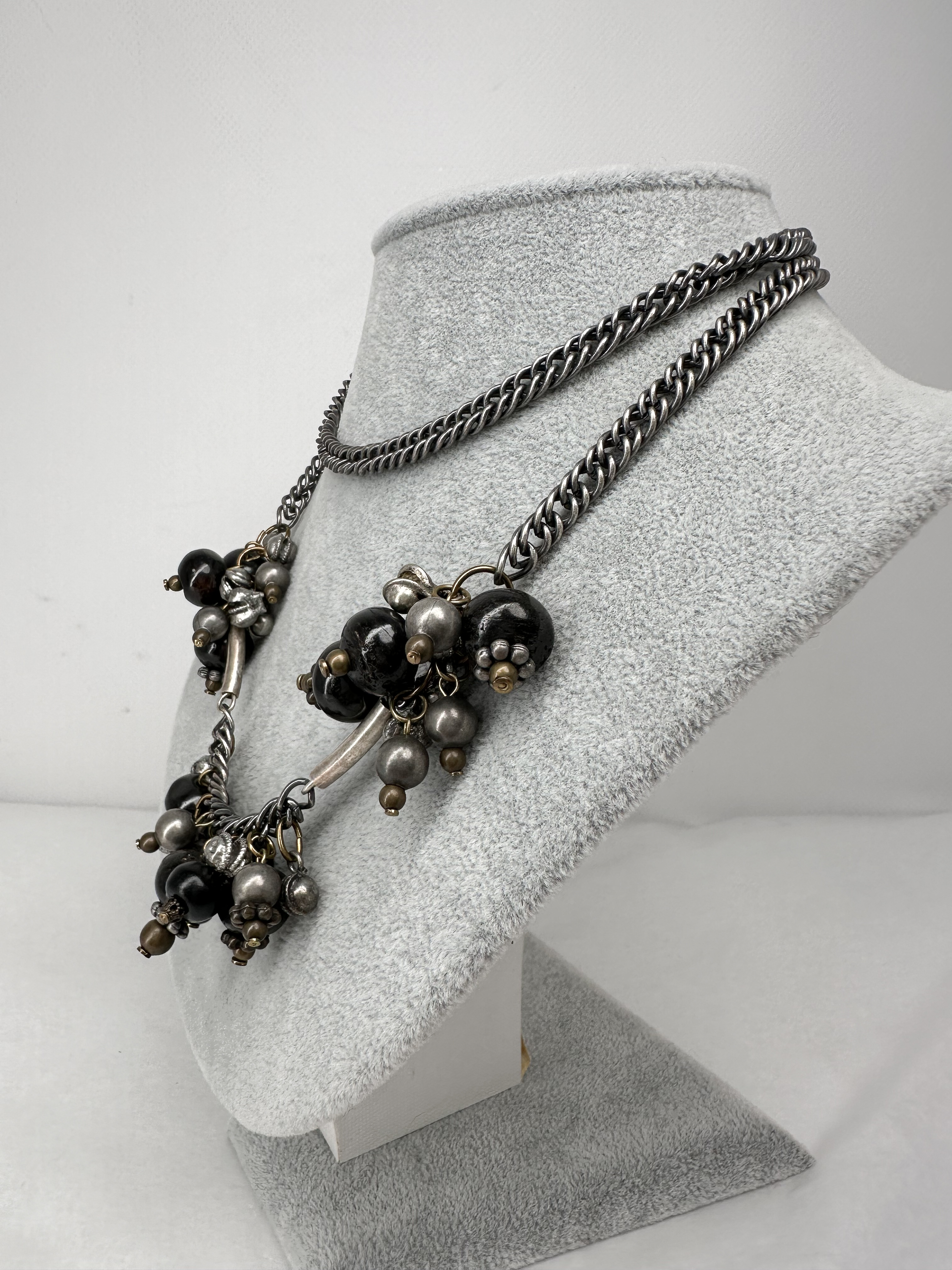 "Metalowy łańcuch z zawieszkami w kształcie koralików, czarnych srebrnych i złotych."