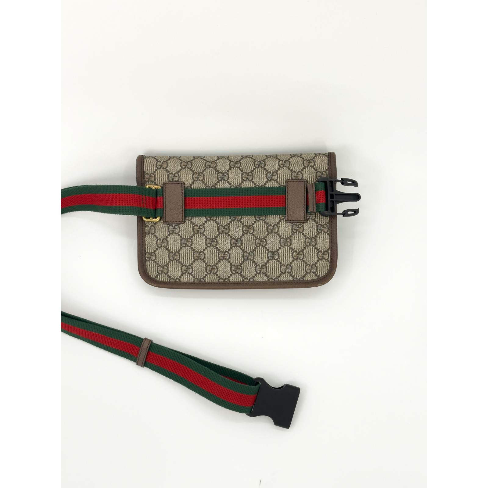 "Torebka do noszenia w talii/nerka , brązowa - logowana z materiałowym ciemnozielono - czerwonym paskiem, brązowe skórzane elementy. Używana stan bardzo dobry, delikatnie przetarte rogi. Worek przeciwkurzowy w komplecie. Wymiary: szerokość 25cm, wysokość 18cm."