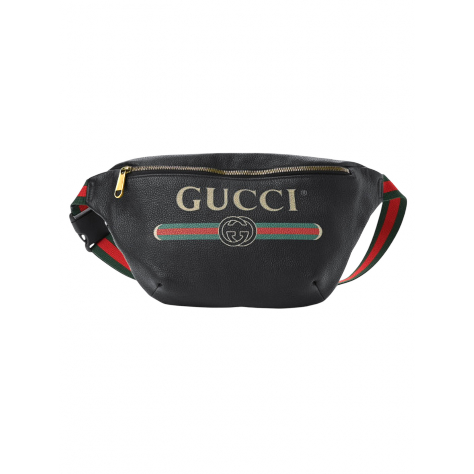 "Czarna skórzana nerka, groszkowa skóra, logo marki w centralnej części, zielono-czerwony materiałowy regulowany pasek wykończony plastikową klamrą, zapinana na złoty logowany suwak, beżowe materiałowe wnętrze. Stan bardzo dobry. Wymiary: szerokość 35cm, wysokość 19cm."