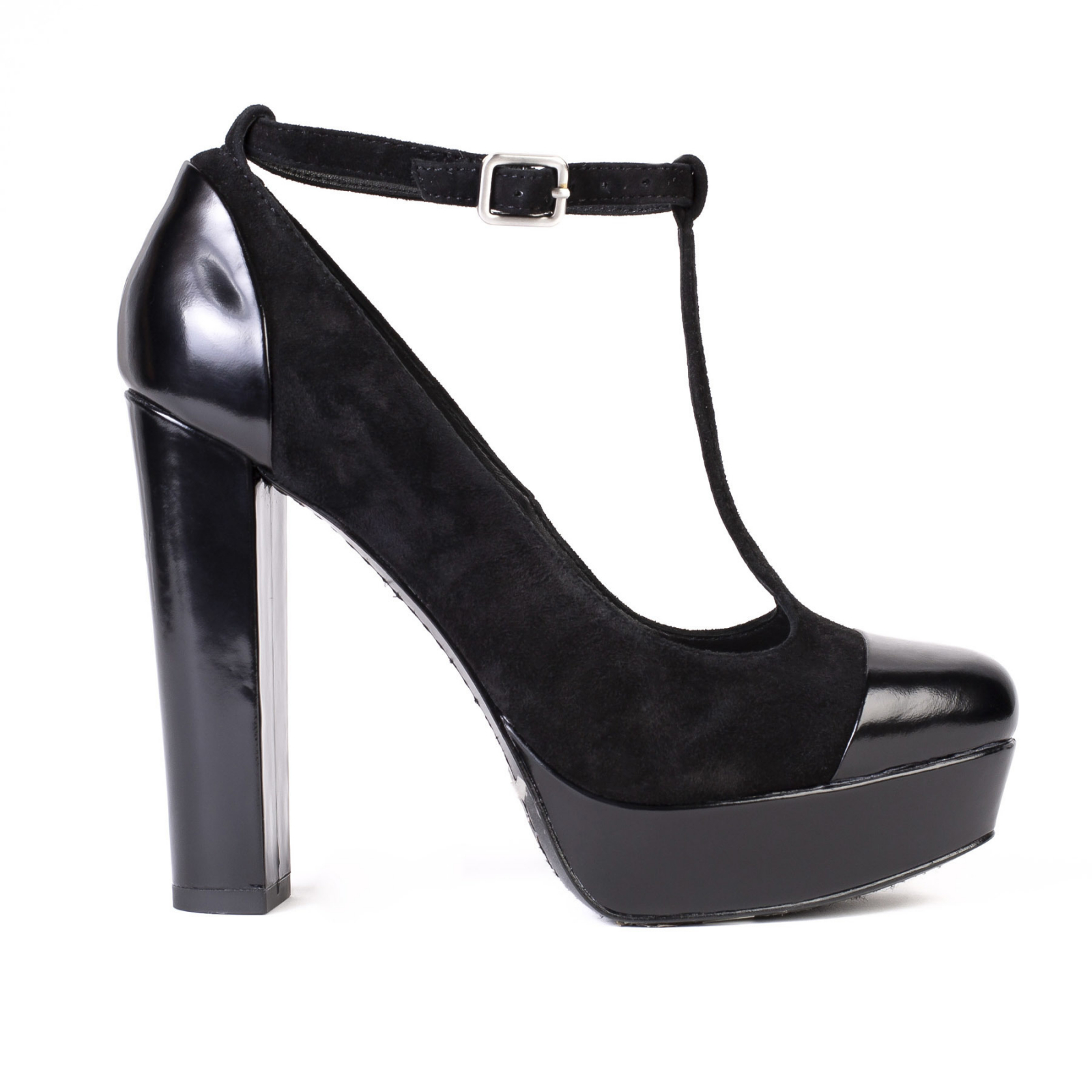 "Czarne buty na obcasie , zapinane w kostce. Wykonane z połączenia zamszu i skóry. Rozmiar 36"