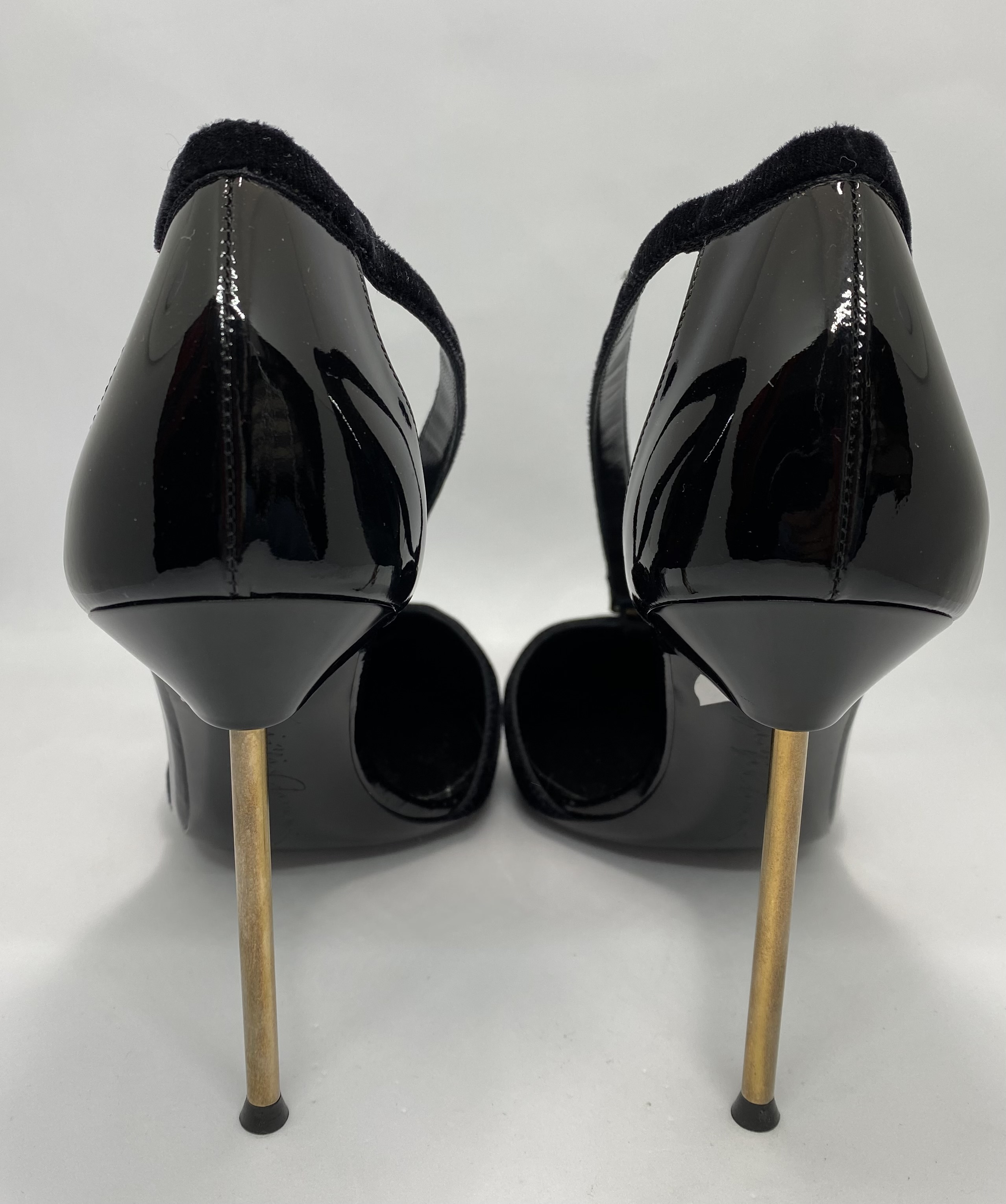 "obcasy w szpic, lakierowane z welurowymi paseczkami na przodzie oraz prostokątnął klamerką wysadzaną cyrkoniami. Rozmiar 39. Nowe."