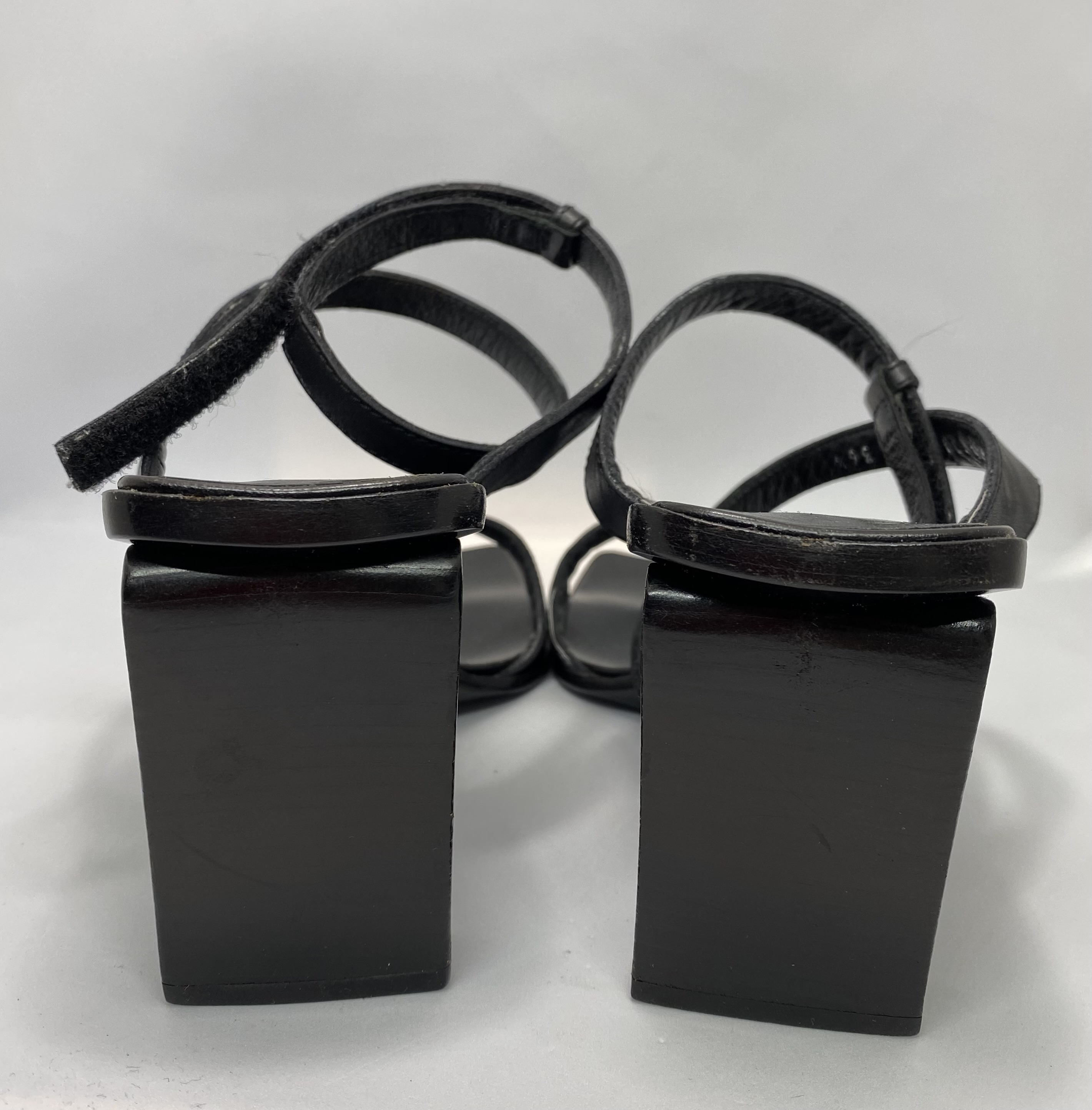 "czarne sandałki na kwadratowym obcasie, kwadratowe noski, japonki, zapinane wokół kostki, rozmiar 36,5"