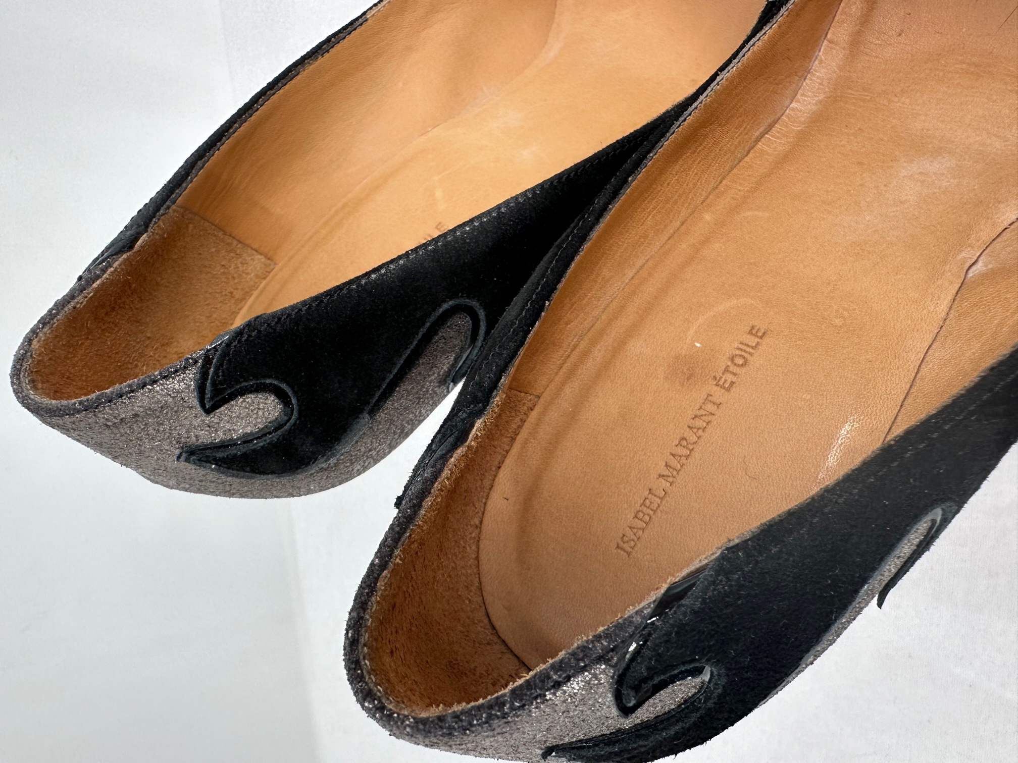 "czarne zamszowe szpilki, obcas i pięta srebrne, brokatowe, nosek w szpic, używane przetarcia na podeszwie. Rozmiar 37. wys. obcasa 10,5 cm. Isabel Marant Étoile"